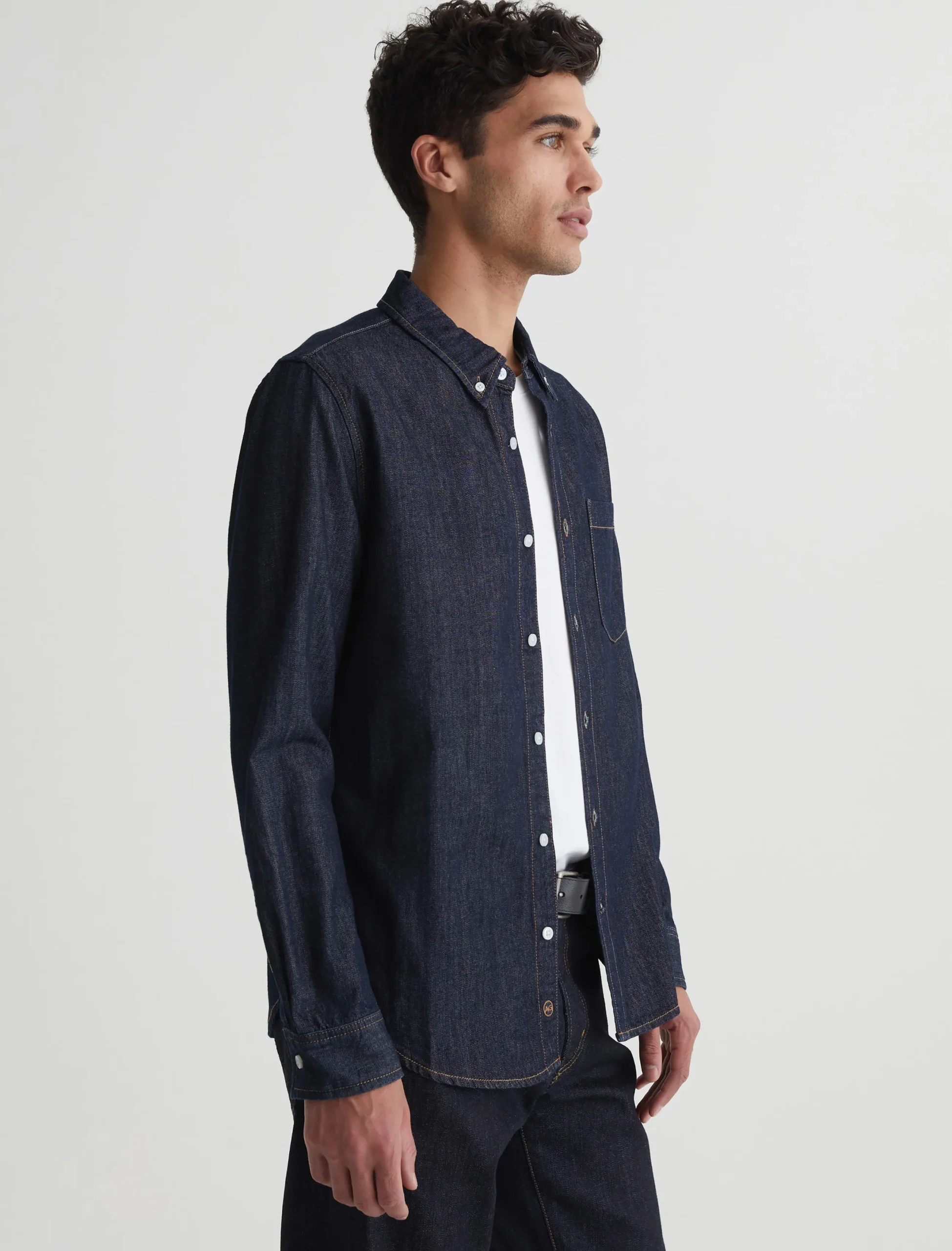The Aiden Classic Shirt for men features a dark denim wash. The Aiden Classic Shirt features a single front chest pocket, gentle fading, and white buttons, designed in a comfortable and lightweight Cove Denim.