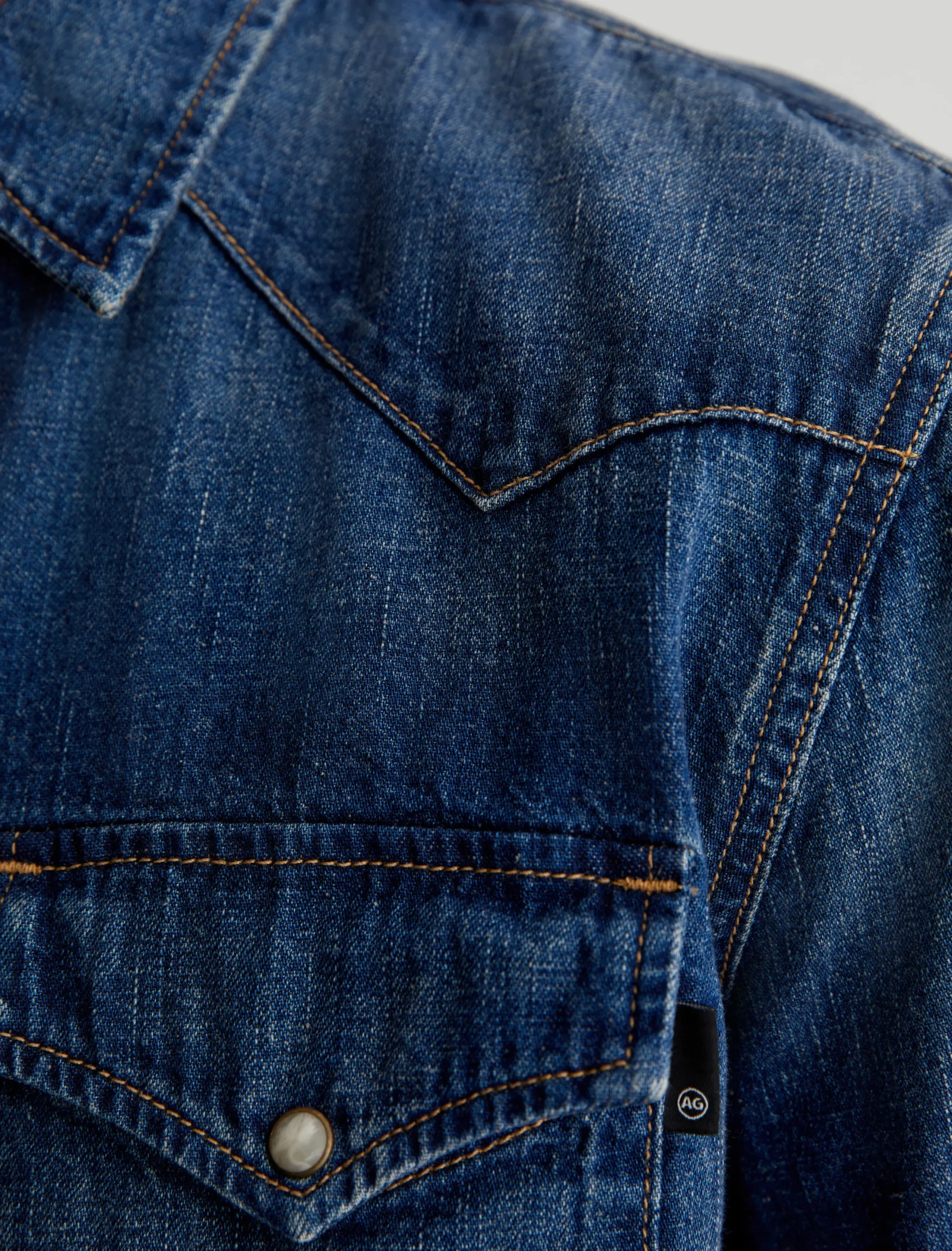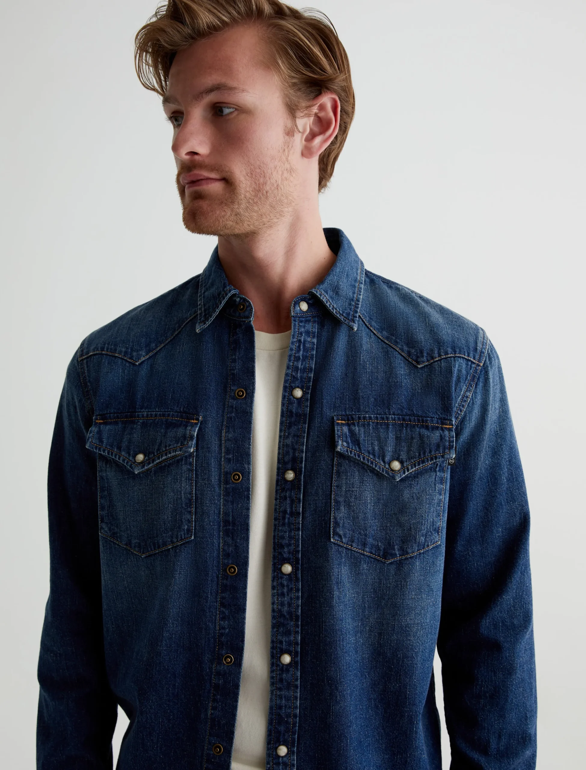 The Aiden Western Shirt for men offers a modern take on vintage Americana style. Made from 100% cotton in a faded indigo wash, this classic denim shirt has angled shoulder panels, flap pockets at the chest, and snap buttons throughout.