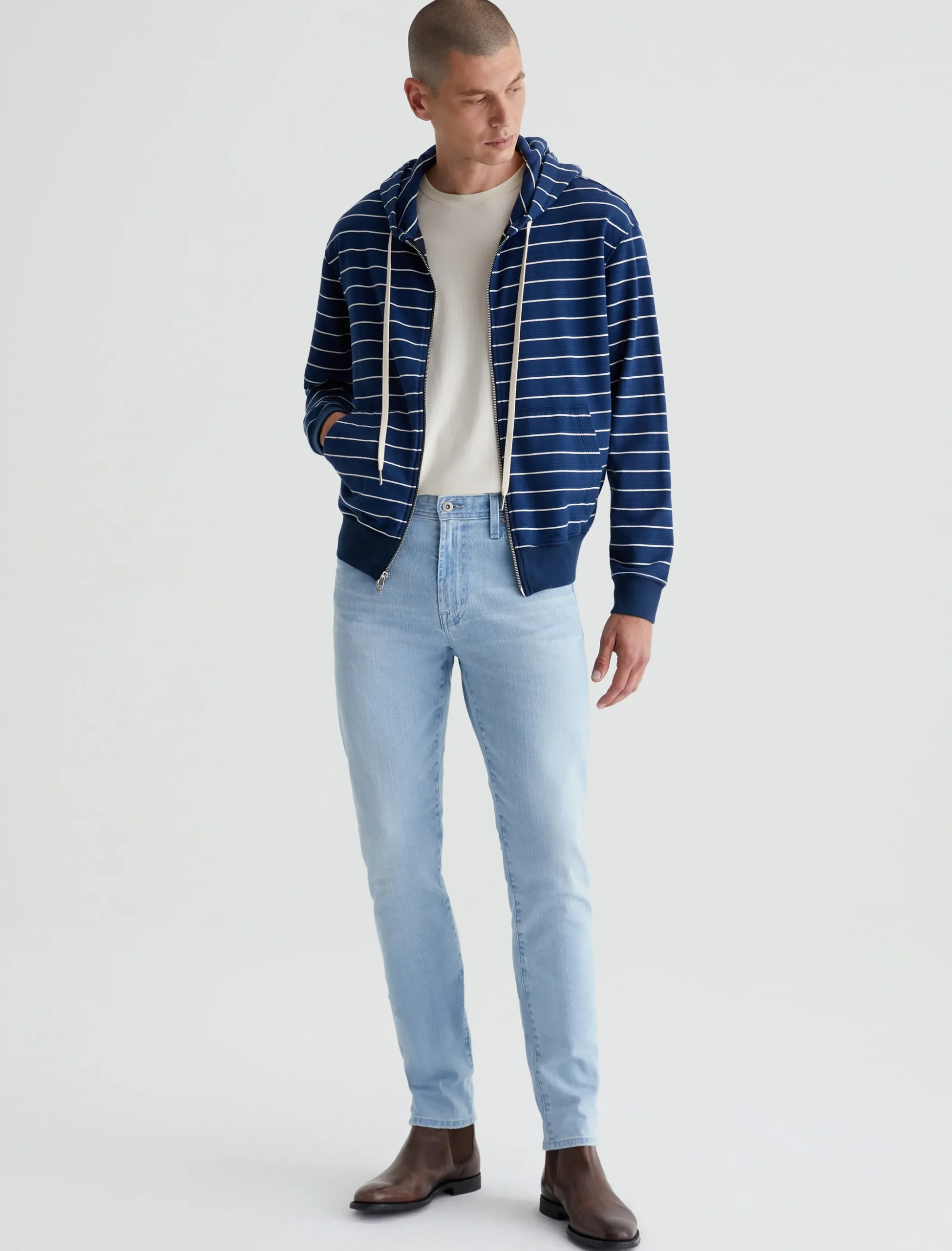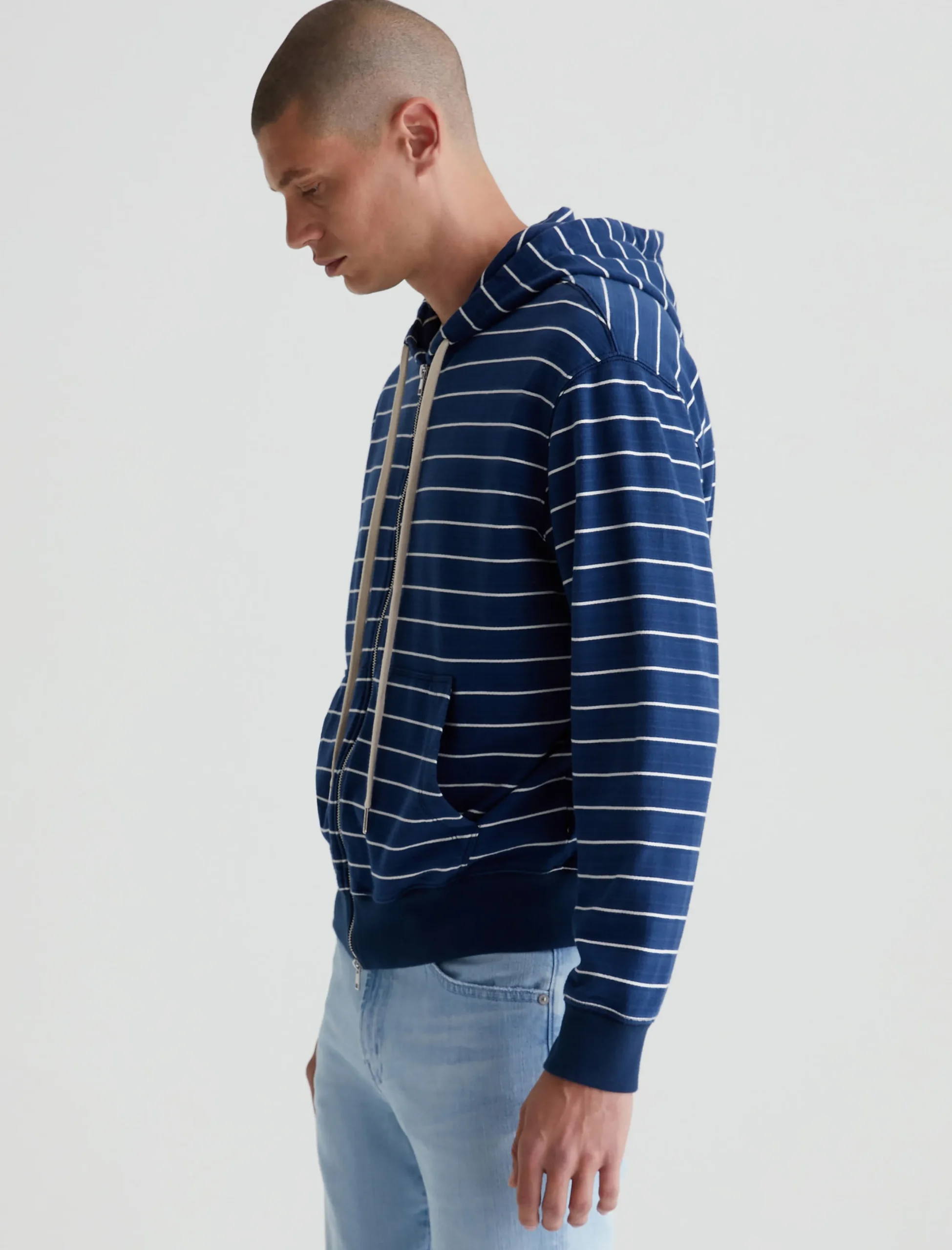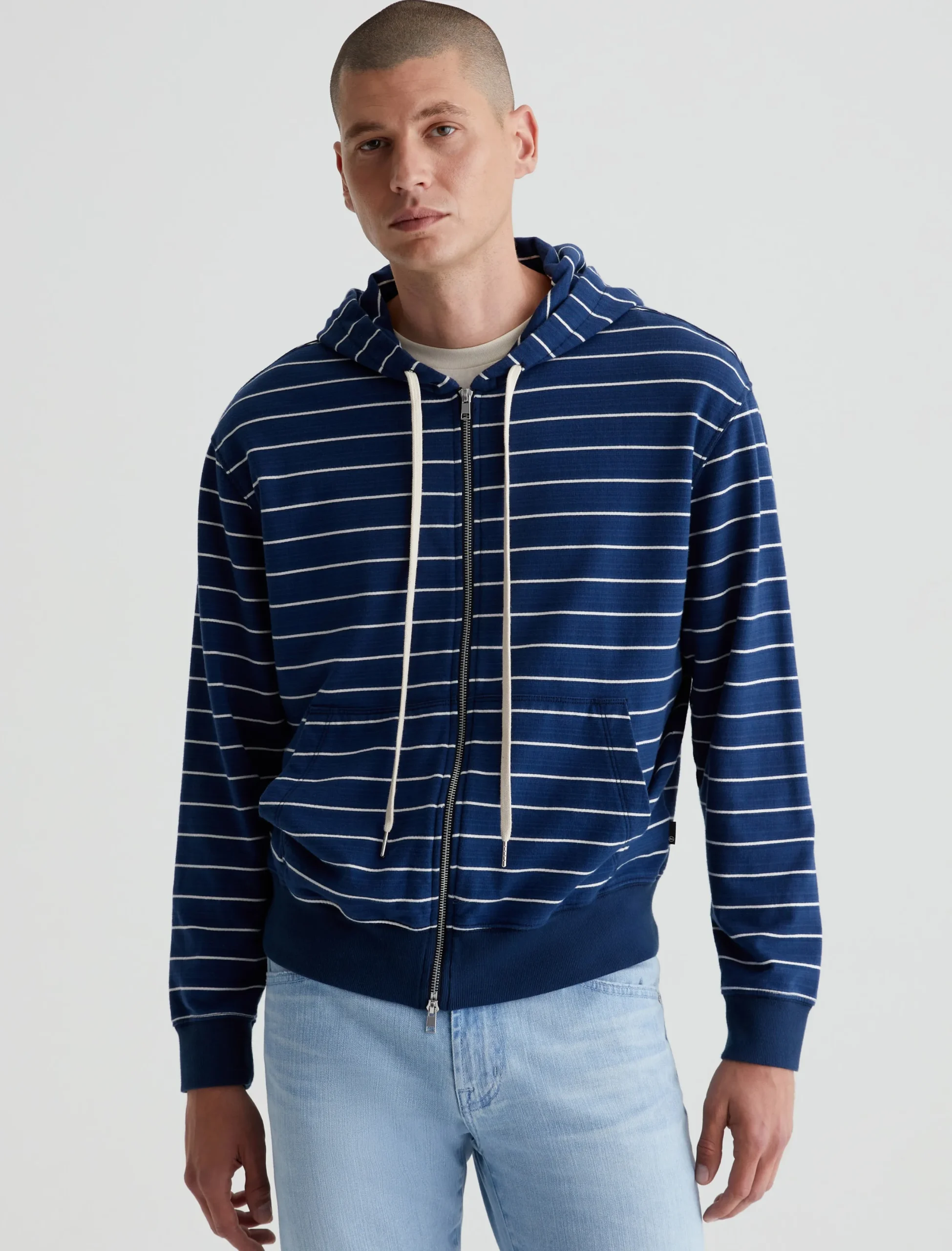 The Arc Zip Hoodie features a relaxed fit in 100% cotton French terry. Featuring a navy blue with white stripes, this cozy layer features an adjustable drawstring hood, roomy pockets at the front, and soft banded trim.