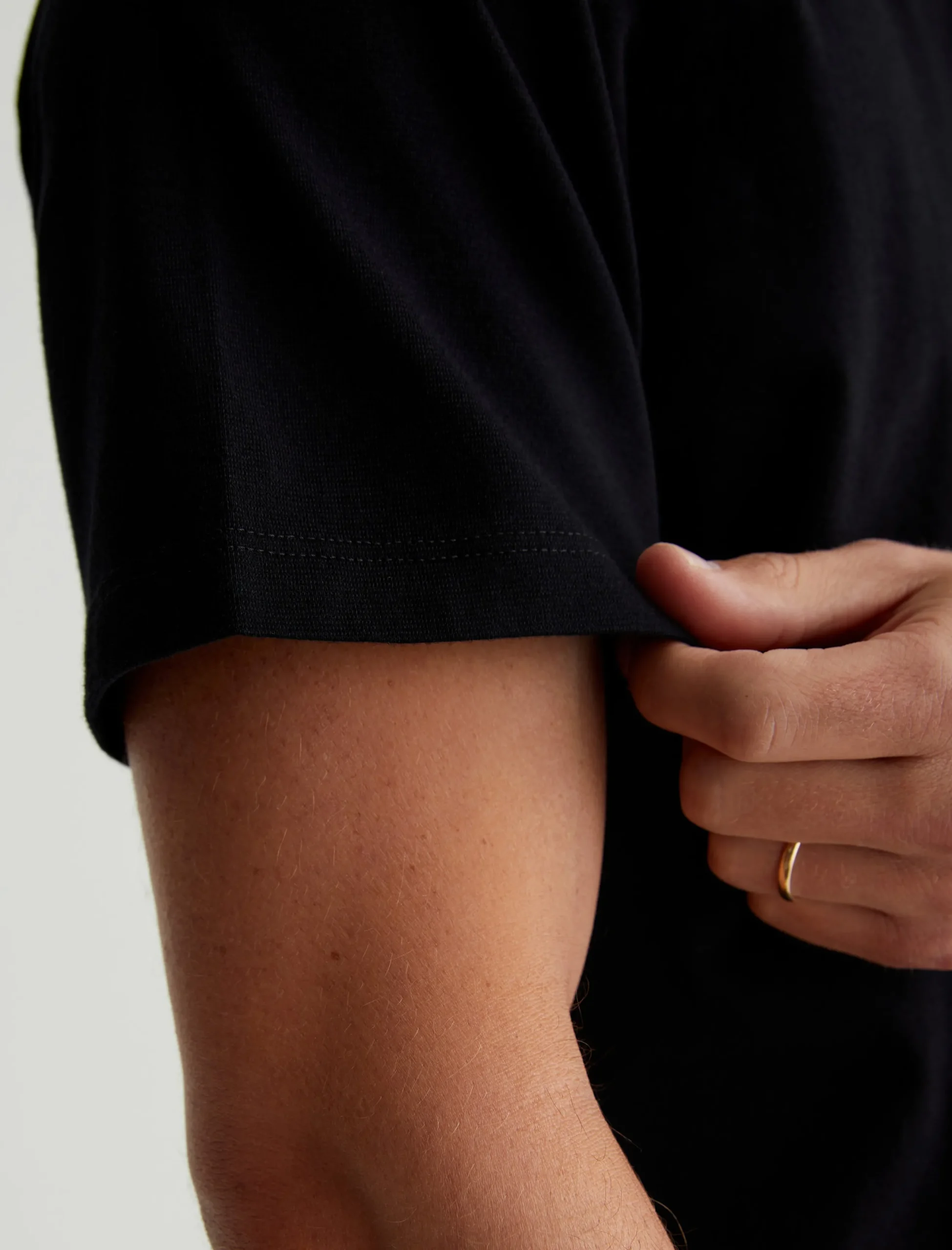 The Bryce Crew in True Black is a classic fit crewneck, short sleeve tee. The tee offers a 1X1 baby rib at the neck to create a great crew shape and serves as the perfect base when layering all year long. Our Jersey Knit offers a luxurious comfort that is unrivaled—knitted with both S-twist and Z-twist yarn to sustain longevity and stability, preventing unnecessary twisting and torquing. During the production process, the S-twist yarn is spun counter-clockwise creating a right-handed twill. The Z-twist yarn works in opposition, spinning clockwise for a left-handed twill. This opposition—when working together—yields a softer, more durable fabrication and gives strength to the yarn making it more difficult to pull apart. Designed in 100% Cotton.
