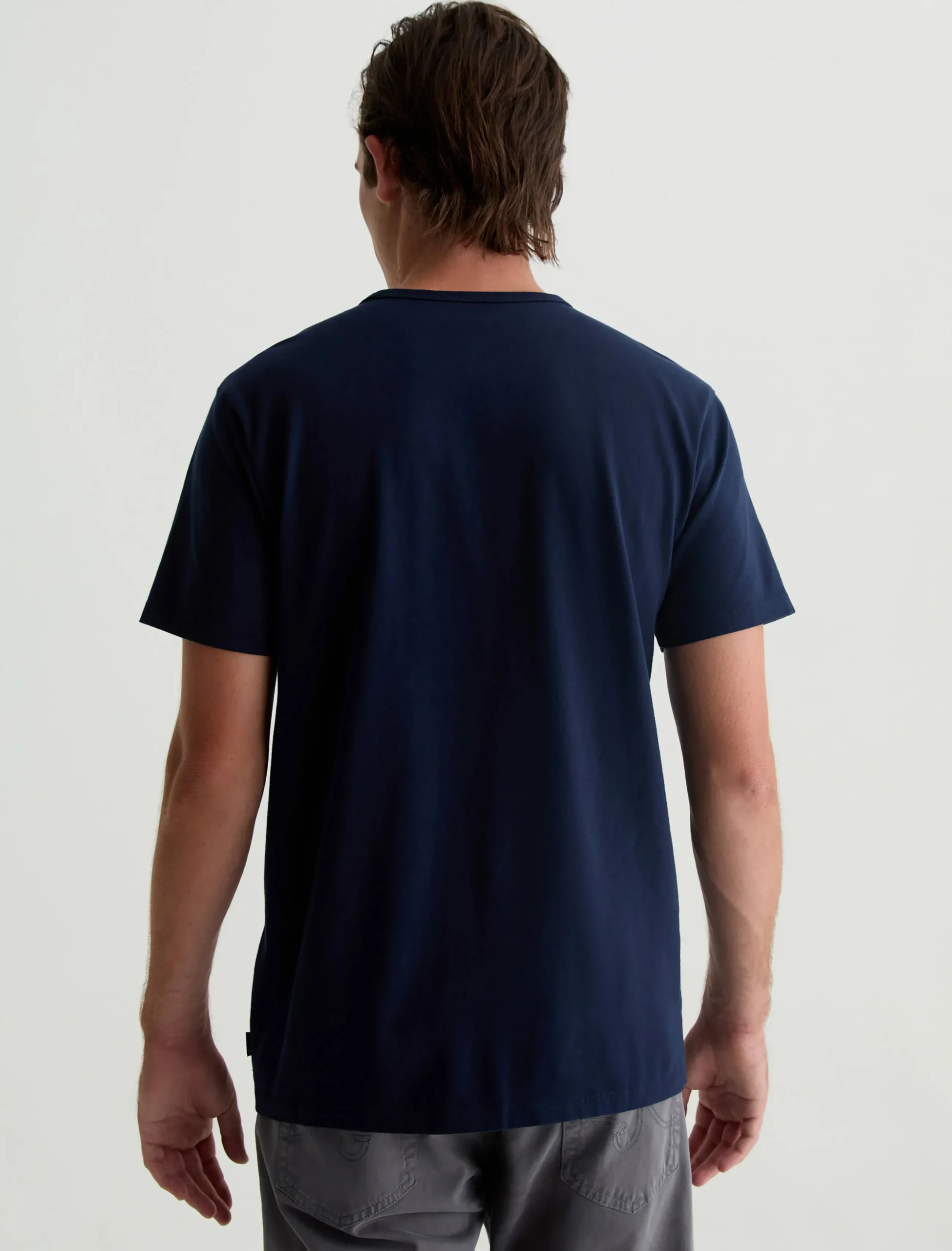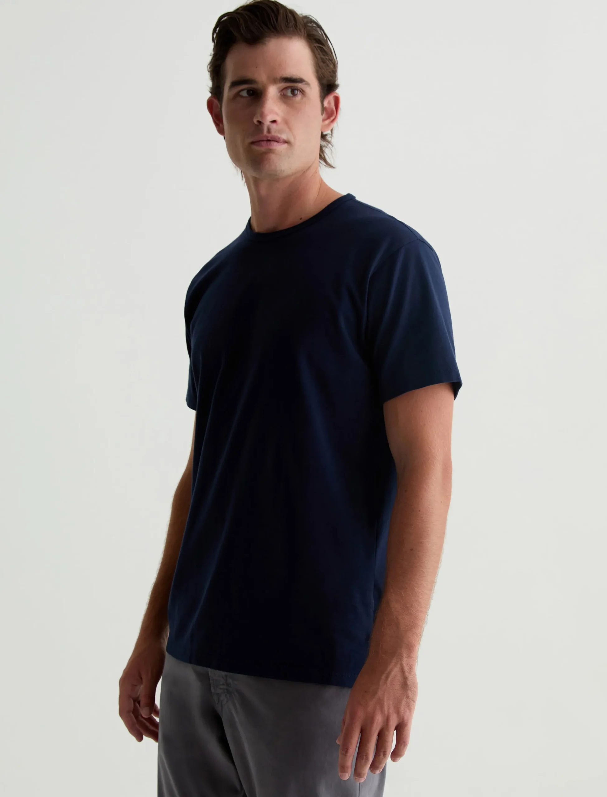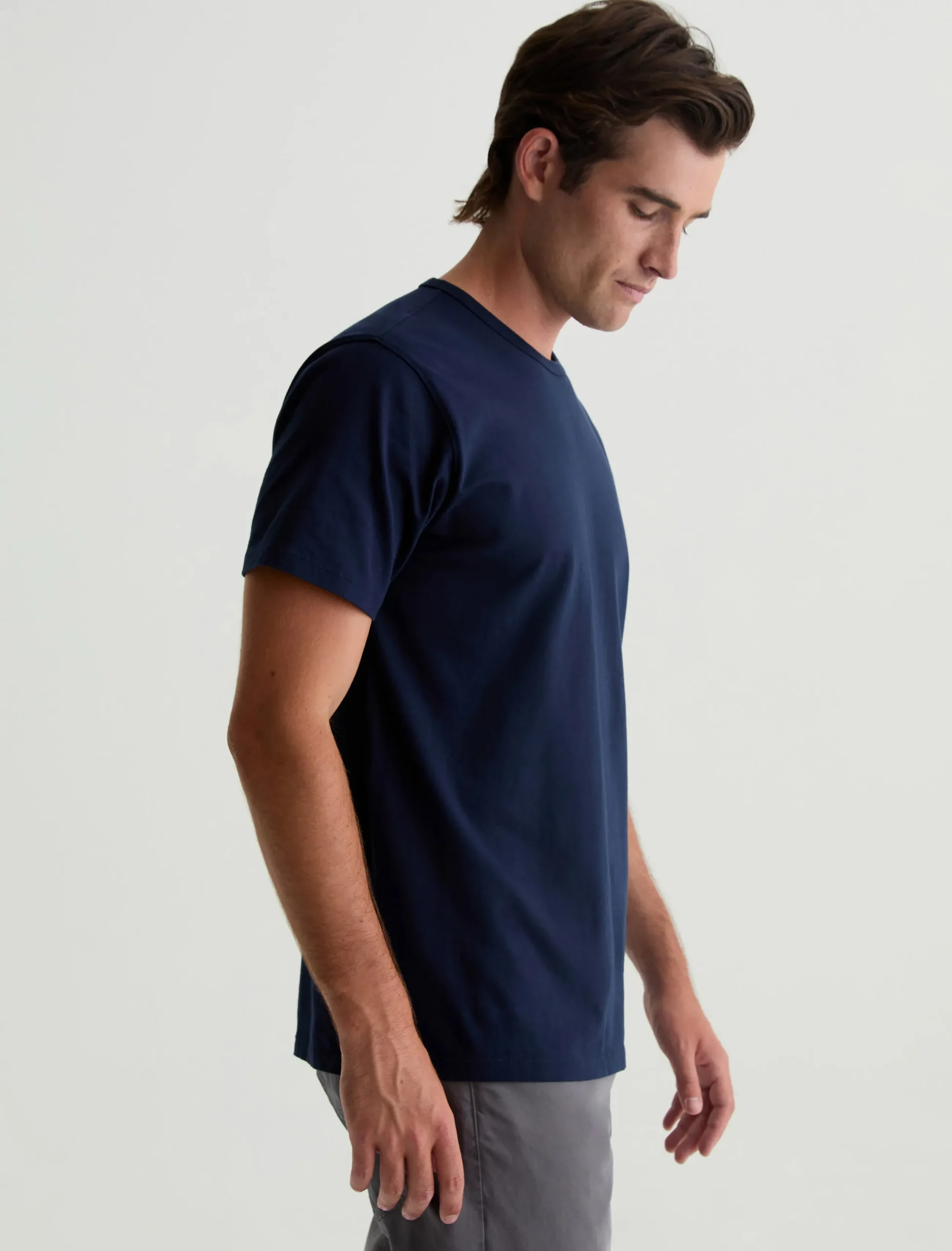The Bryce Crew in deep navy is a classic fit crewneck, short sleeve tee. The tee offers a 1X1 baby rib at the neck to create a great crew shape and serves as the perfect base when layering all year long. Our Jersey Knit offers a luxurious comfort that is unrivaled—knitted with both S-twist and Z-twist yarn to sustain longevity and stability, preventing unnecessary twisting and torquing. During the production process, the S-twist yarn is spun counter-clockwise creating a right-handed twill. The Z-twist yarn works in opposition, spinning clockwise for a left-handed twill. This opposition—when working together—yields a softer, more durable fabrication and gives strength to the yarn making it more difficult to pull apart. Designed in 100% Cotton.
