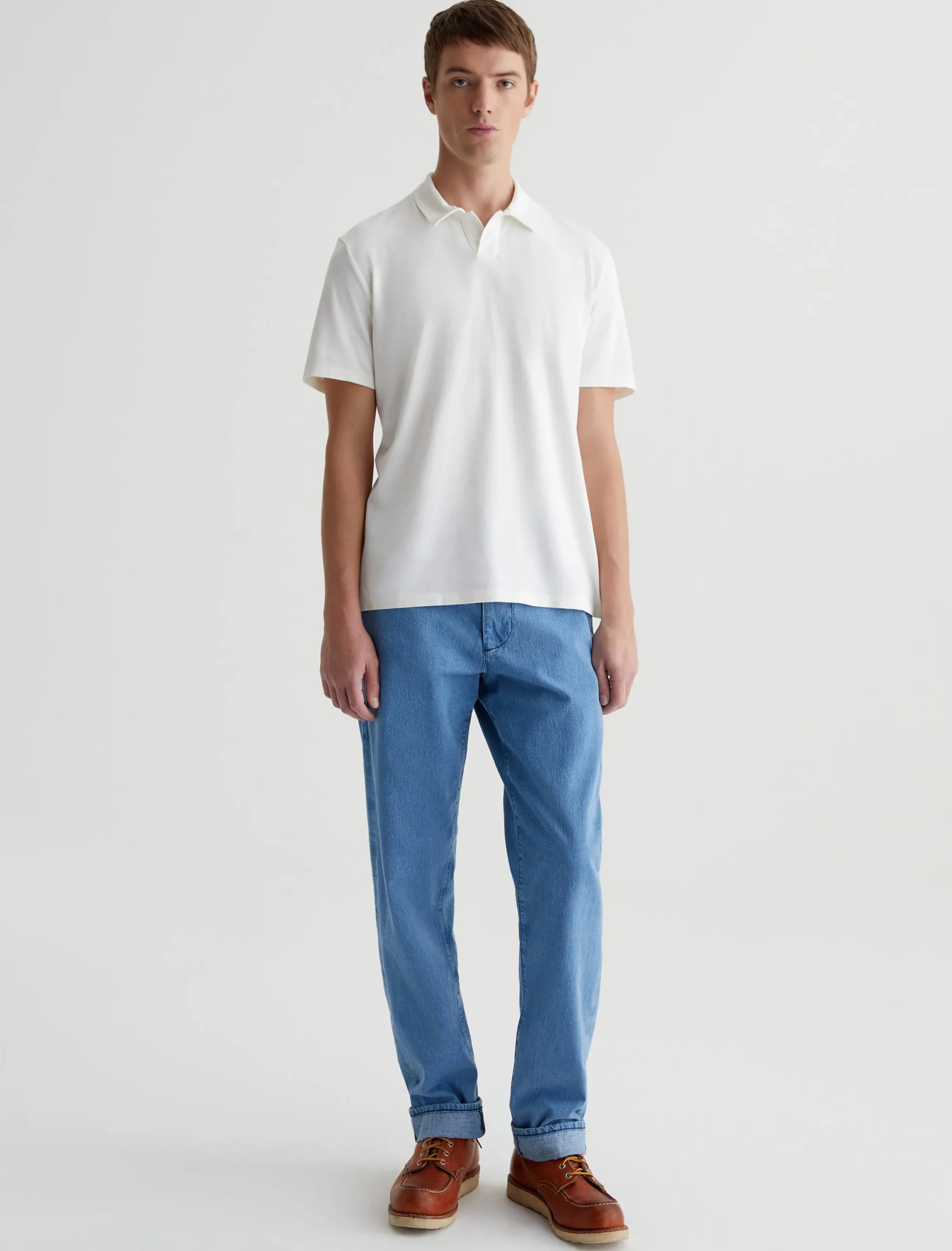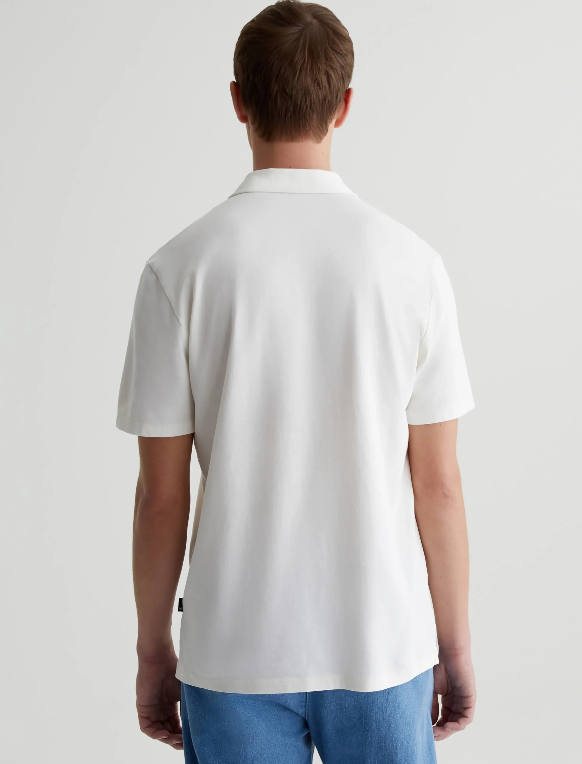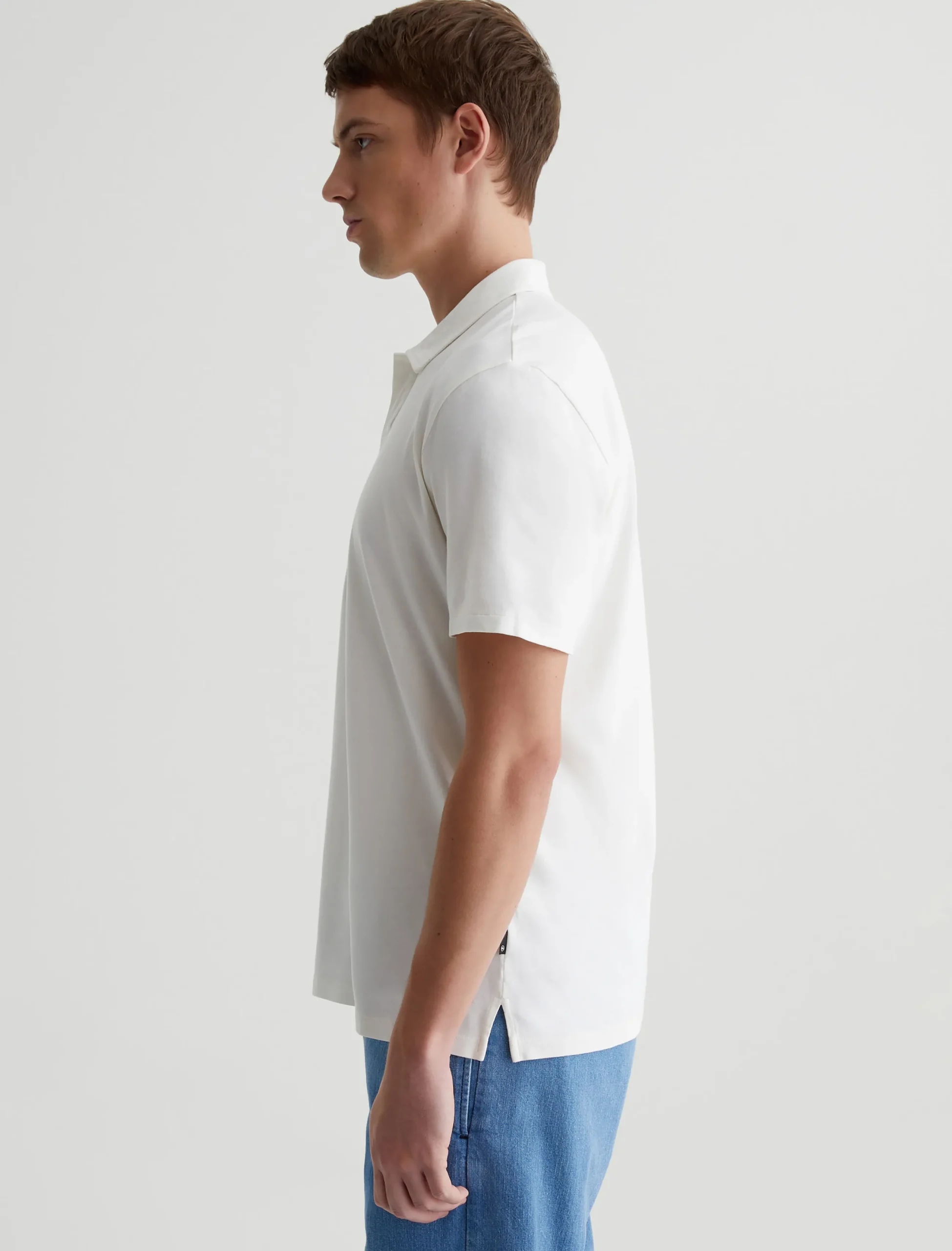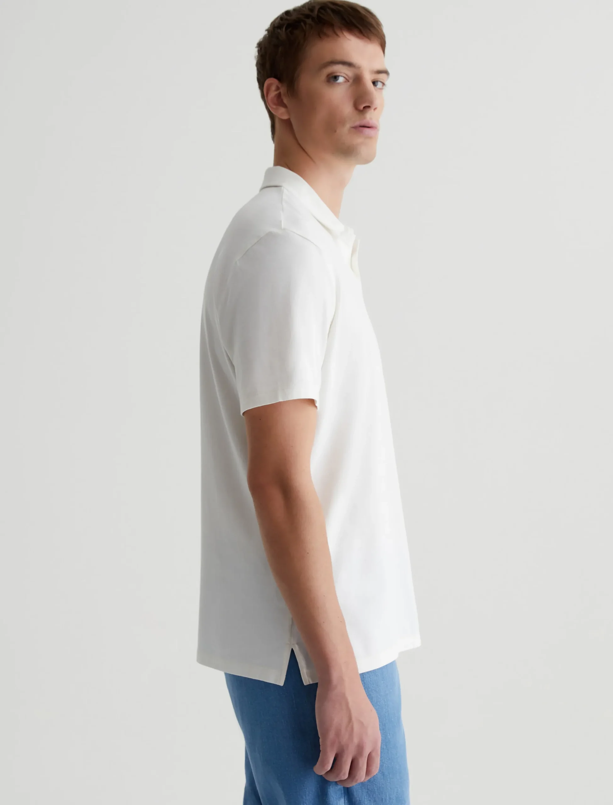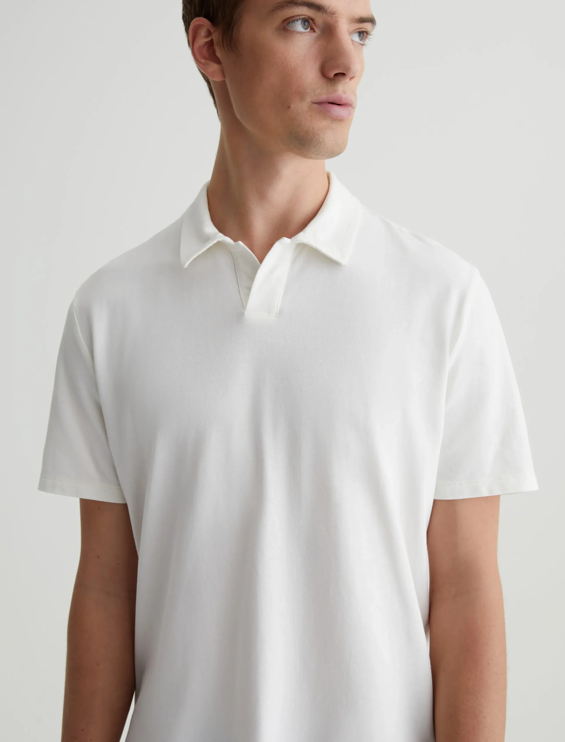 The Bryce Johnny Collar shirt is a classic short-sleeve polo tee with a relaxed neckline and pointed collar. Made from our Light Cotton Jersey in white, it’s soft and easy to wear year-round.