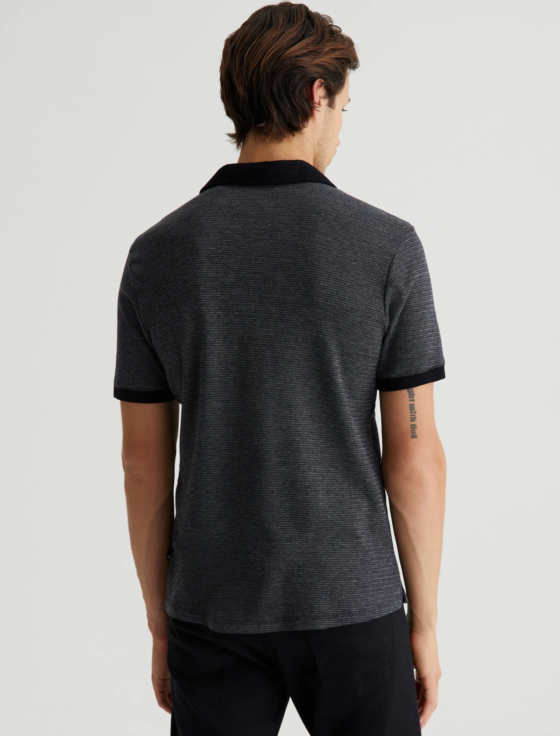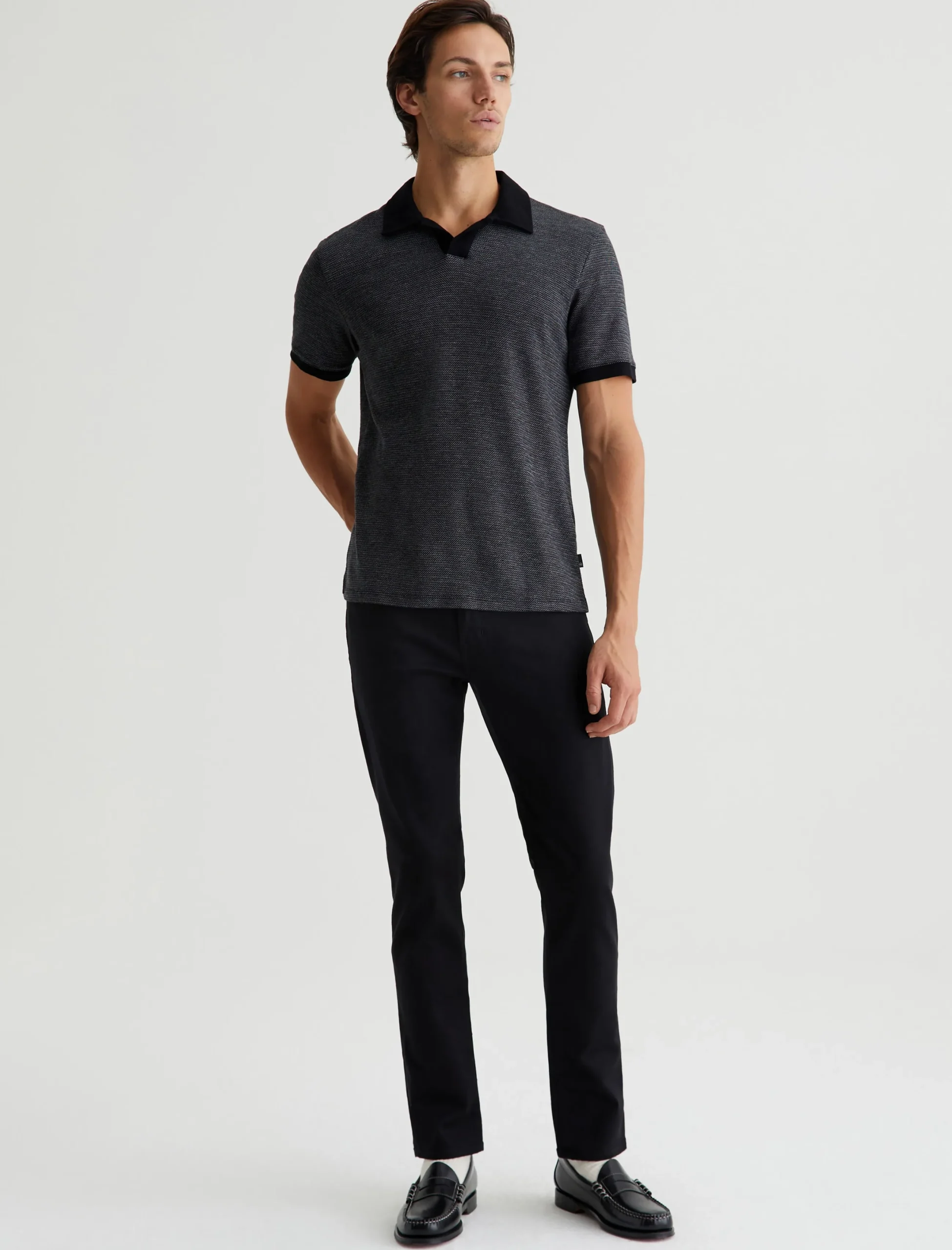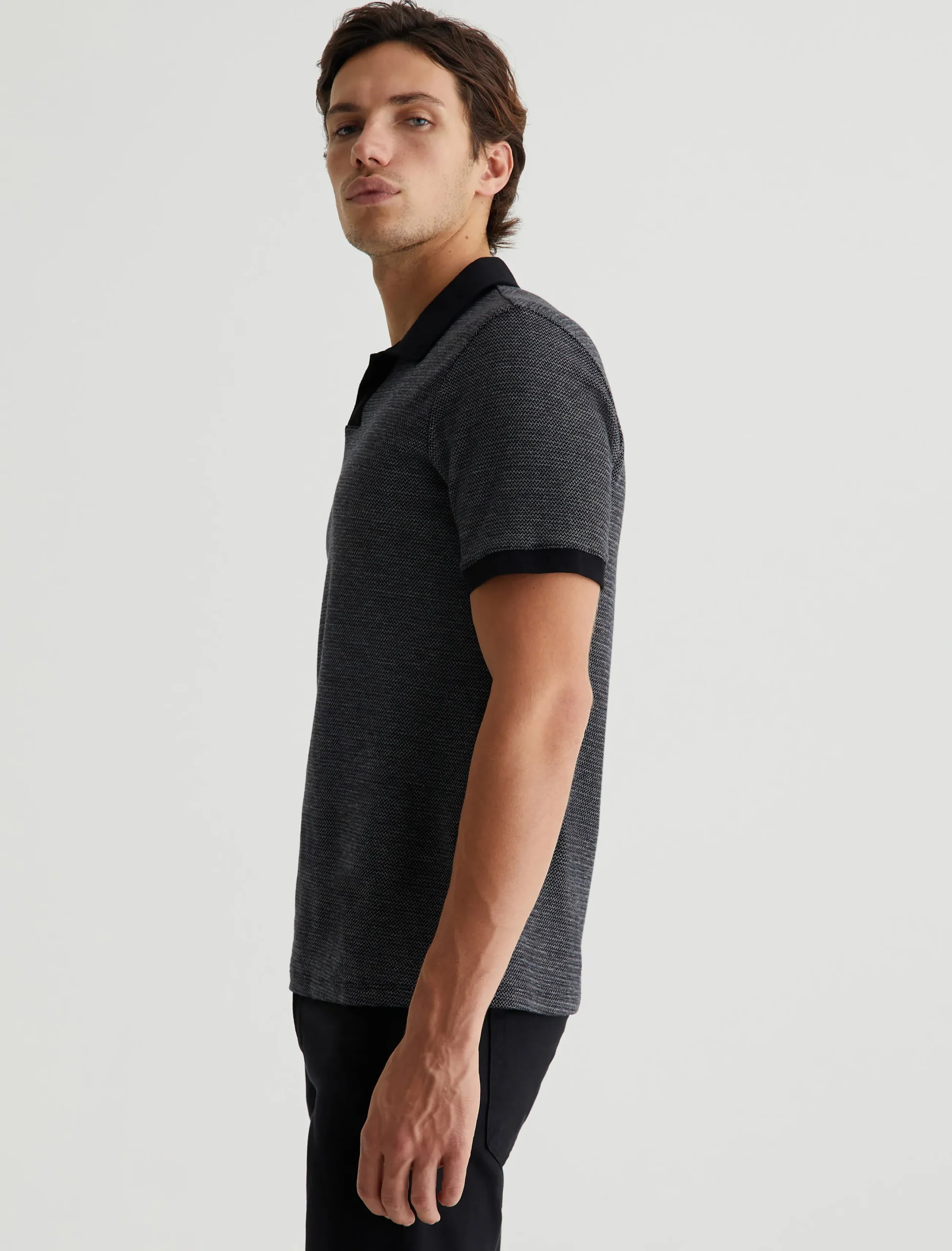 The Bryce Johnny Collar shirt is a classic short-sleeve polo tee with a relaxed neckline and pointed collar. Elevated by our Luxe Heavy Jacquard in black, it’s got a delicate chevron pattern accented by solid trim.