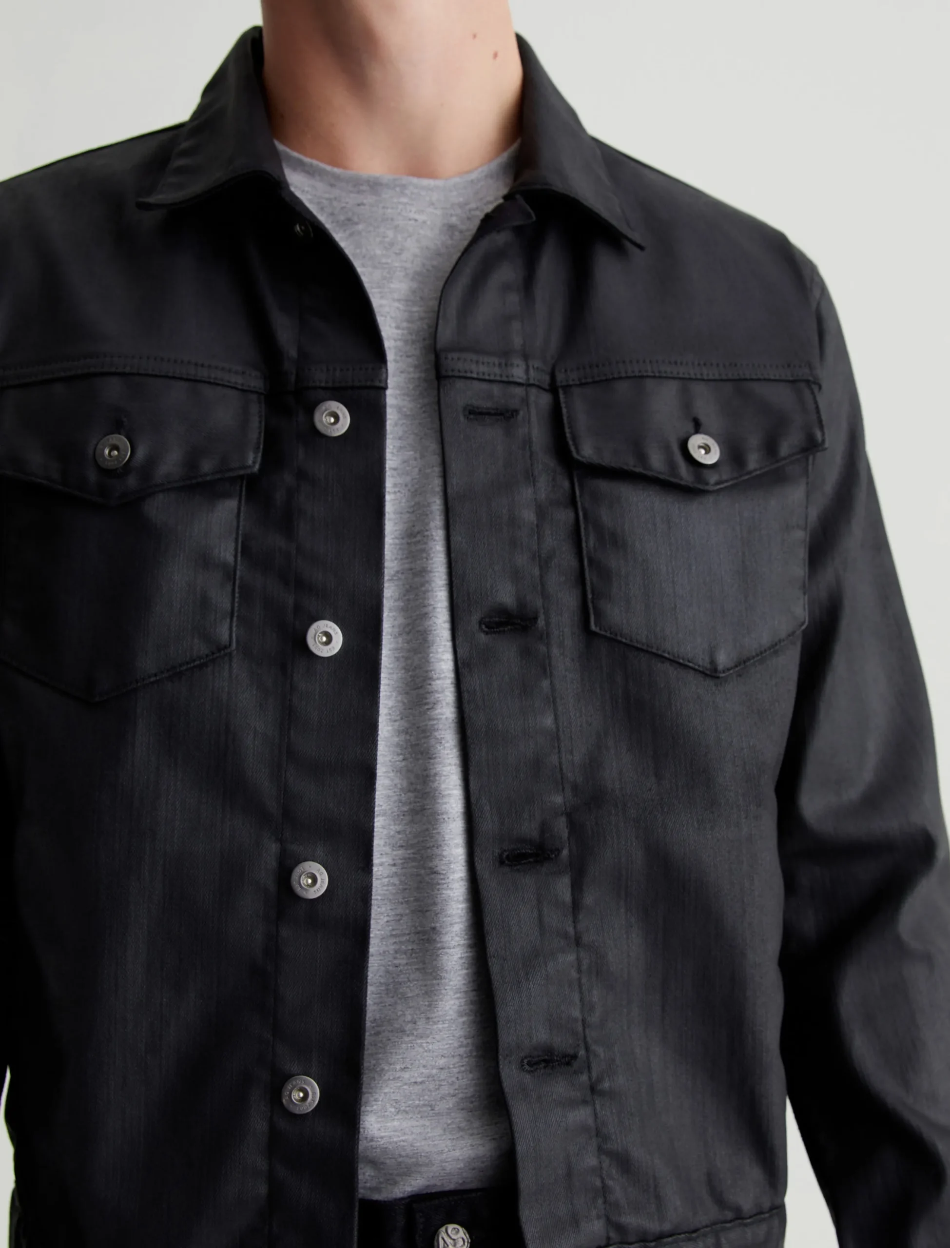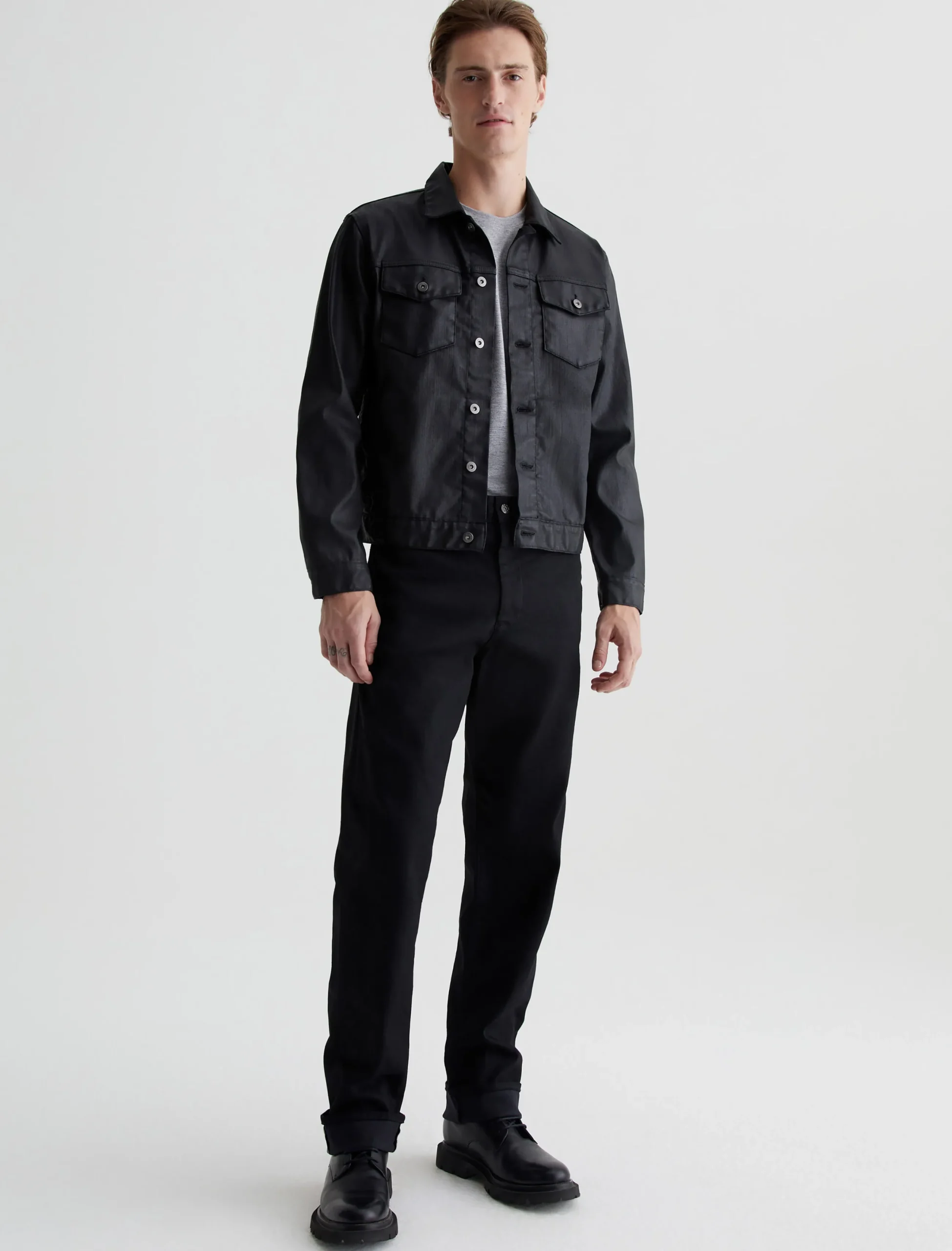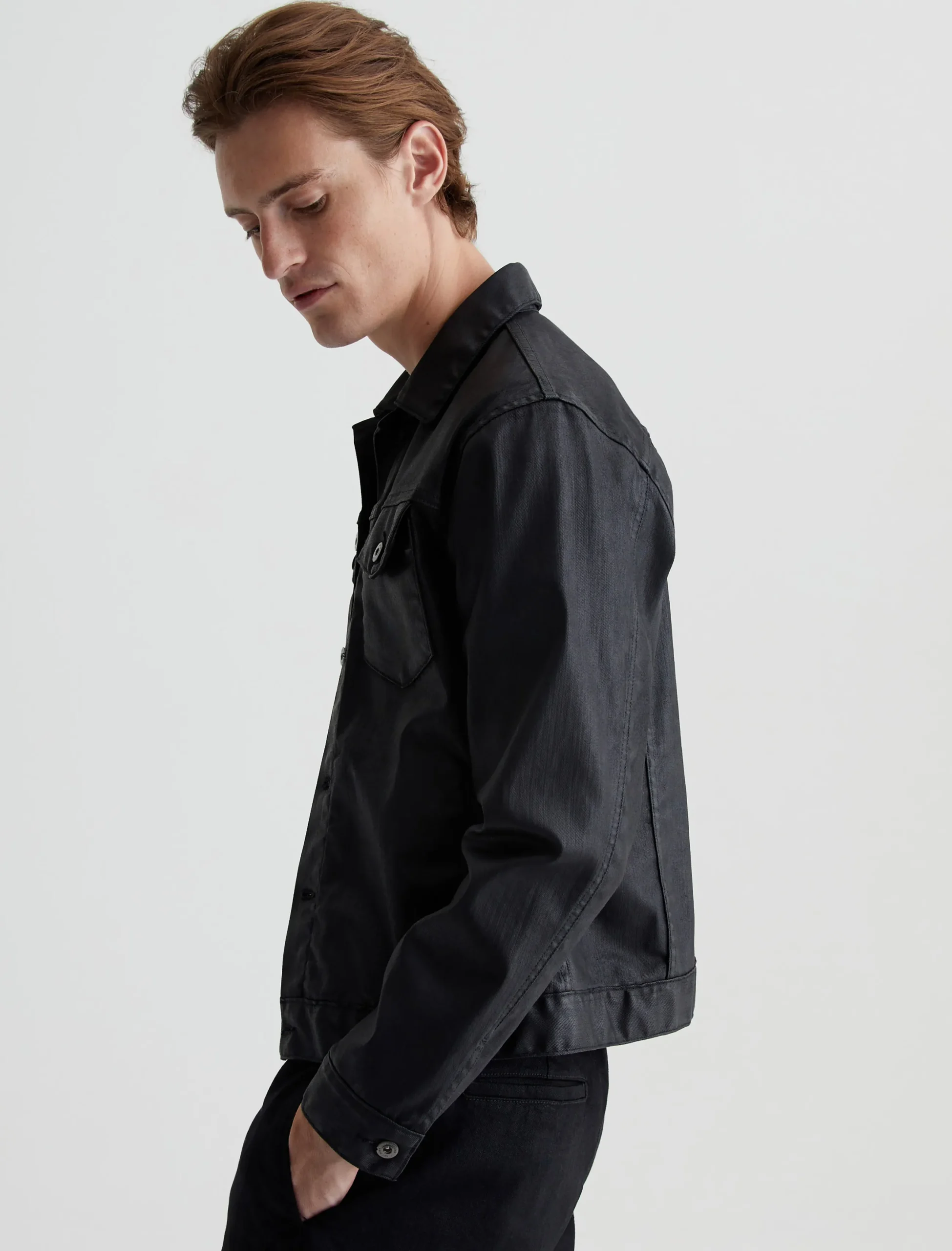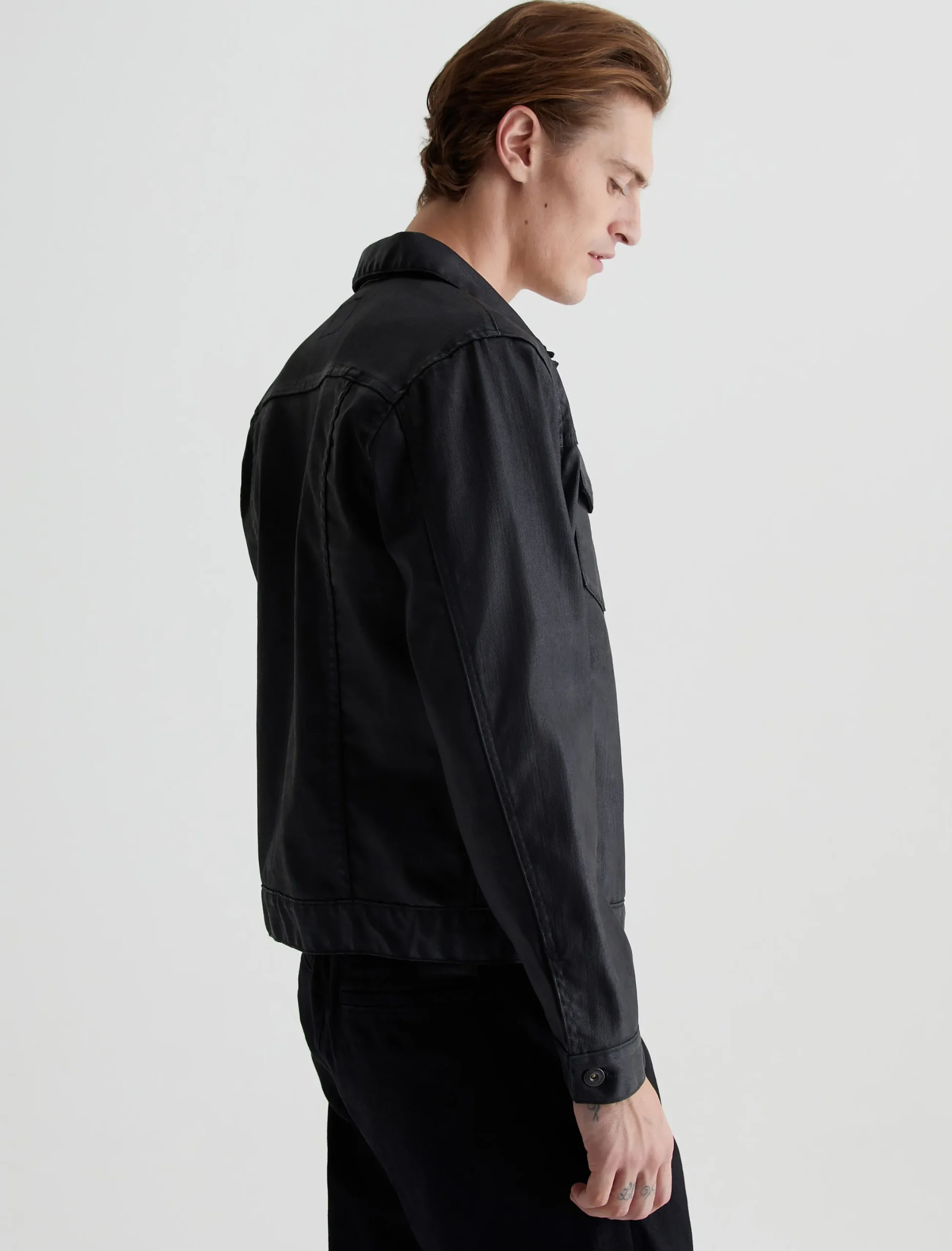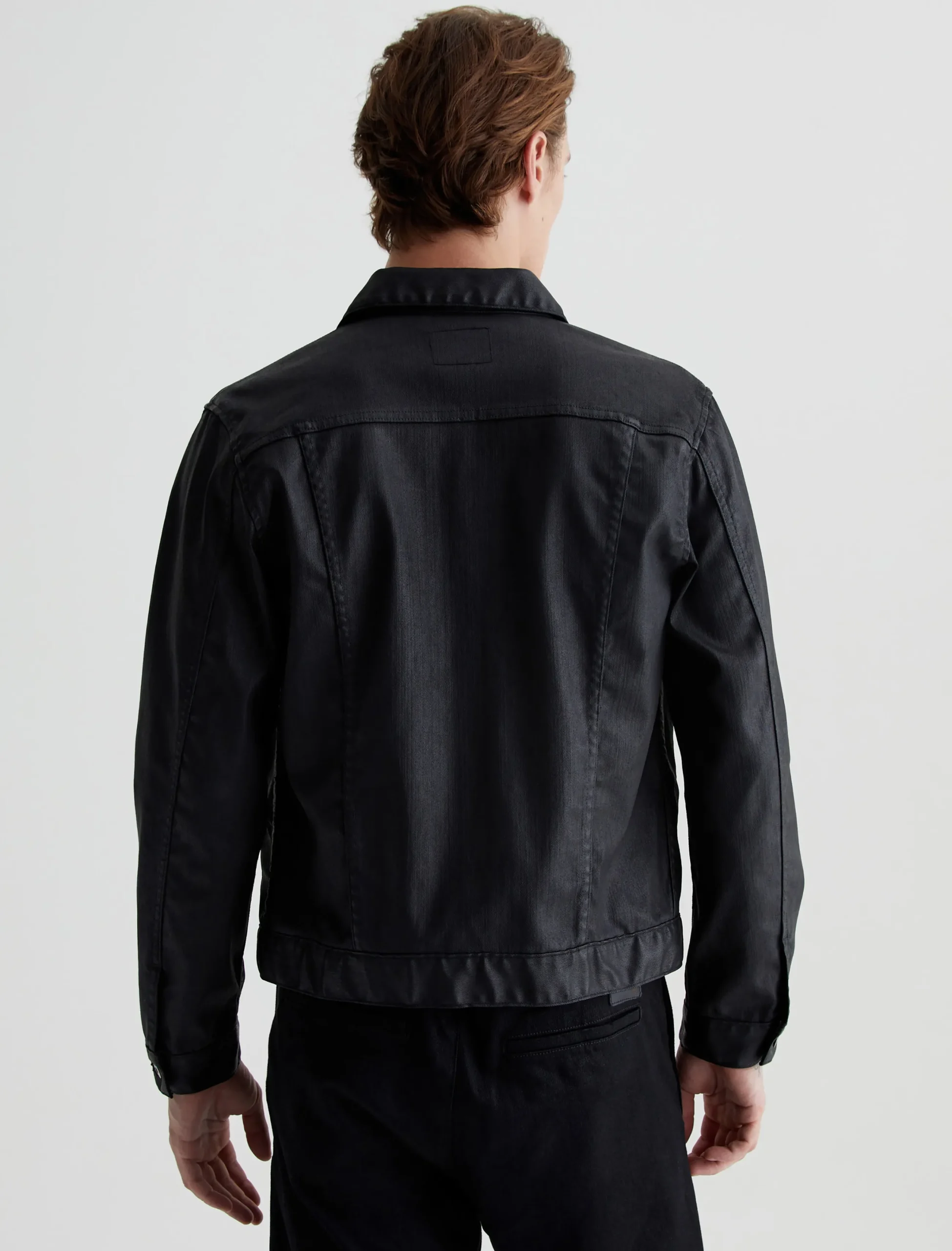 Our Dart Jacket offers a cool update on the classic men’s trucker in a black leatherette finish. Made from 10 oz. Dover Stretch Denim, the timeless design features a pointed collar, button placket, and flap pockets. Sleek welt pockets at the front make it easy to stash your essentials.