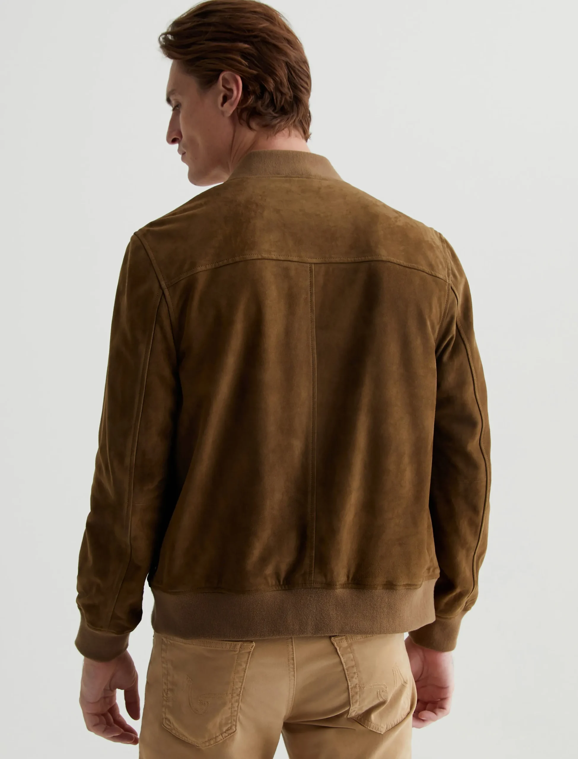 The Dayton Bomber jacket is a classic outer layer with a refined aesthetic. Simple yet luxurious, this men’s jacket comes in a timeless brown shade and features rib trim at the collar, cuffs, and waistband.