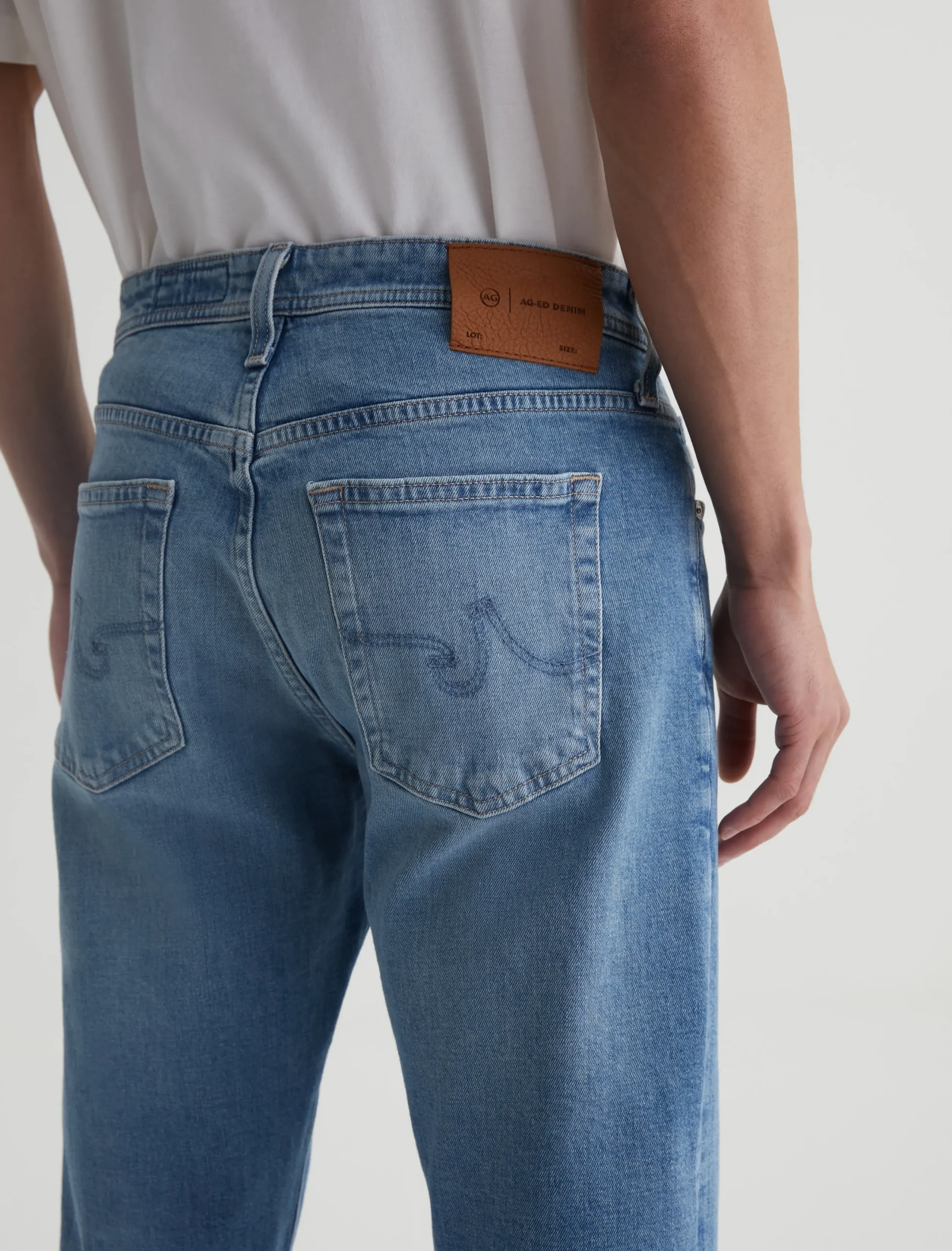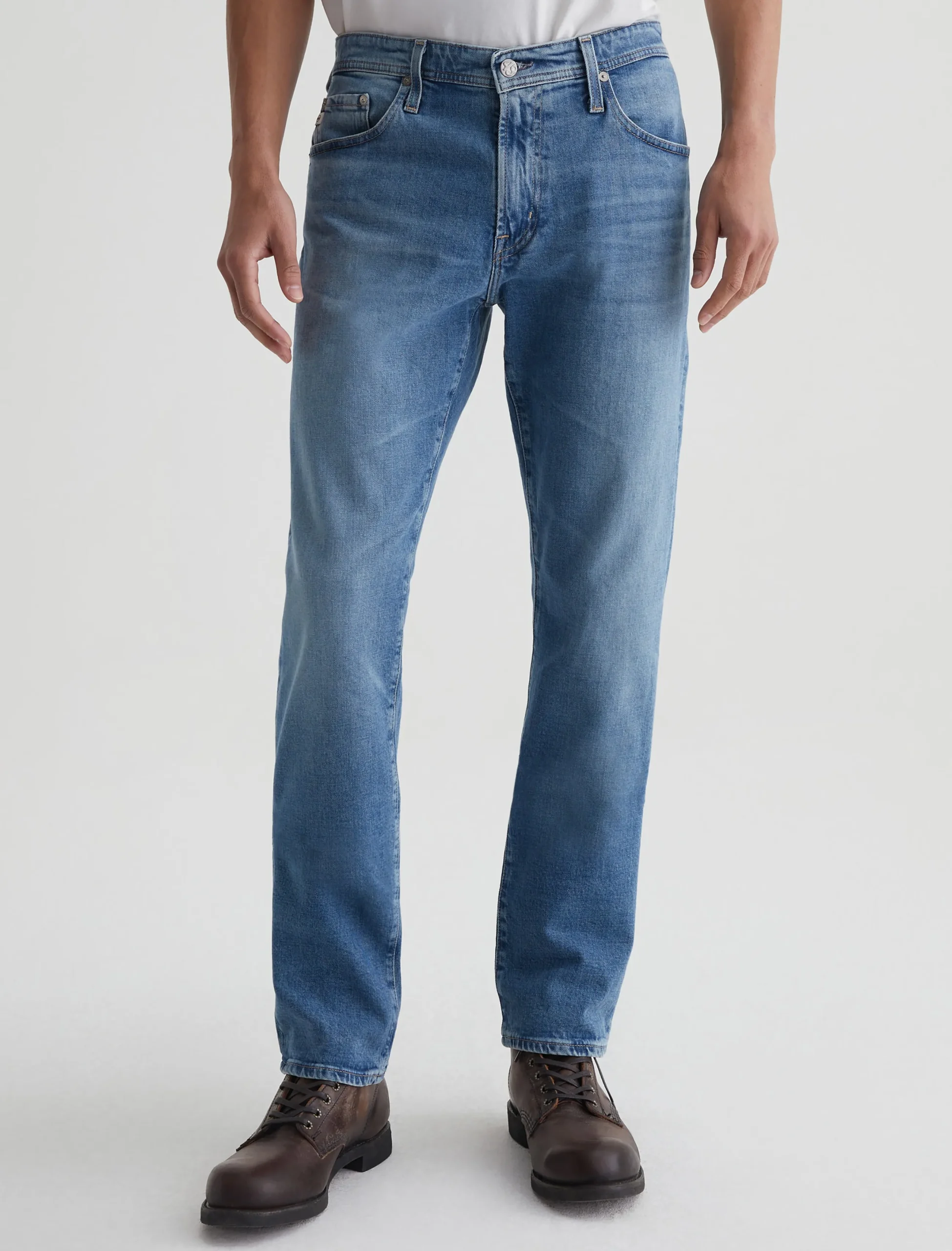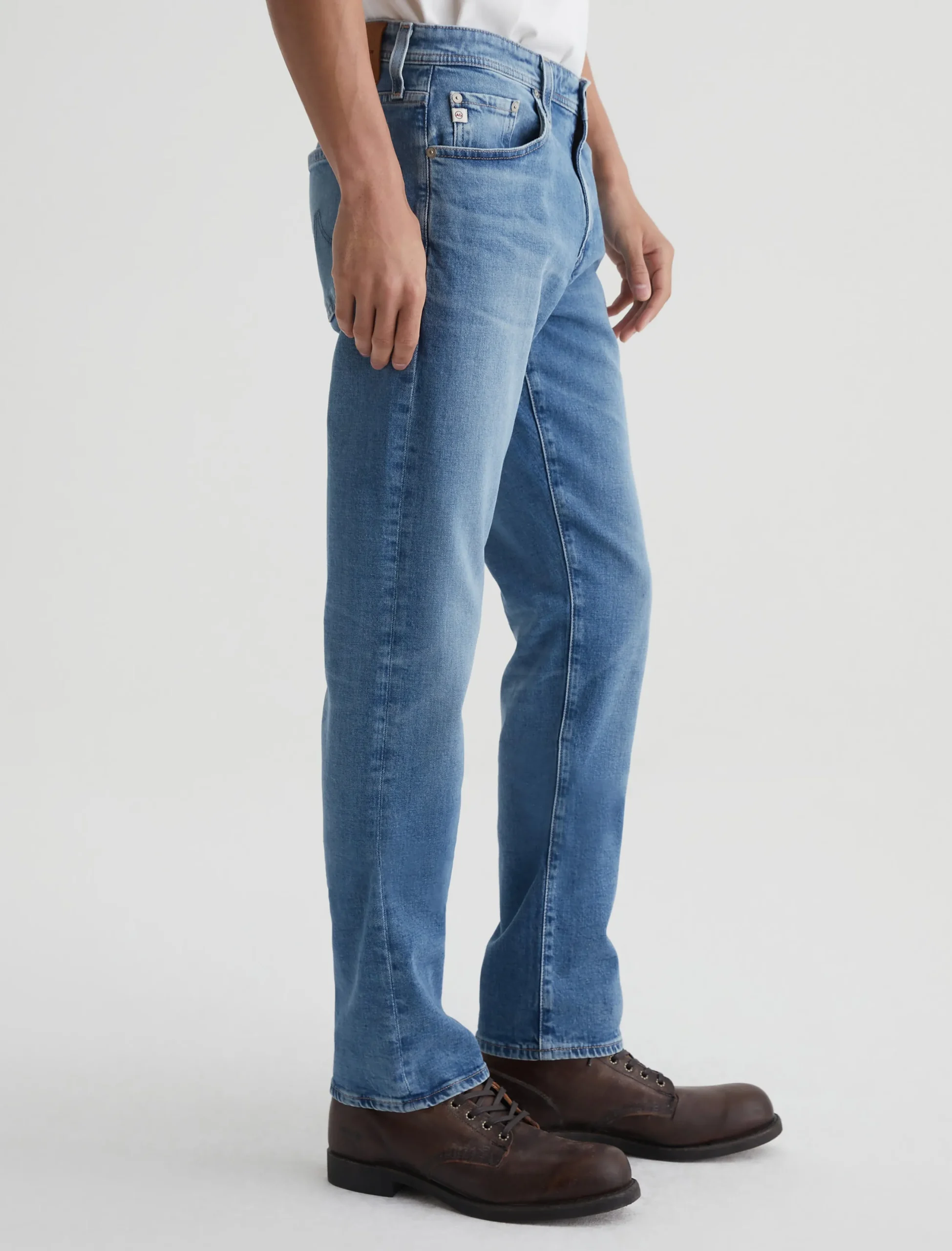 Everett is a slim straight fit crafted from 11 oz. Journey Denim in a light blue wash with an AG-ed™ 19-year fade. The style has a mid-rise waist and a straight fit that’s relaxed from hip to knee before slightly tapering at the leg opening. These five-pocket men’s jeans feature the perfect amount of stretch for comfortable wear.