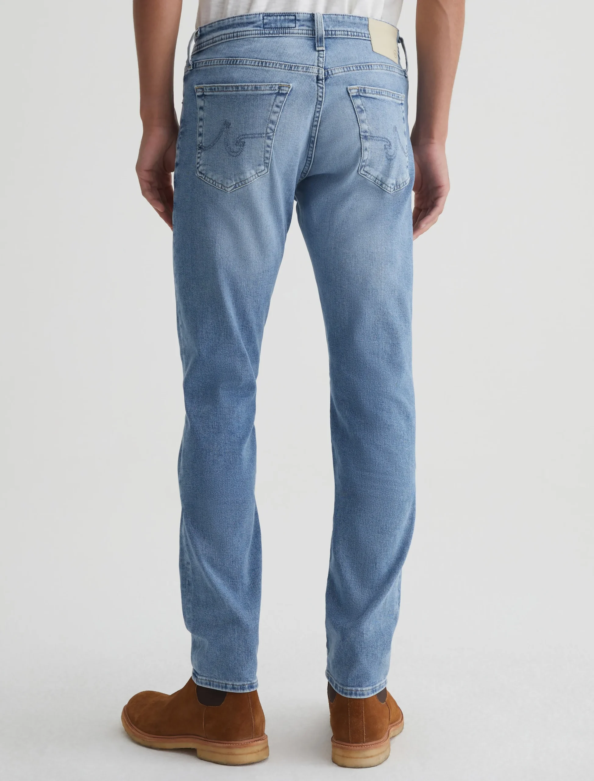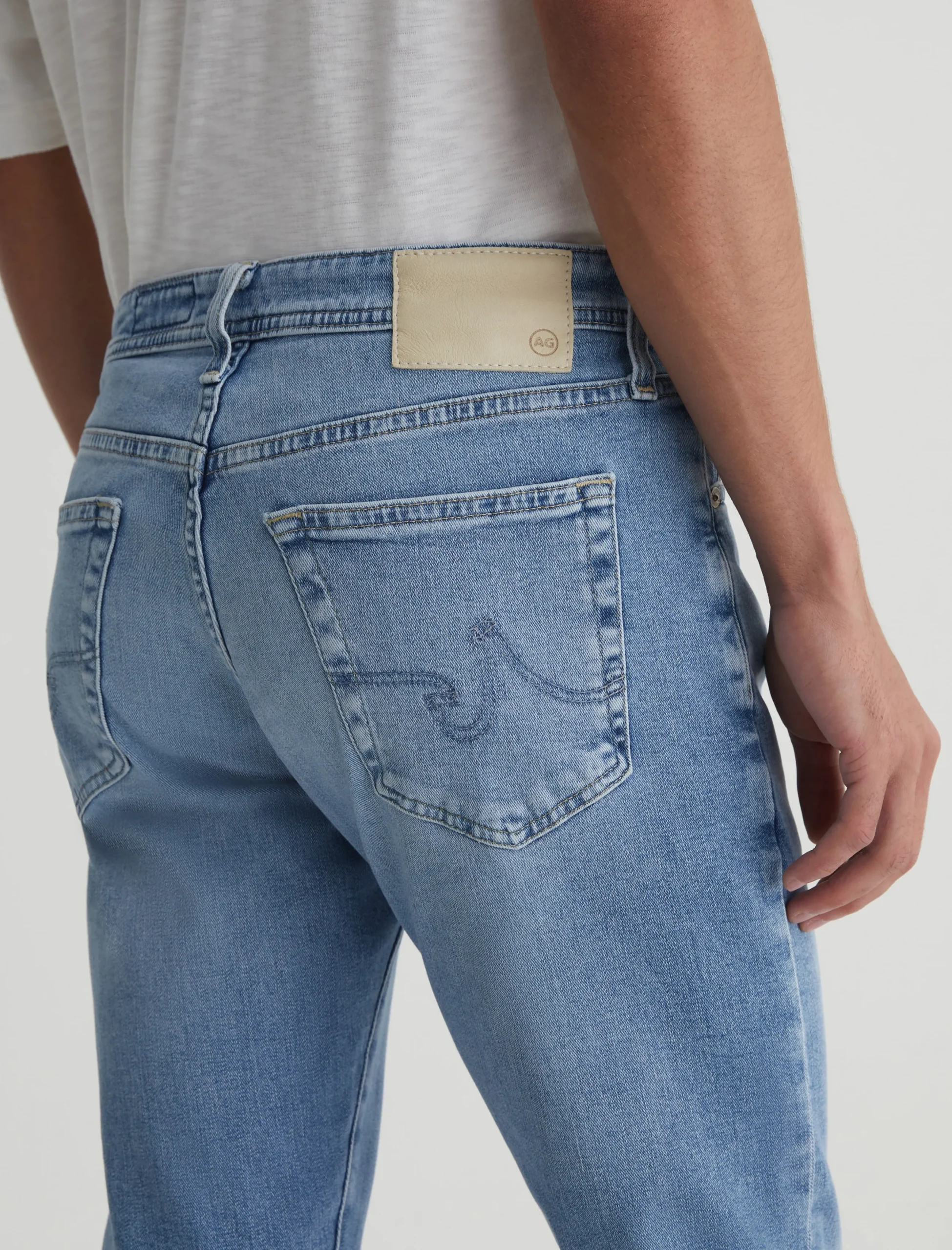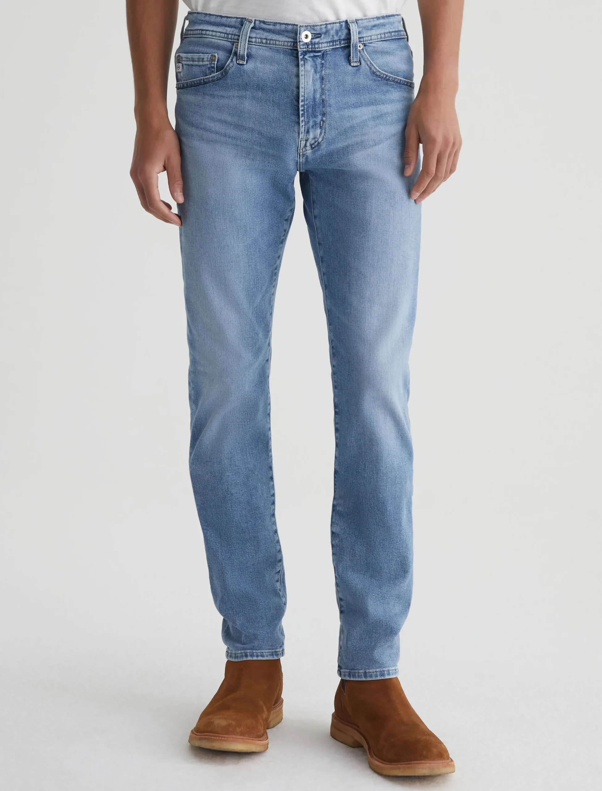 Everett is a slim straight jean for men, done here in a medium indigo wash with heavy fading. The style has a comfortable mid-rise waist and a straight fit that’s relaxed from hip to the knee before slightly tapering at the leg opening. Made from our exclusive AG Cloud Soft Denim™, this men’s slim straight jean is designed in 9.4 oz. Hyper Soft Indigo Denim, our special left-hand twill fabric that allows the yarns to gently relax and untwist for a supple feel that gets even softer with wear. It’s got dual-elastic performance fibers built in for added stretch and recovery.