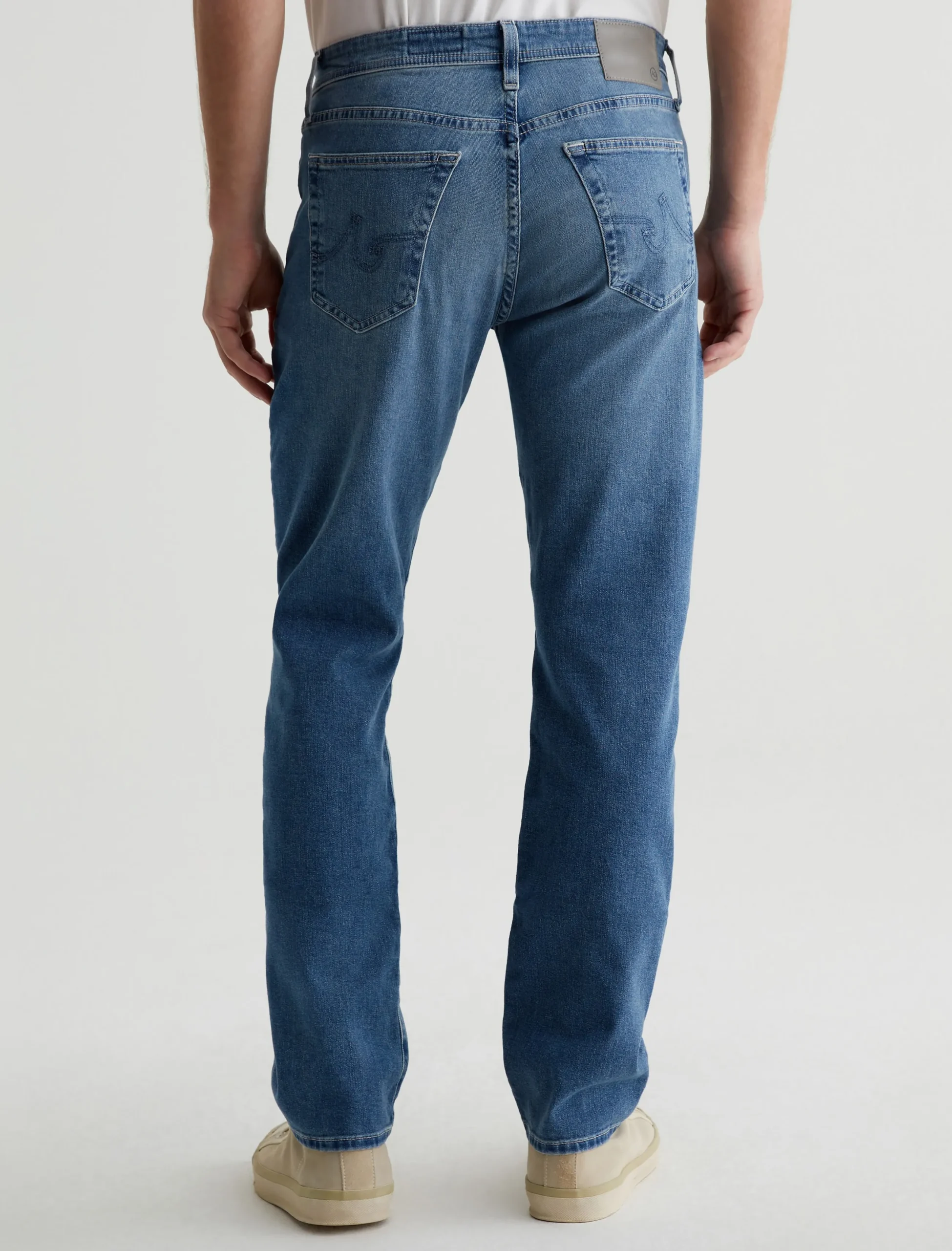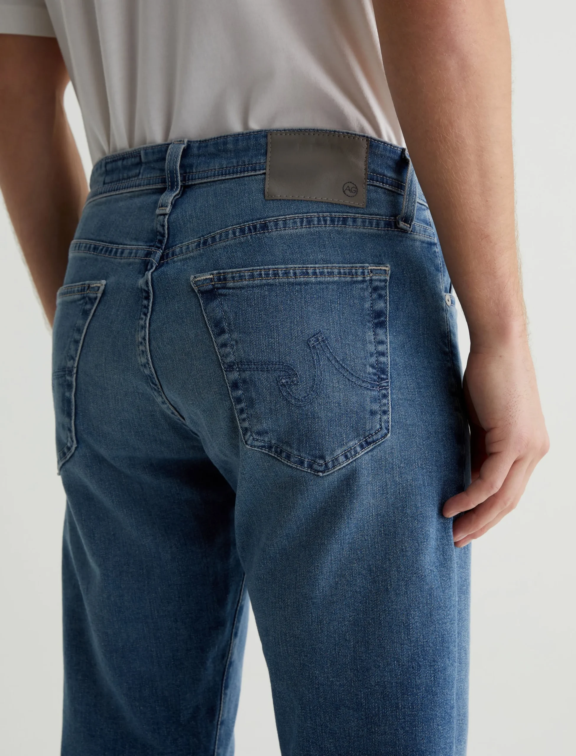 Everett is a five-pocket slim straight jean for men, done here in a faded medium blue wash. The style has a mid-rise waist and a straight fit that’s relaxed from hip to knee before slightly tapering at the leg opening. These slim straight men’s jeans feature 9.4 oz. Hyper Soft Indigo Denim, our exclusive AG Cloud Soft Denim™ fabric with a velvety texture. The special left-hand twill construction allows the yarns to gently relax and untwist for a supple feel that gets even softer with wear. It’s got dual-elastic performance fibers built in for added stretch and recovery.