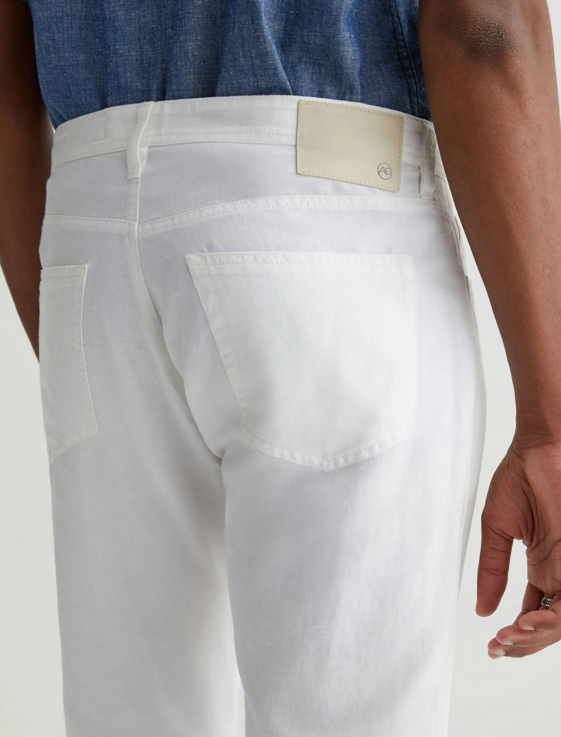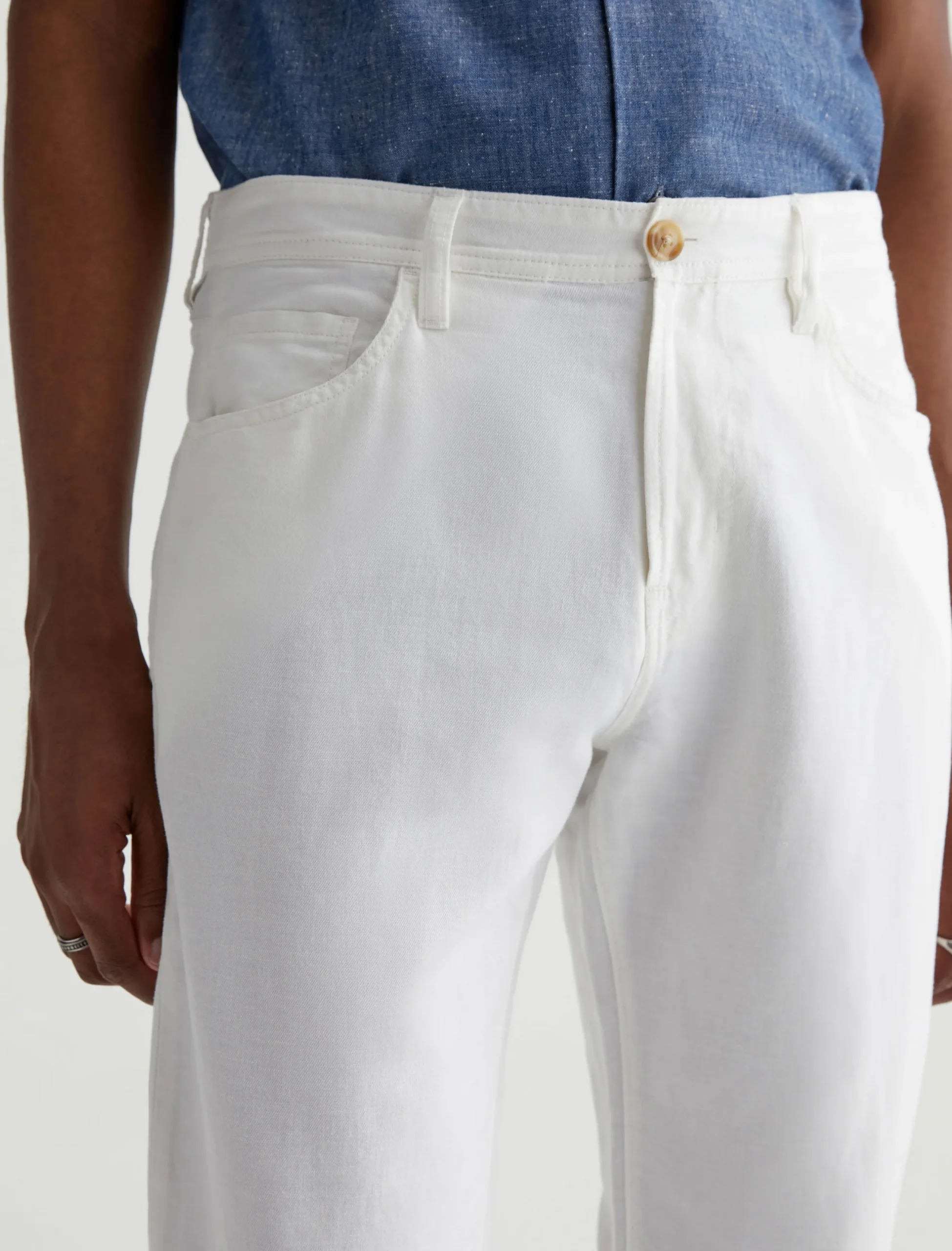 Our Everett slim straight gets a summery update in a white linen blend with a soft, airy feel. It’s cut with a comfortable mid-rise waist and a straight fit that’s relaxed from hip to the knee before slightly tapering at the leg opening. This men’s slim straight pant has classic five-pocket styling with a zip fly and faux-horn button.