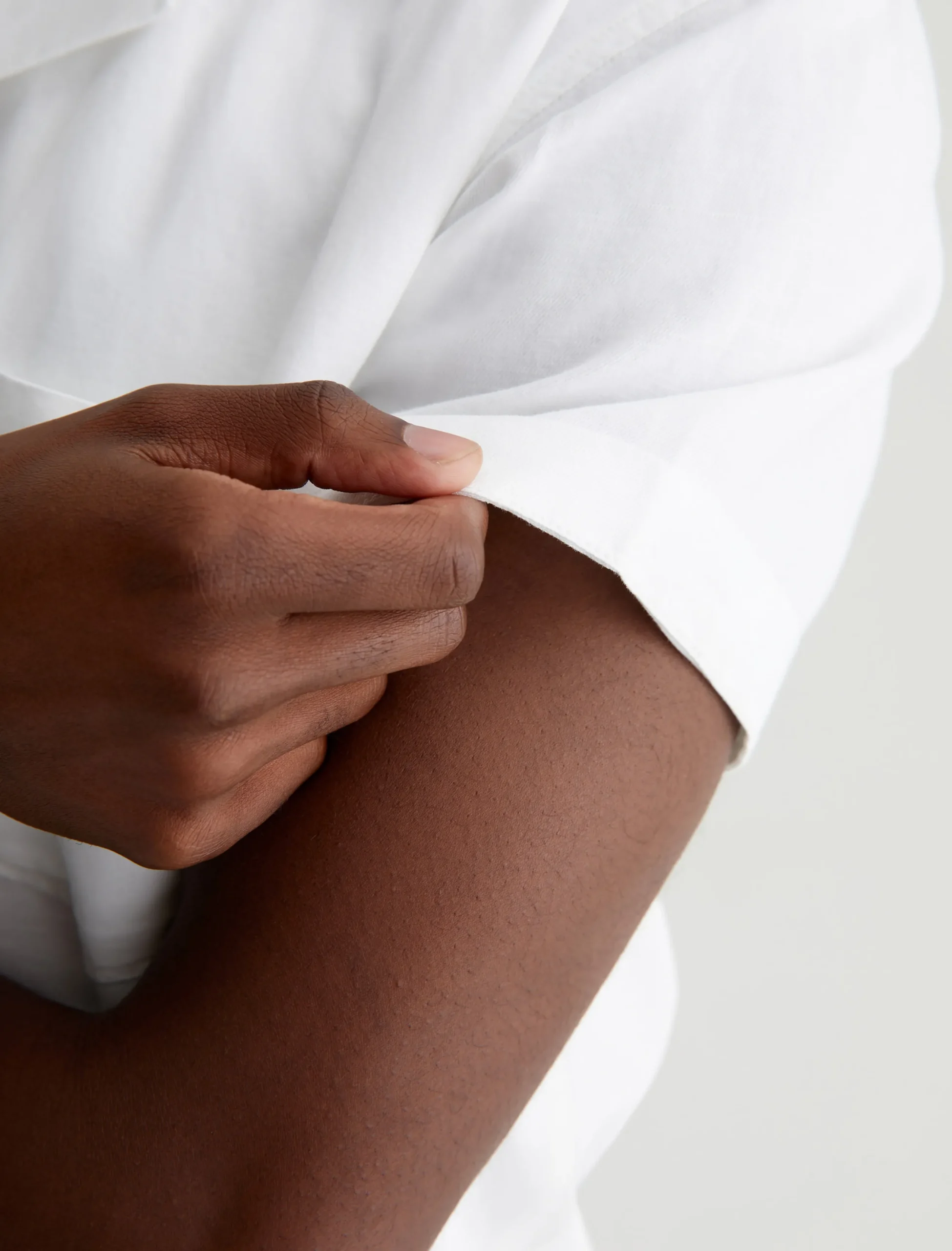 The Foster Shirt is a summer-ready camp collar style with short sleeves, buttons up the front, and a single chest pocket. Made from a lightweight blend of cotton and linen in white, it’s cool and casual yet easy to dress up.