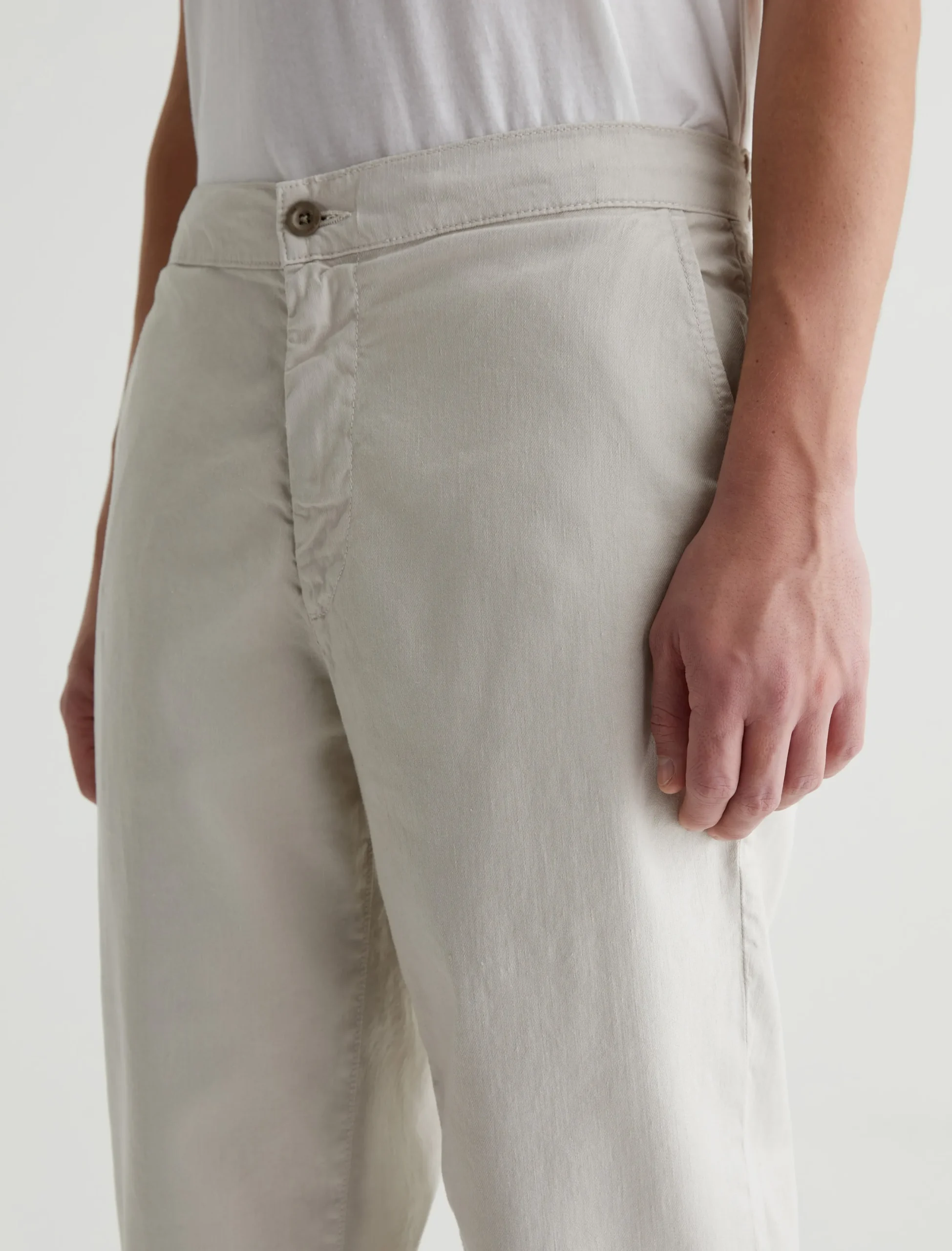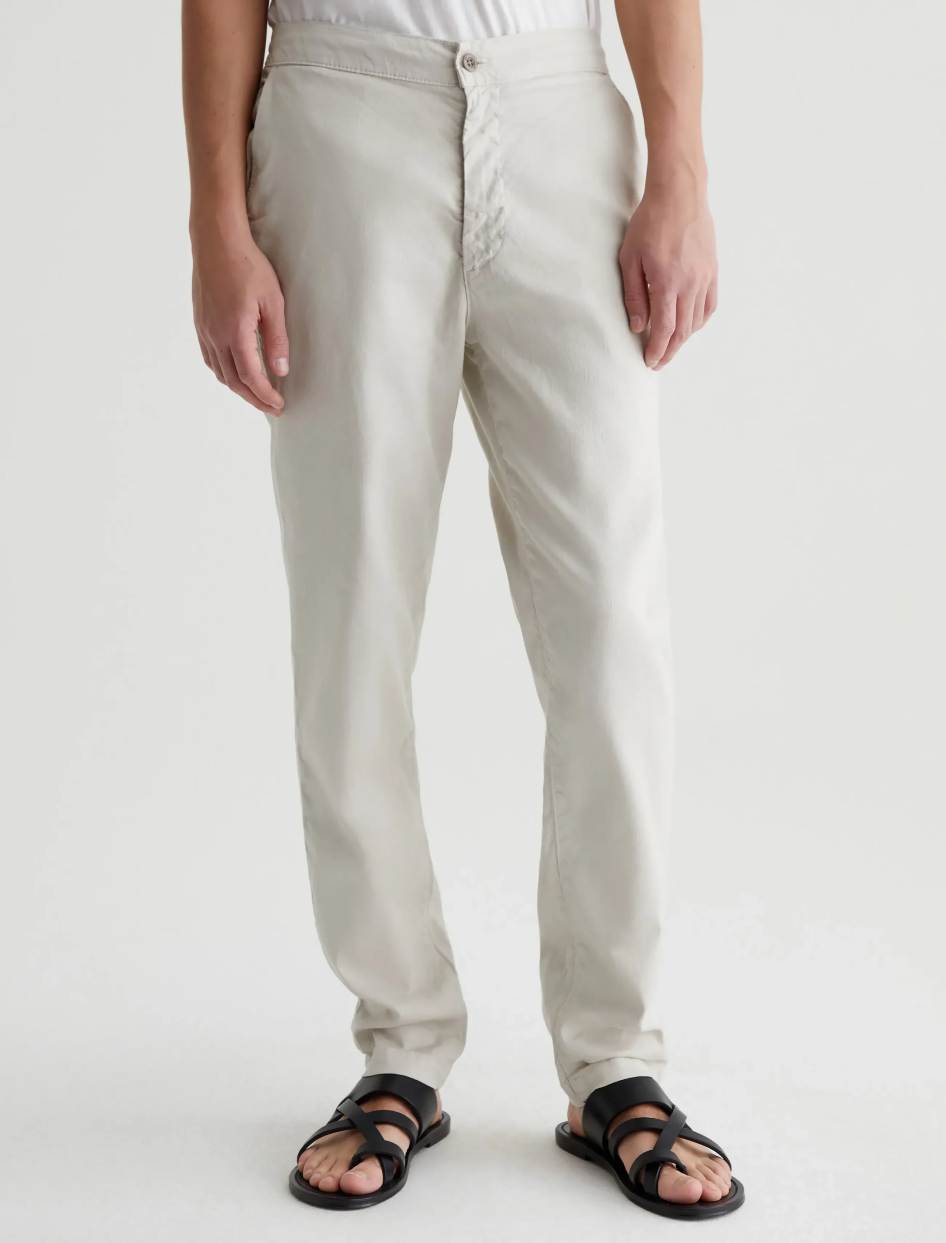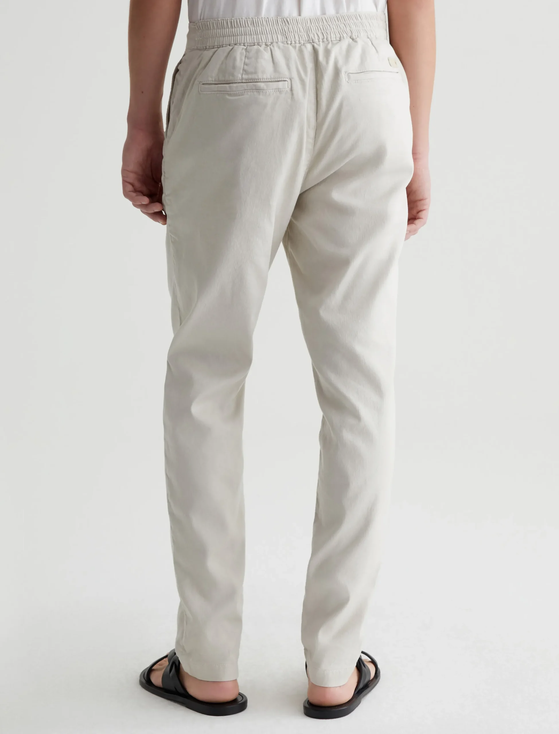 Our Garreth slim-cut jogger pants have a relaxed, airy feel in stretch-blend linen twill. The pale grey pair has trouser-style pockets and a partially elasticized waistband with a zip fly, button closure, and adjustable drawstring.