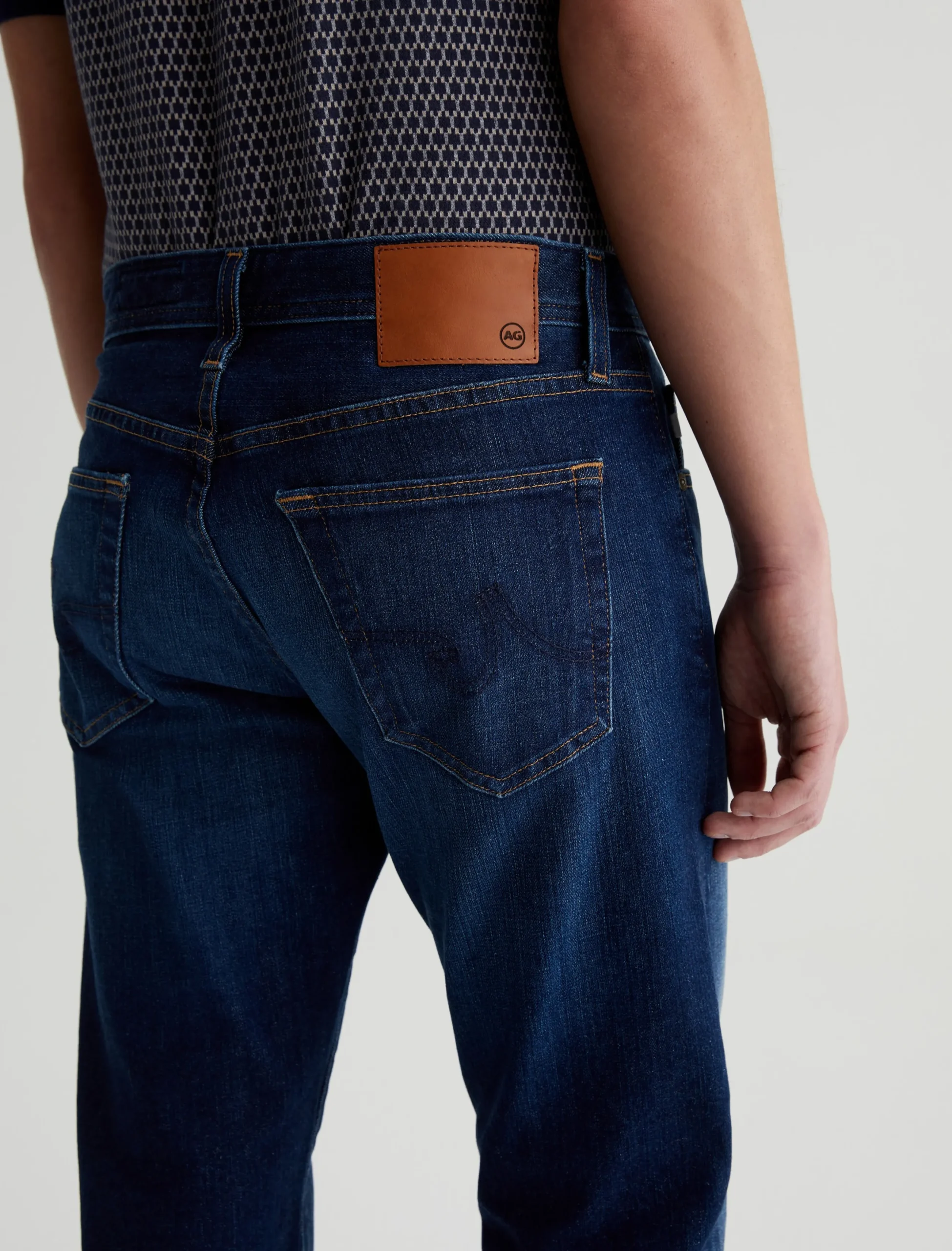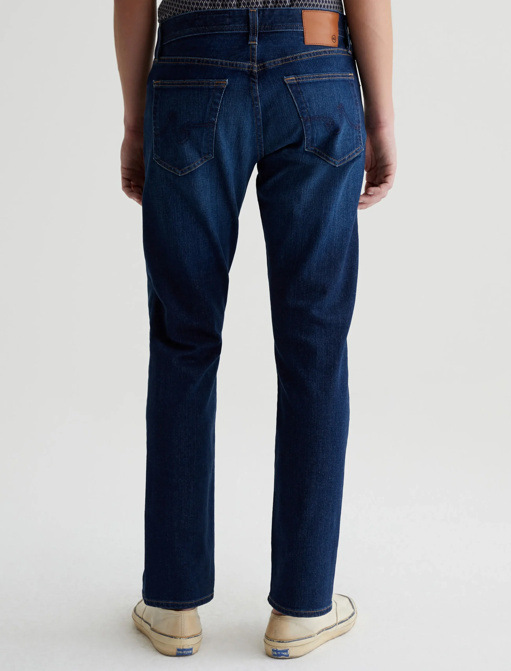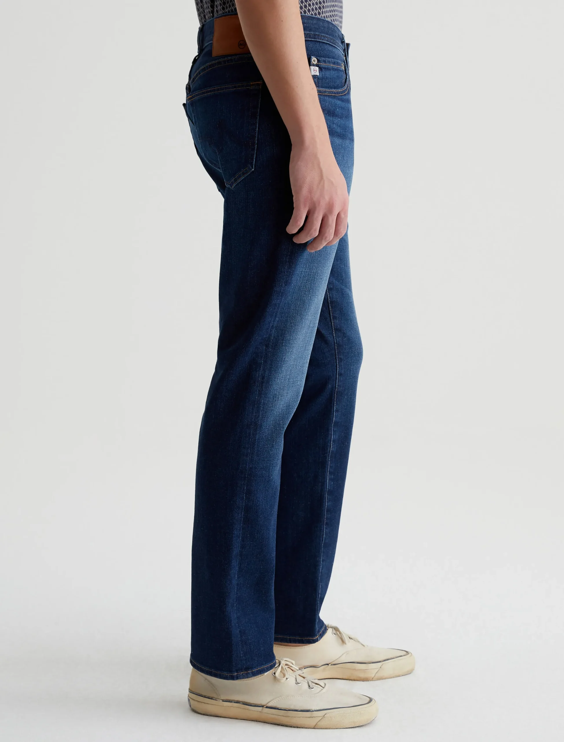 The Graduate is a tailored leg jean for men, done here in a dark blue wash with fading and whisking. Made from ultra-comfortable 11.5 oz. 360° Denim, these 5-pocket jeans have a slim mid-rise waist and a relaxed fit from the hip to knee before tapering at the leg opening. Finished with classic marigold stitching.