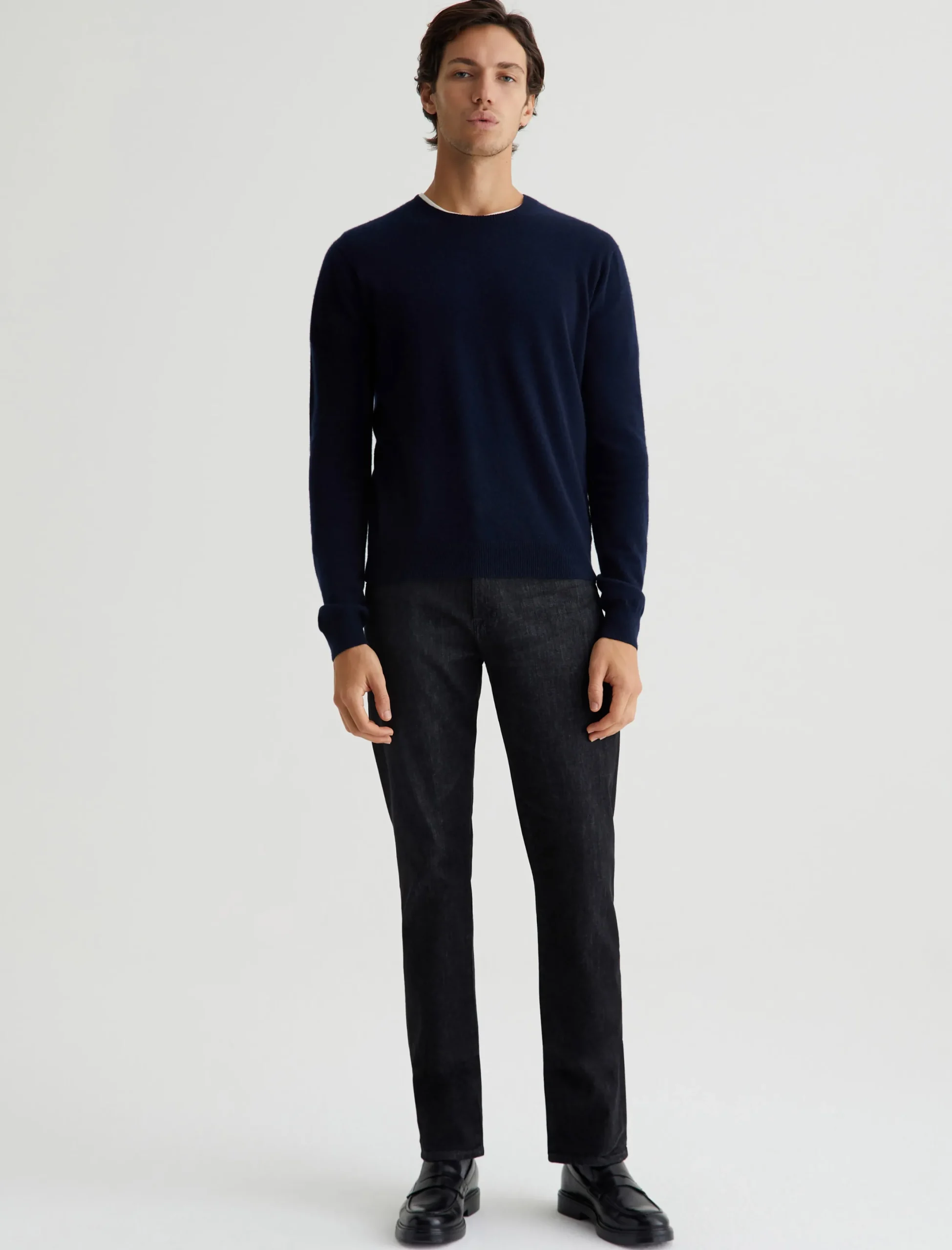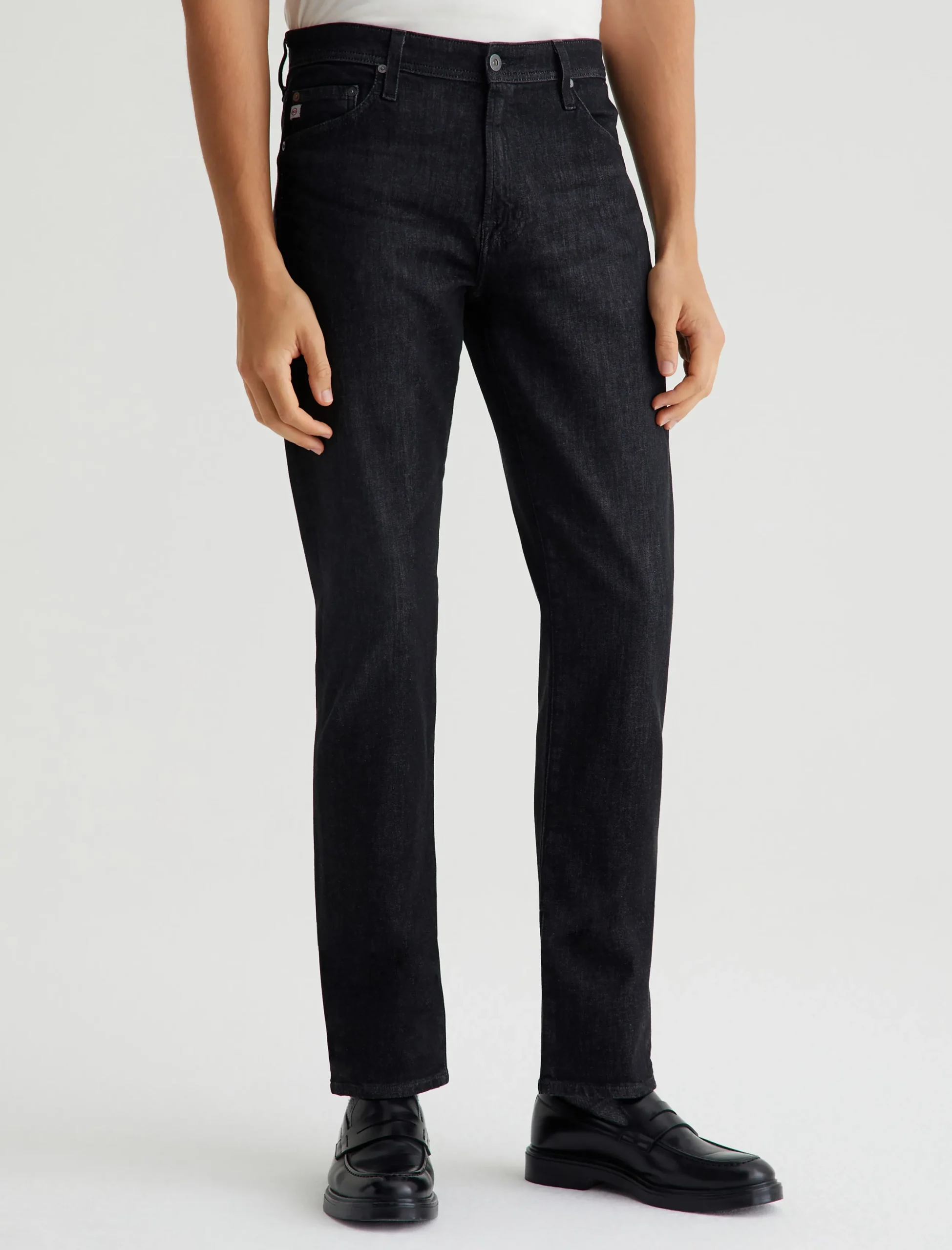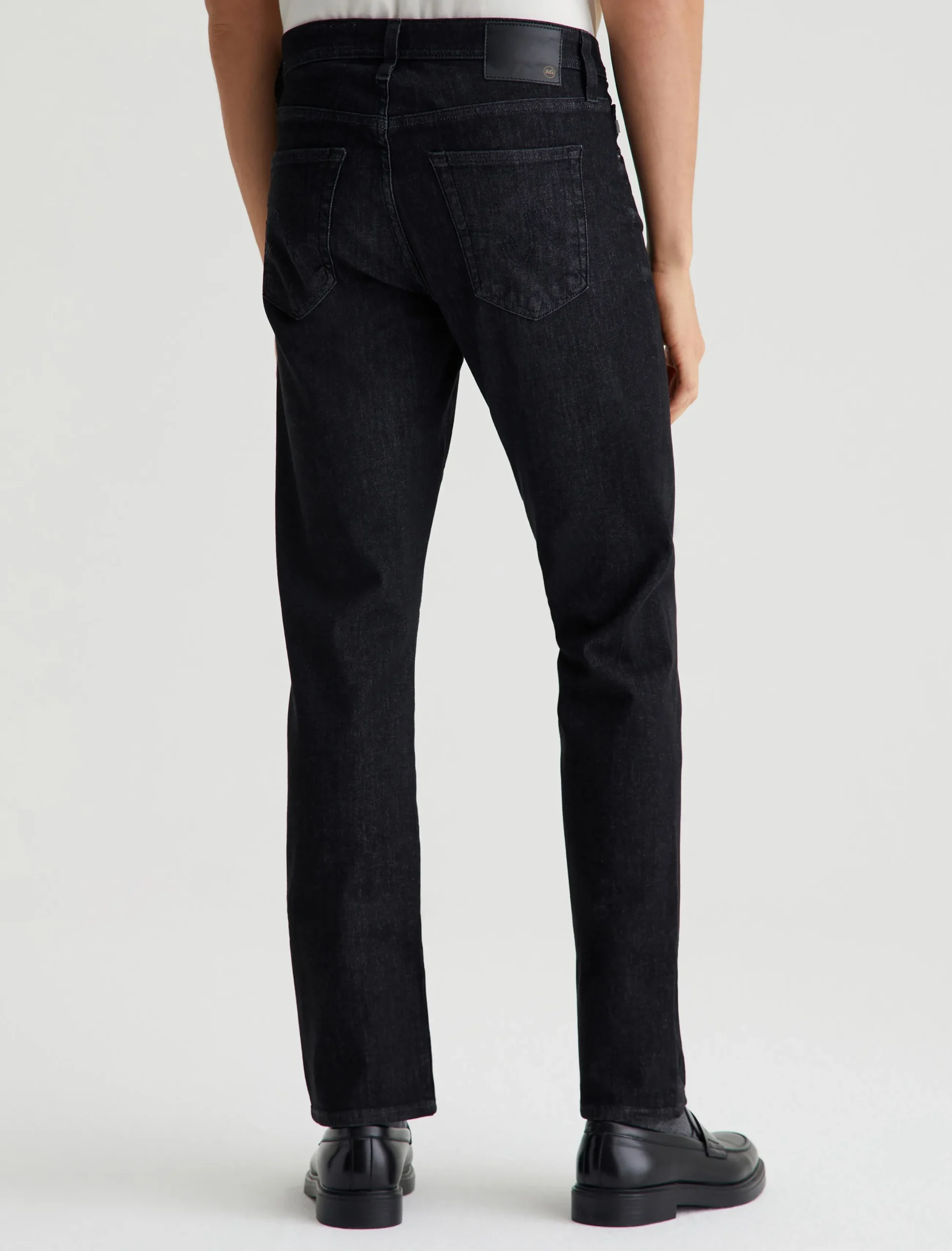 Graduate is a tailored leg jean for men, designed in 10.5 oz. Infinite Bi-Stretch Black denim with subtle whiskering. Cut with a slim mid-rise waist, the five-pocket style has a relaxed fit from the hip to the knee before tapering down at the leg opening.