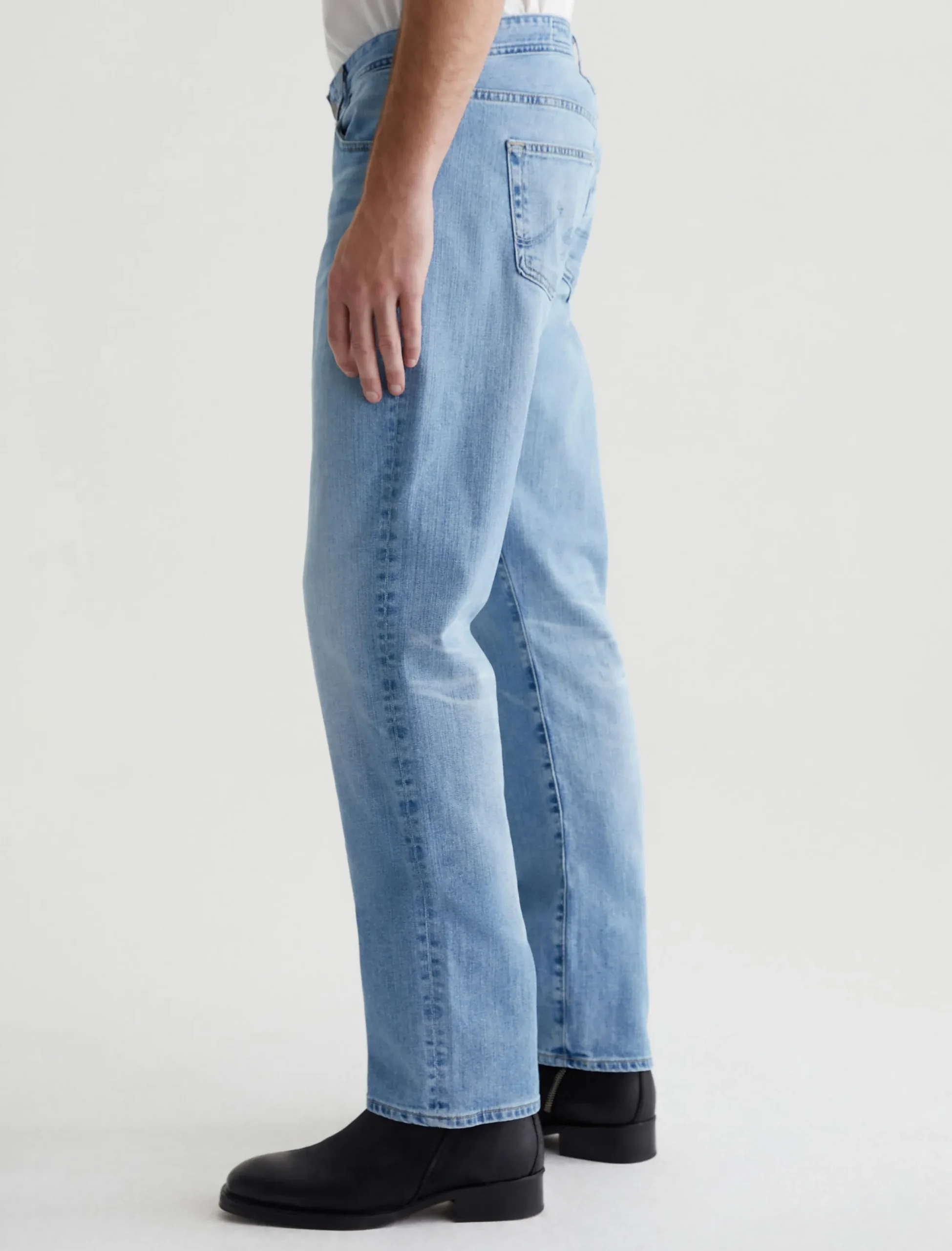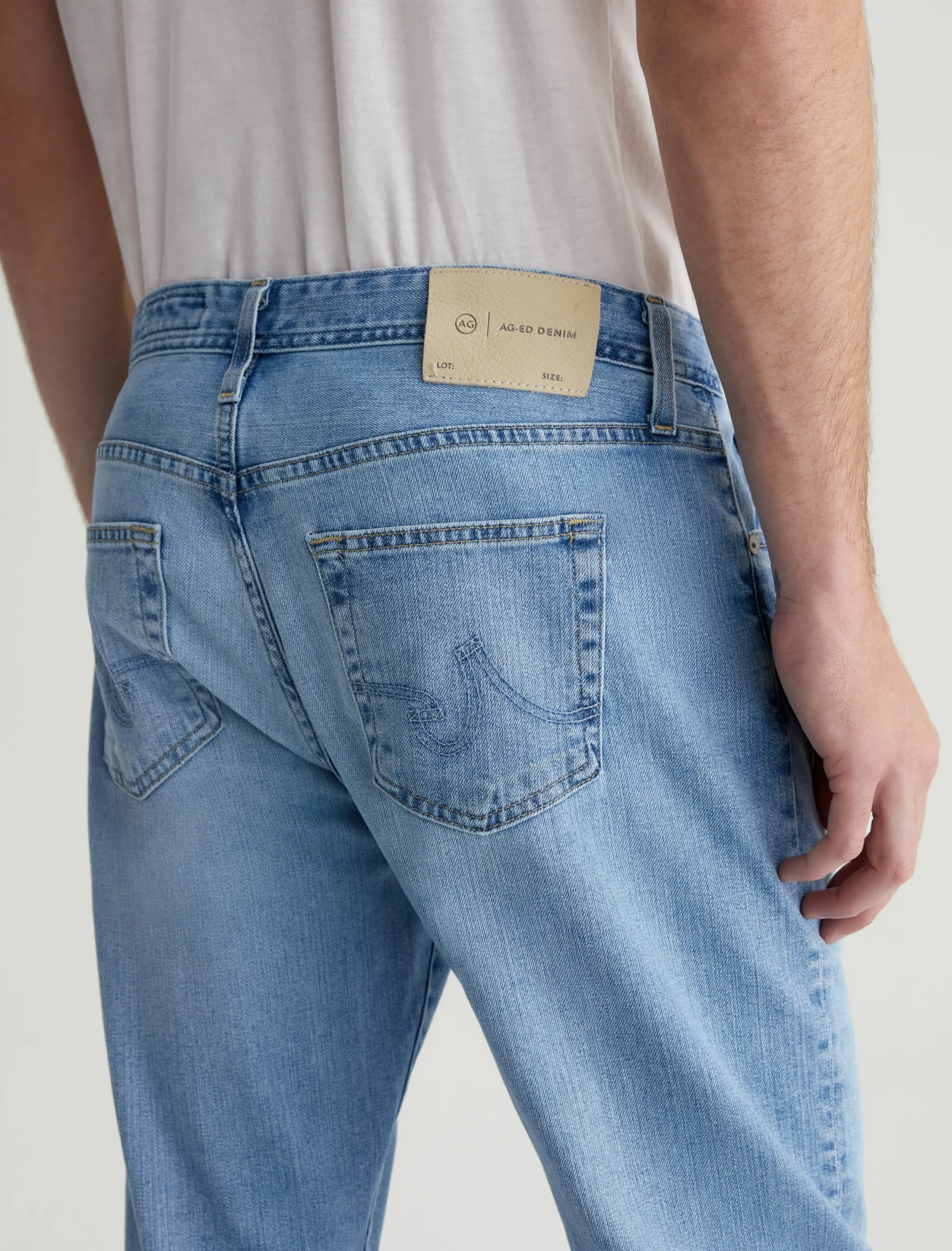 The Graduate is a tailored leg jean for men. It’s done here in 11 oz. Lead Denim with comfort stretch and an AG-ed™ light indigo wash that mimics 21 years of vintage wear. These men’s jeans are cut with a slim mid-rise waist and a relaxed fit from the hip to knee before tapering at the leg opening.