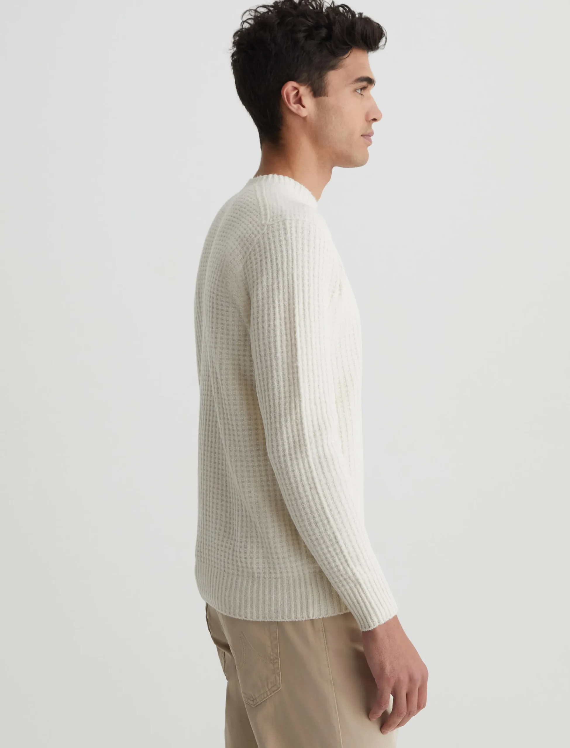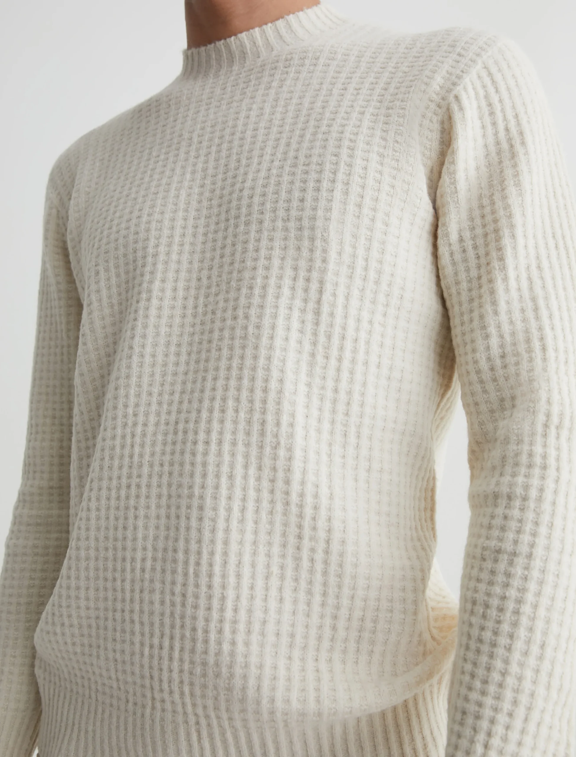 The Jayson Crew is a slim-fit crewneck sweater with long sleeves, waffle detailing, and a versatile ivory shade. Spun from a soft blend wool, it’s a luxe staple to wear on its own or layered under a jacket.