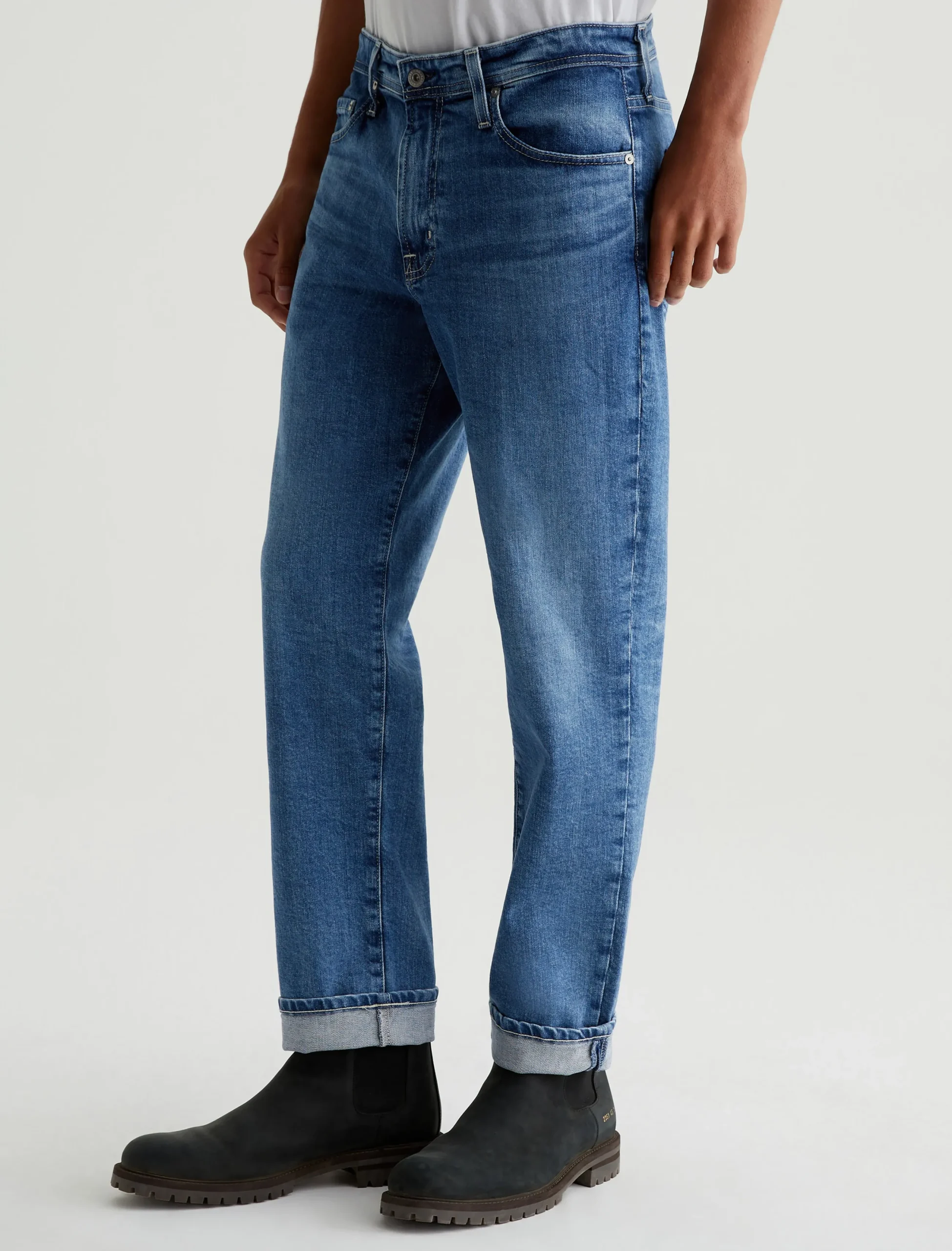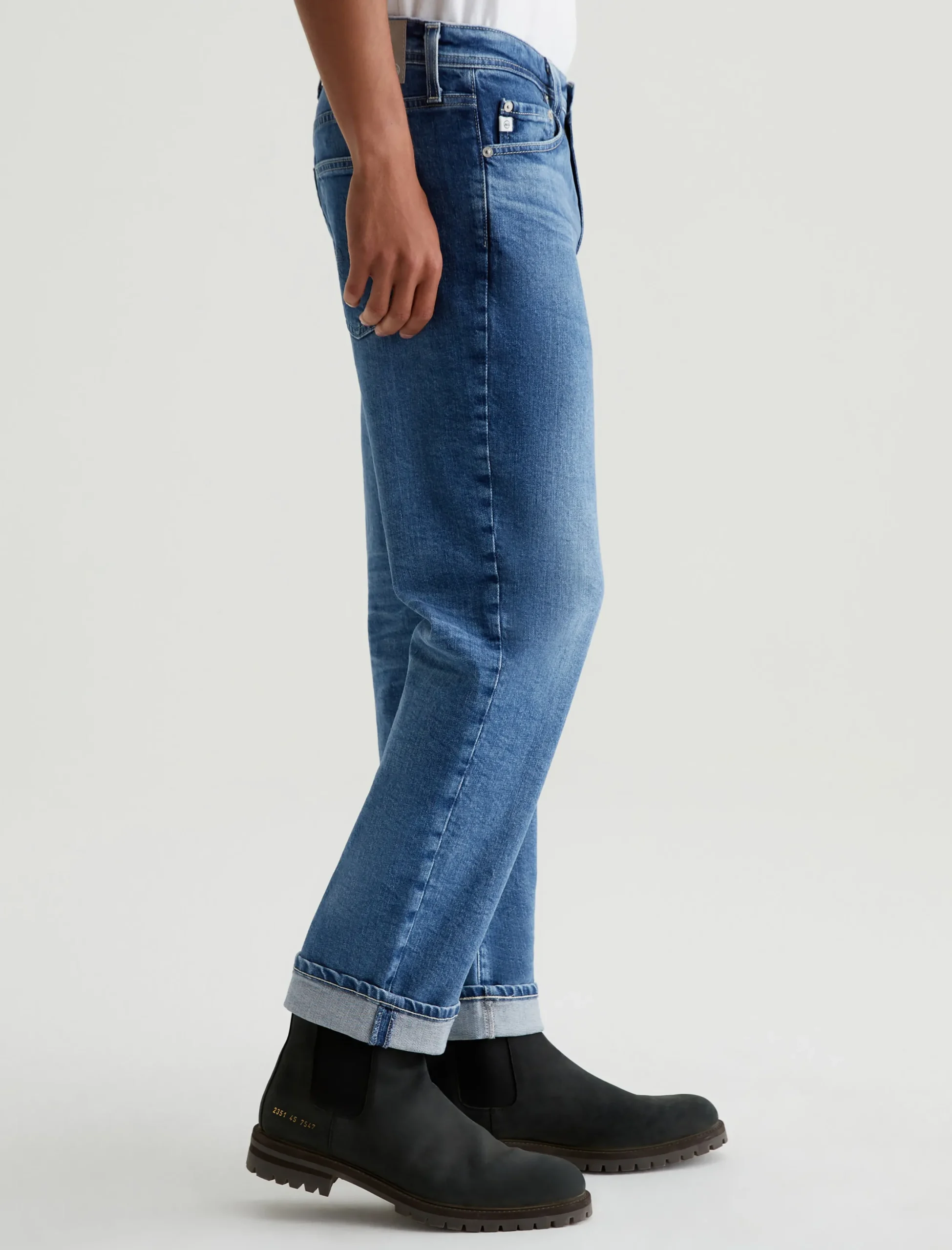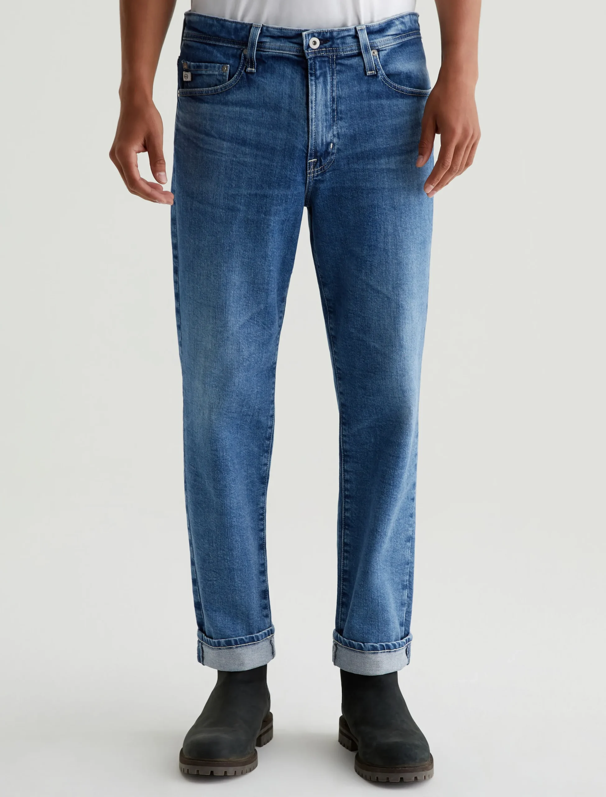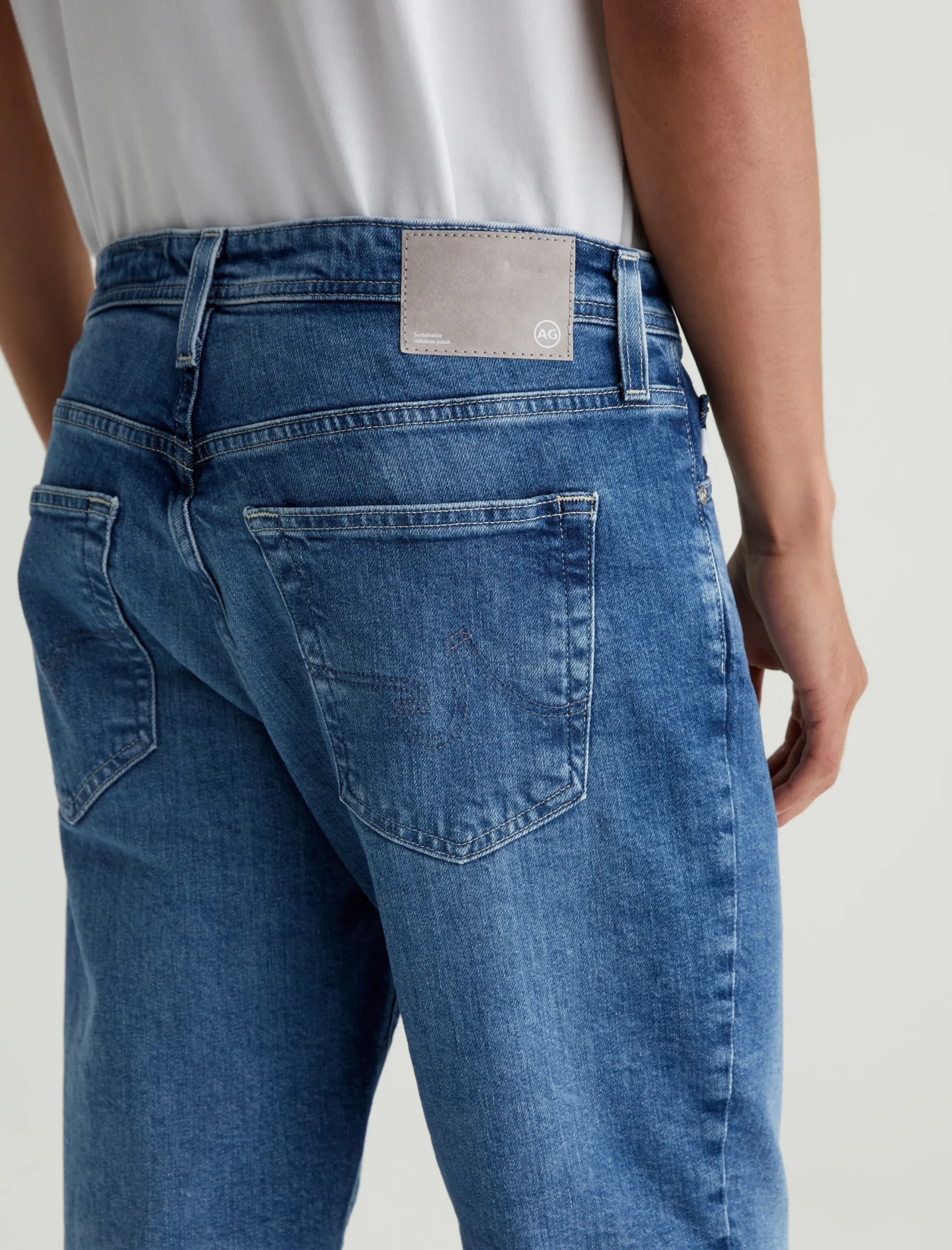 The Kace 28 updates our classic straight fit in a slightly cropped length that’s easy to wear cuffed. Crafted from 11.75 oz. Vintage Comfort Stretch Denim, the pair here features a medium indigo shade achieved through eco-friendly AG Vapor Wash™ technology. These men’s straight-leg jeans have a mid-rise waist and a relaxed fit from hip to knee before tapering at the leg opening. Our AG Vapor Wash™ process significantly reduces the use of water, chemicals, and energy to lessen environmental impact. Finished with a vegan and 100% biodegradable cellulose patch at the back waistband.
