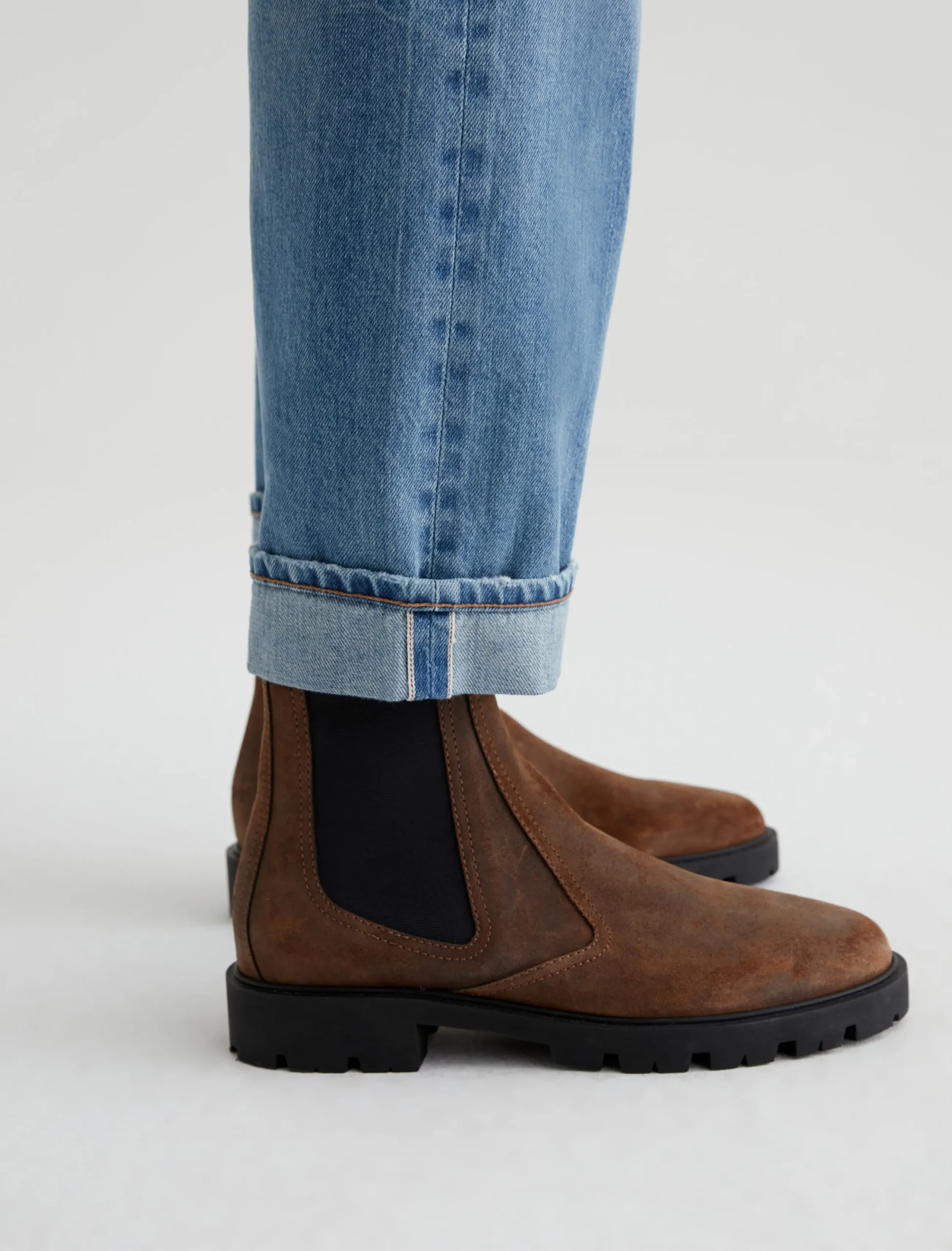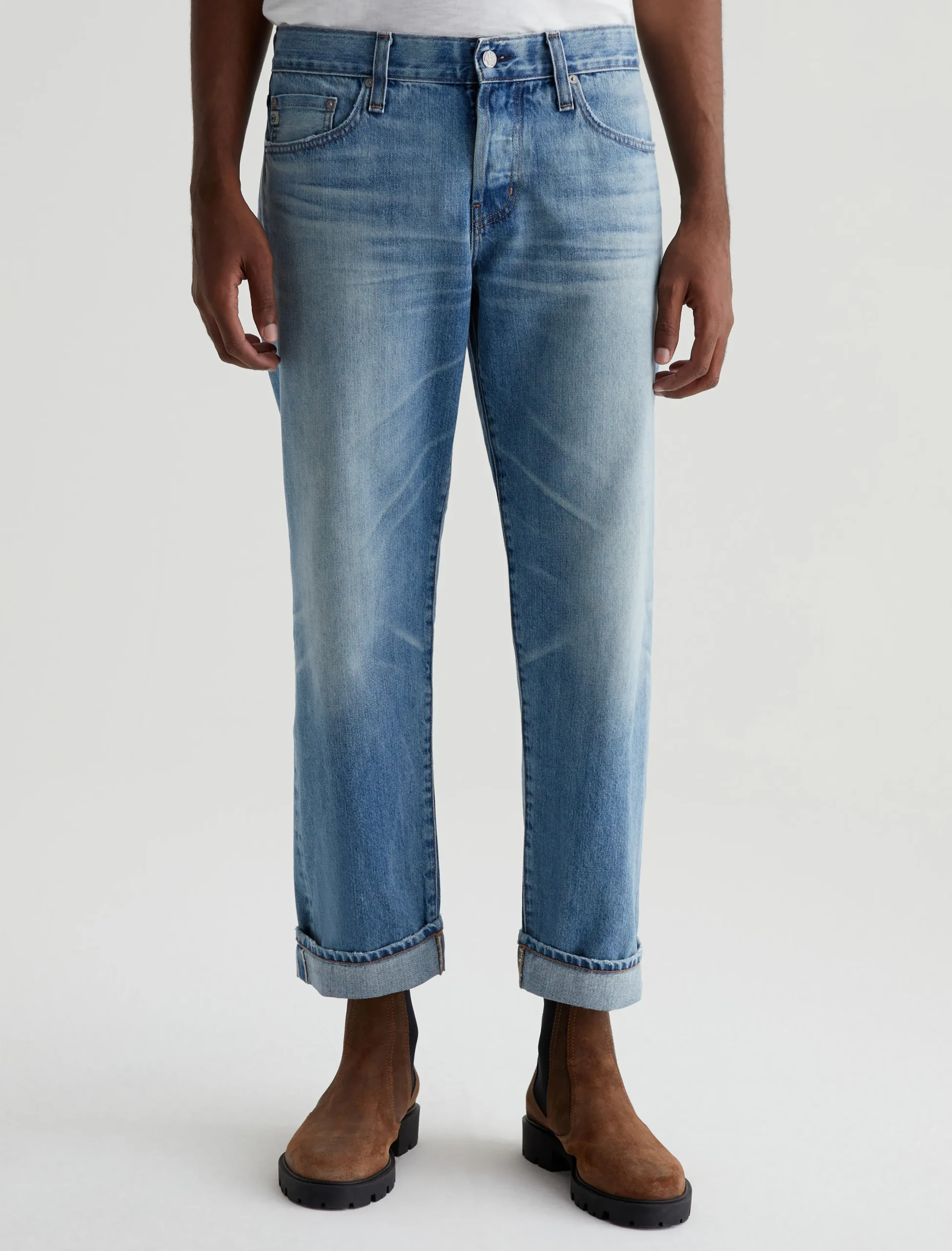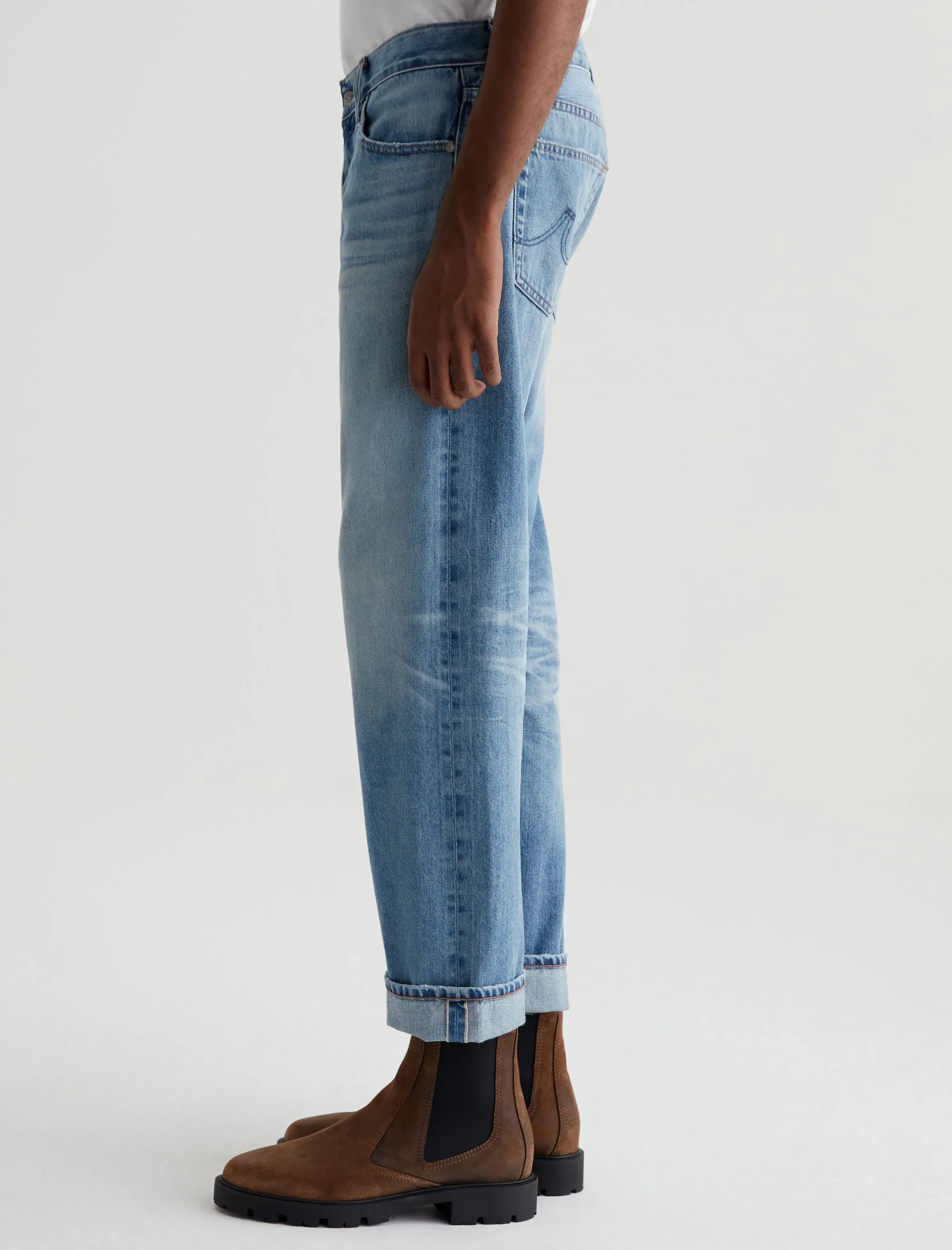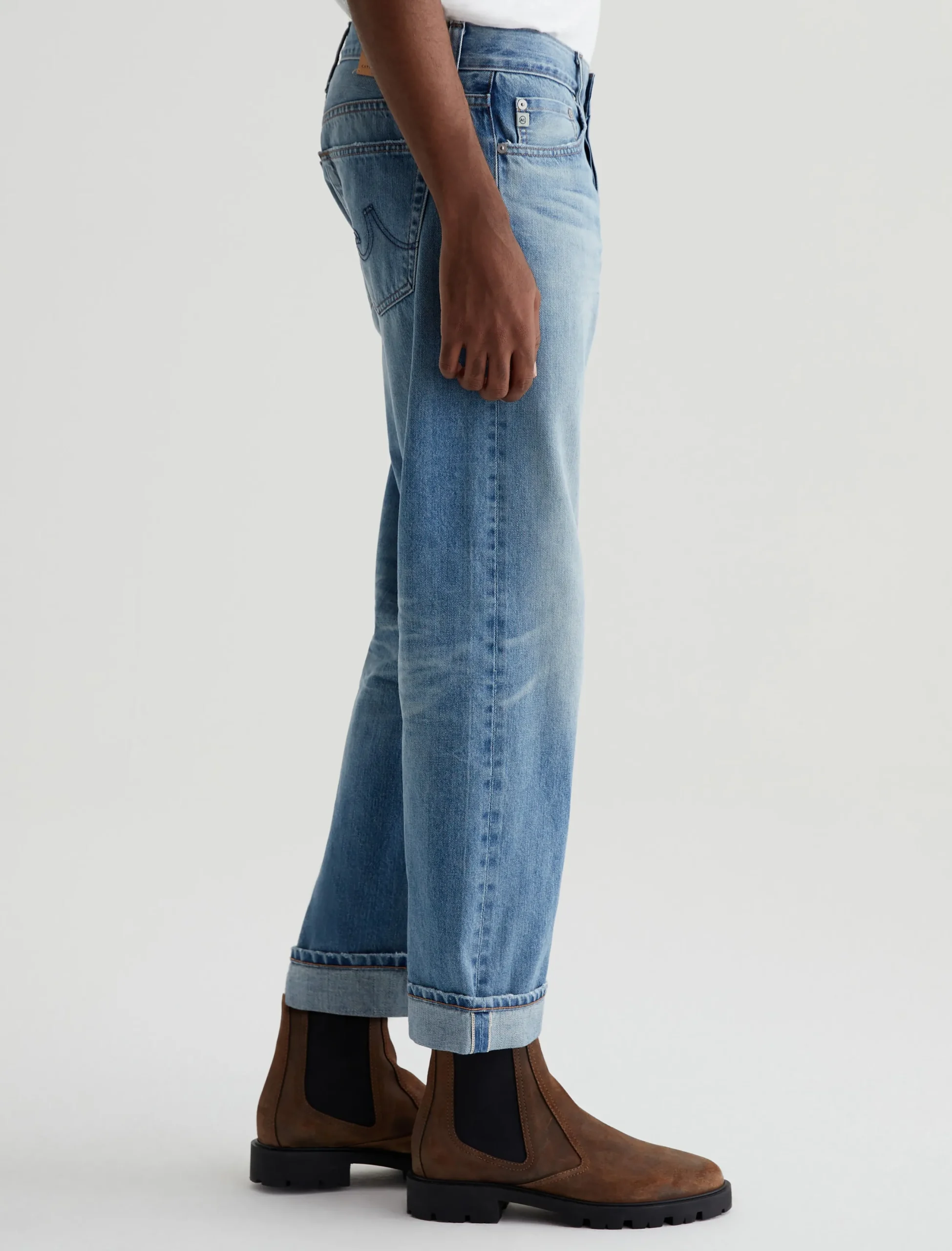 Kace is a modern straight-leg jean, updated here with a button fly, cropped inseams, and an AG-ed™ medium indigo wash with a 16-year fade. Anchored by a mid-rise waist, the style has a relaxed fit from hip to the knee before tapering to a cuffed leg opening. These 5-pocket men’s jeans are designed in Robechetto Rigid Selvage Denim from Italy and feature subtle wear at the edges for a naturally lived-in character.