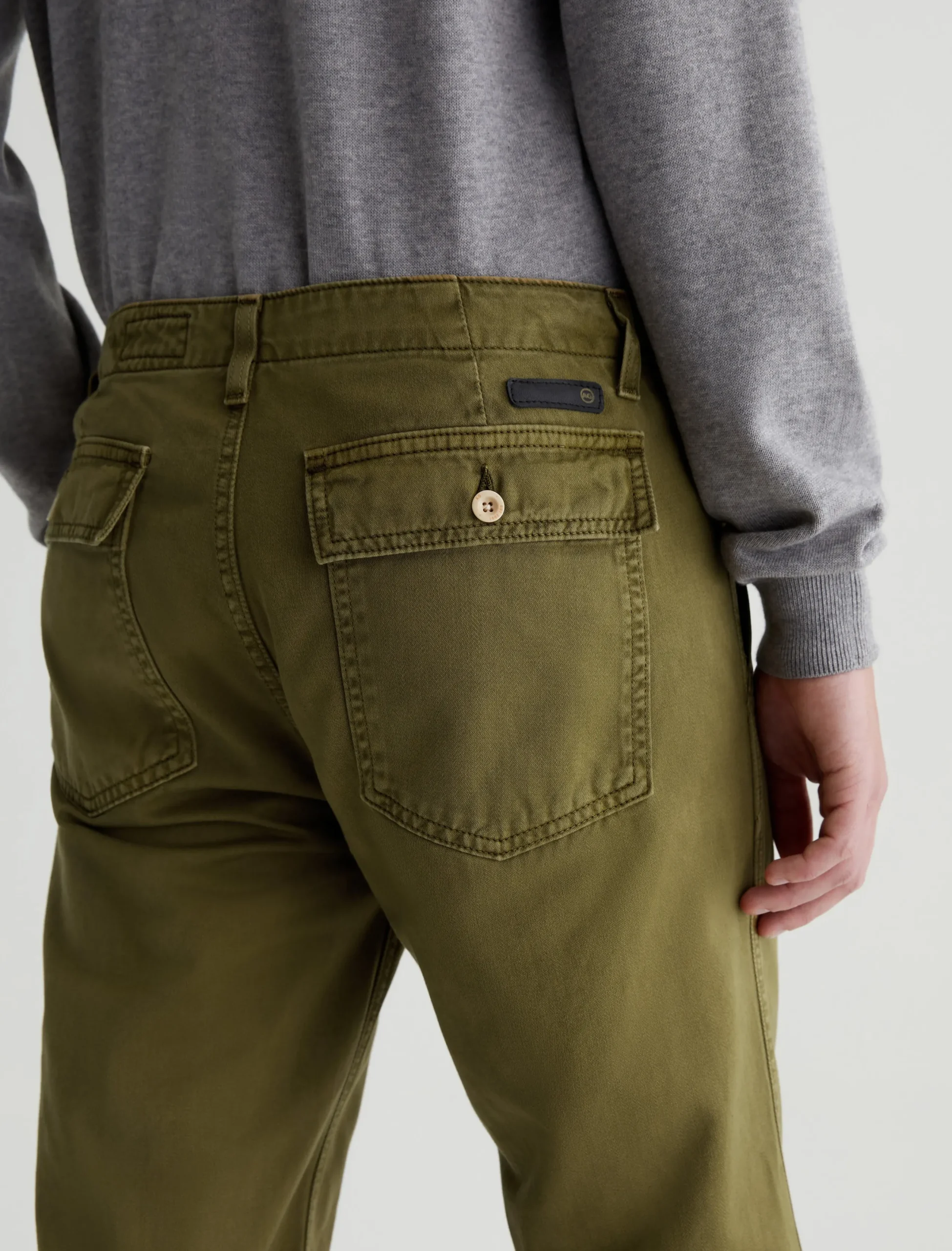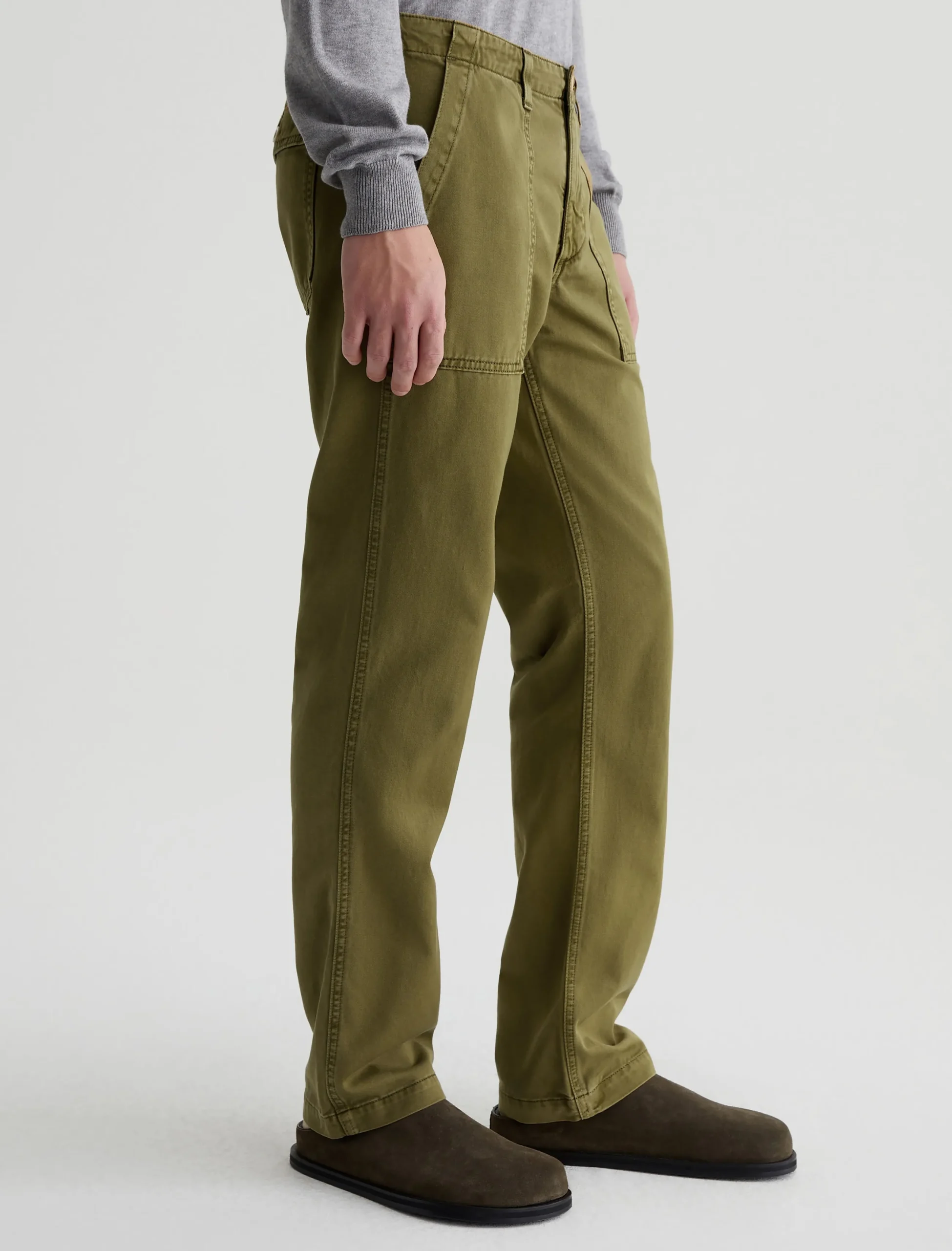 Our Kace Fatigue pants feature a classic straight-leg silhouette with utility-inspired pockets. Crafted from 7 oz. Sternway Sheen Sateen, this pair features 100% cotton in a sulfur-dyed army green shade. The style has a mid-rise waist and a relaxed fit from hip to the knee before tapering at the leg opening.