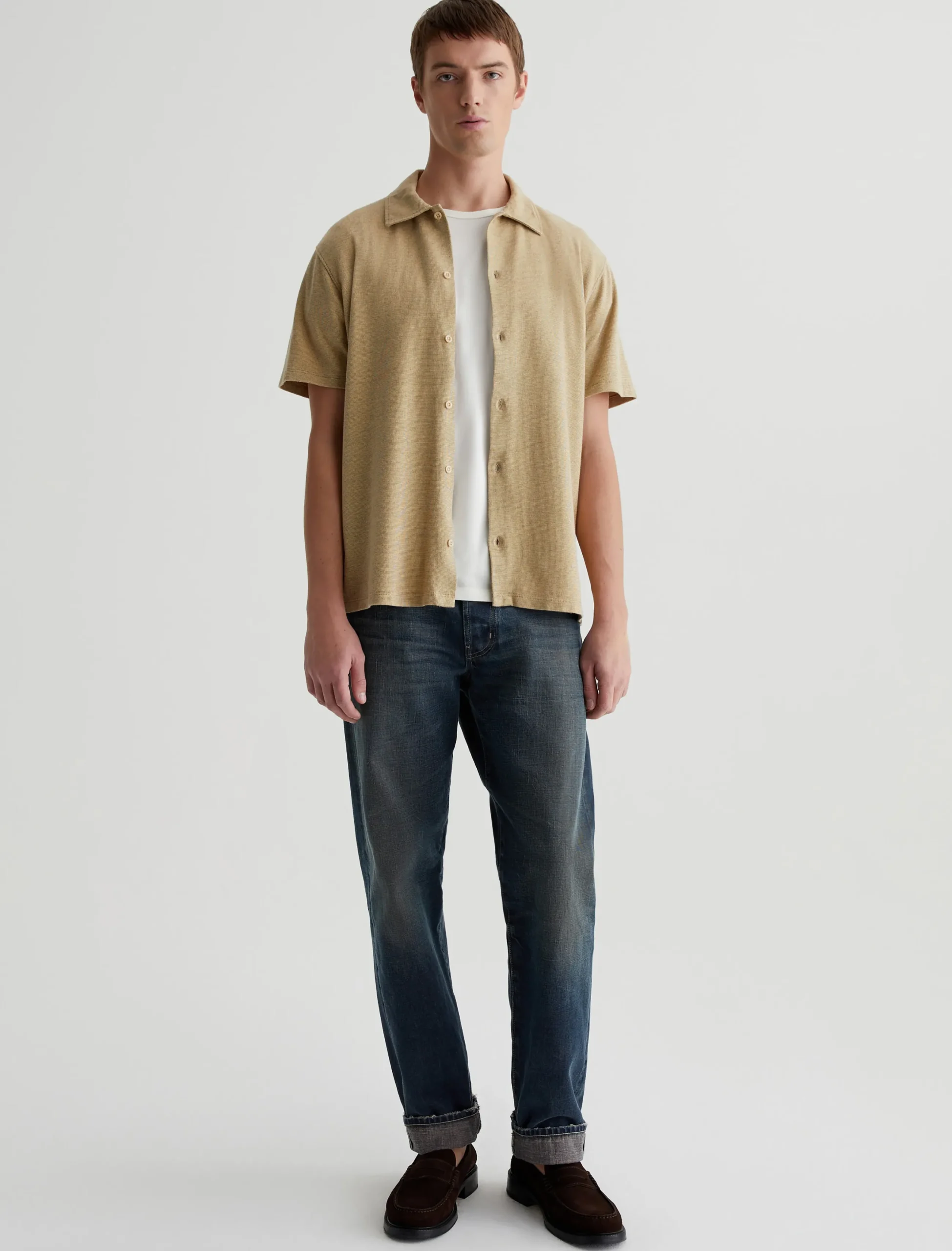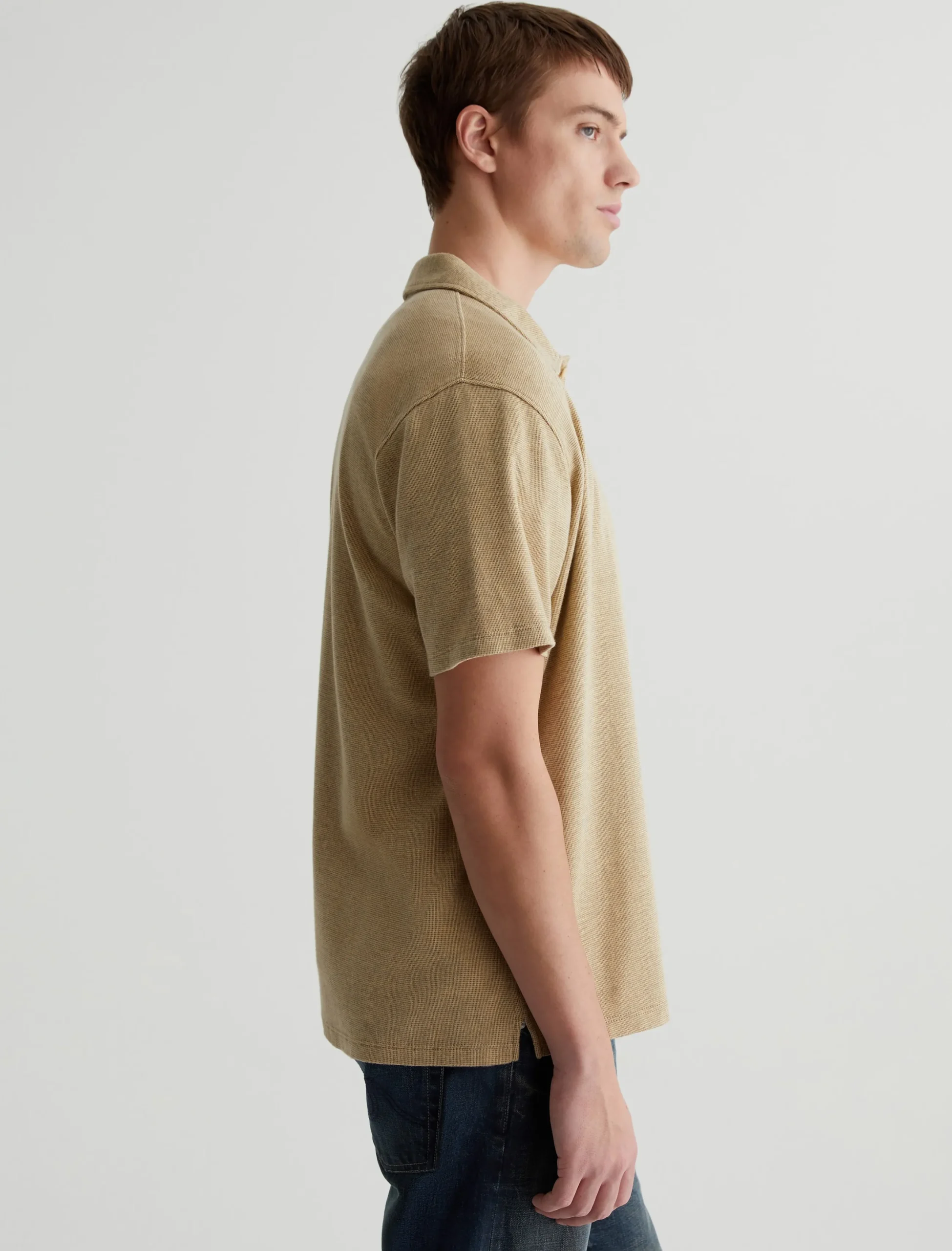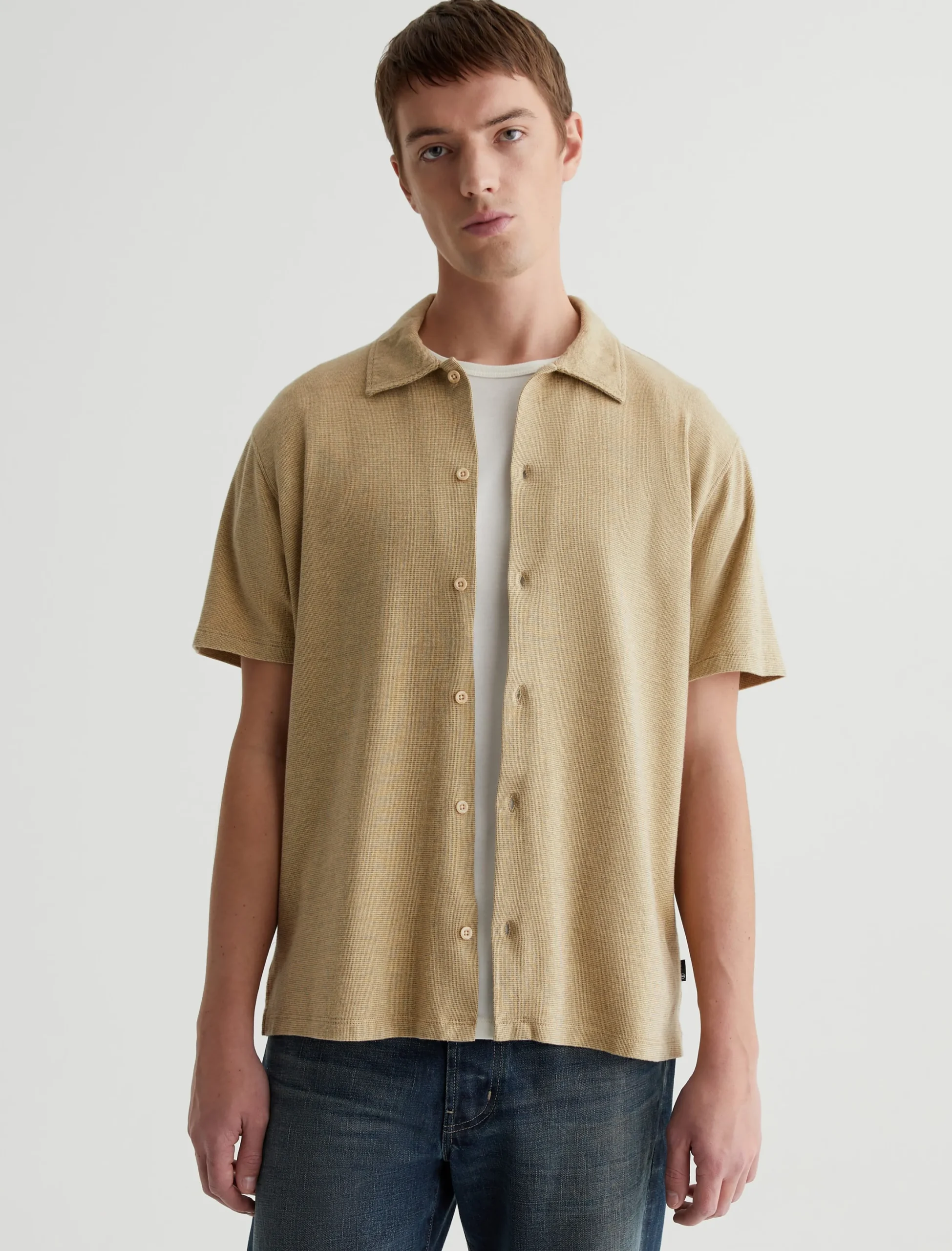 Our Nathaniel knit button-up shirt has casual polish that works well with denim, chinos, or tailored shorts. Made from Luxe Jacquard in breathable cotton, it’s got a relaxed fit with short sleeves and a two-tone stitch pattern.
