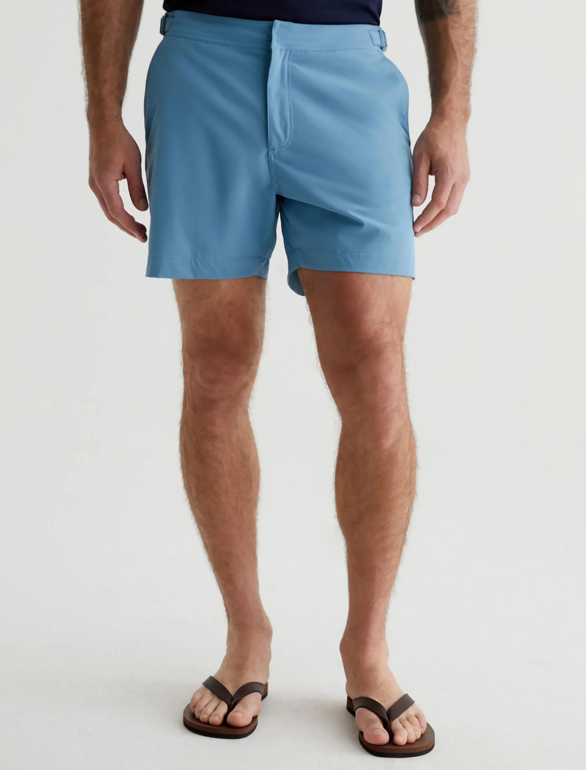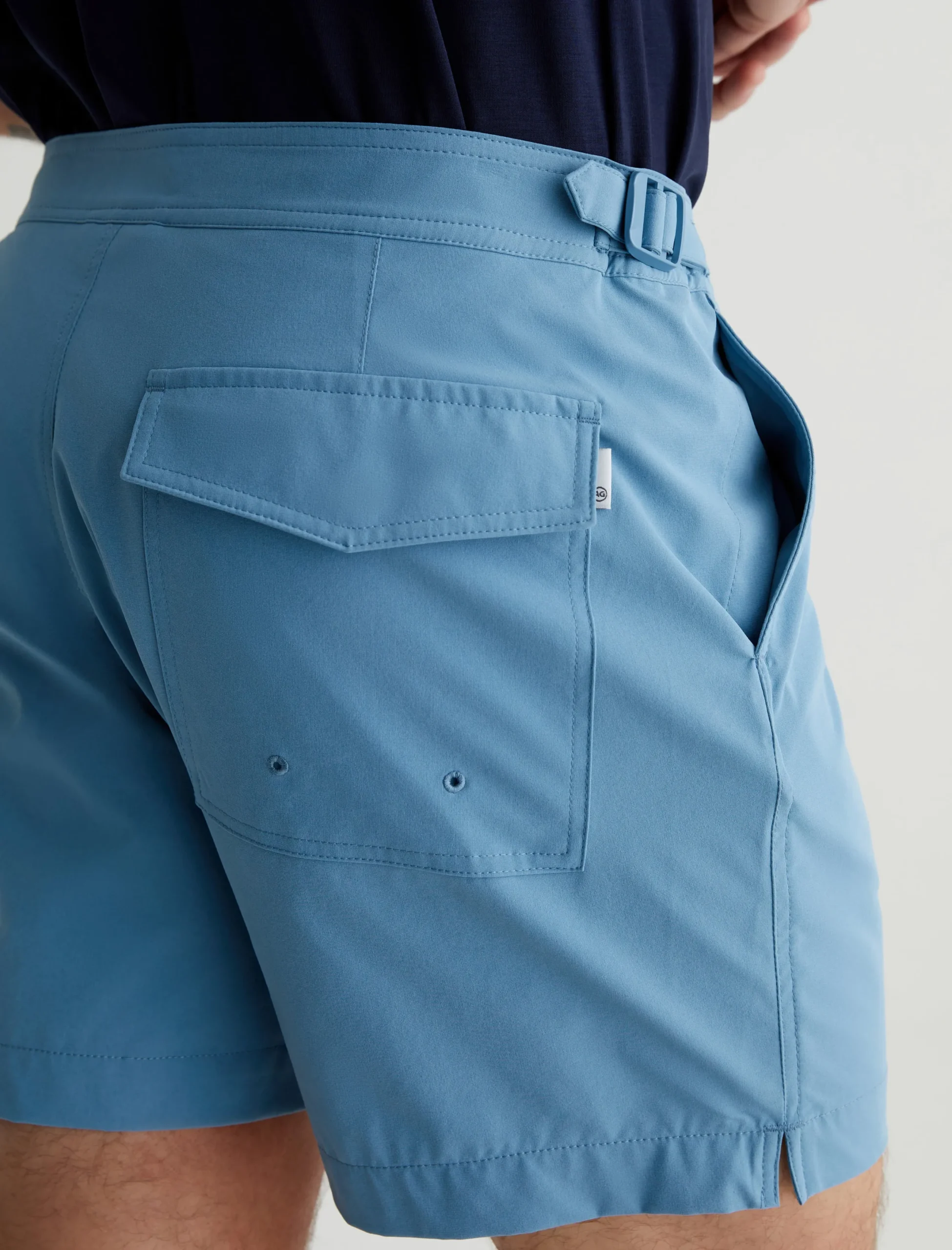 The Pace Active Performance Trunks have a slim fit in 360° Performance Woven fabric with two-way stretch construction that’s quick drying and wrinkle resistant. These sky-blue swim trunks feature a clean waistband with a concealed zip fly and hidden snap fastening, plus bar sliders at the sides so you can adjust the fit. Complete with side slits, slant front pockets, and a flap pocket at the back. Inner mesh lining.