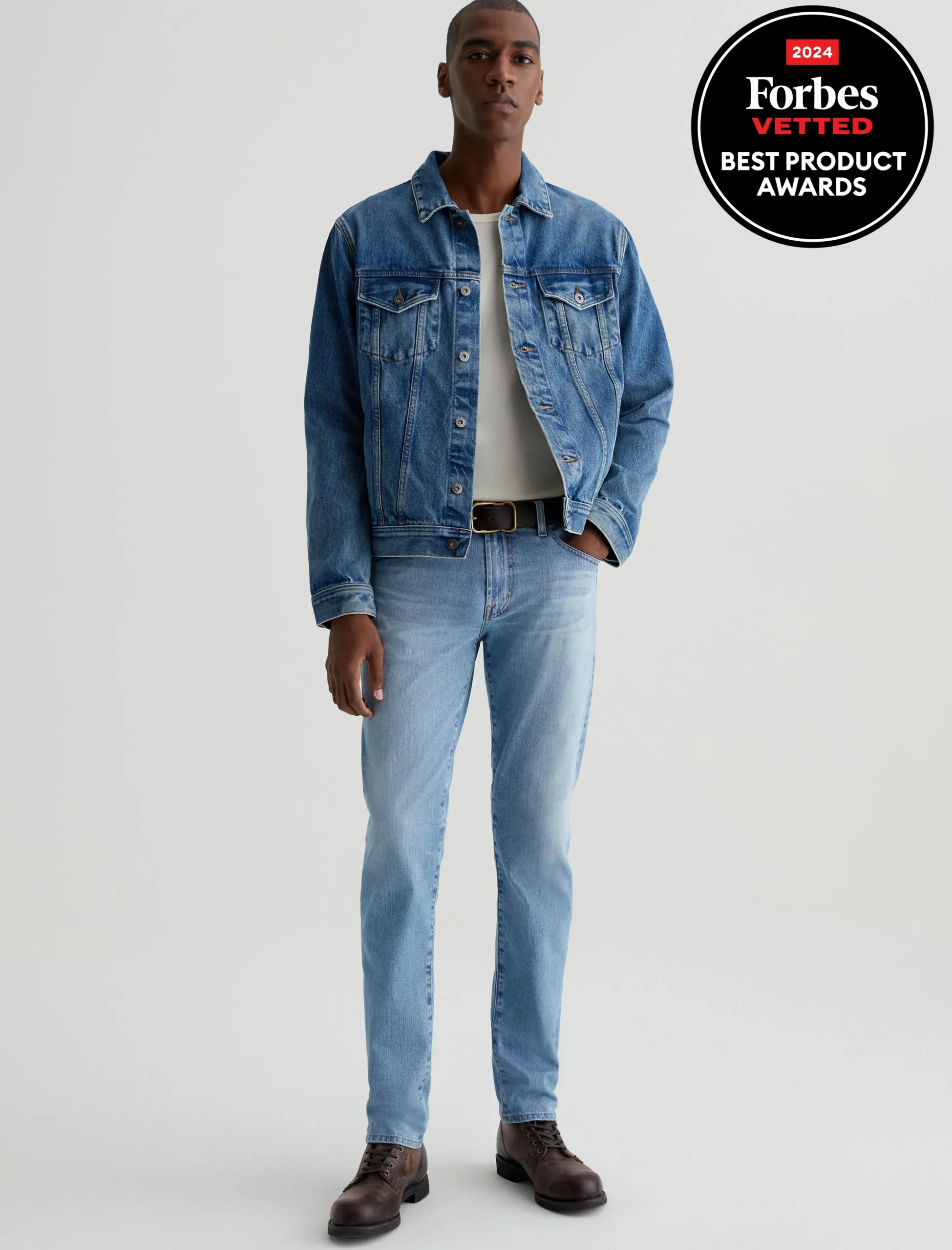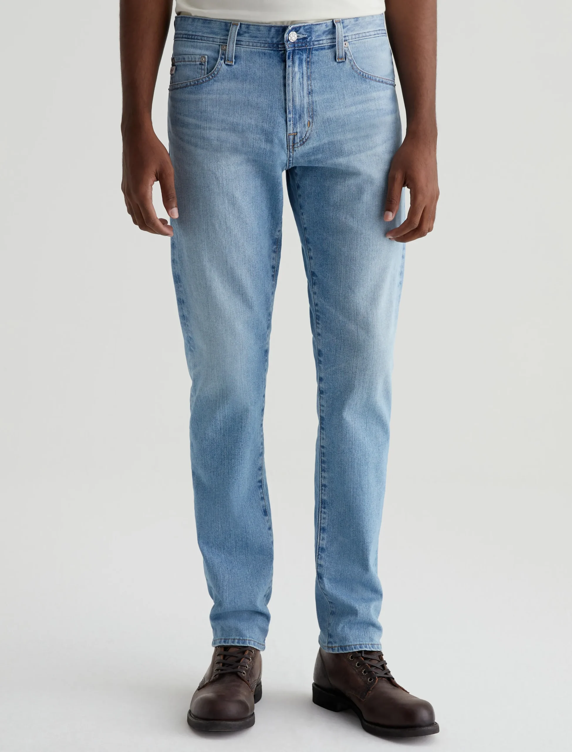 Our Tellis modern slim jean for men features an AG-ed™ light indigo wash with fading and whiskering to emulate 21 years of vintage wear. Featuring a fitted upper block and tapered leg opening, these five-pocket men’s jeans are designed in 11 oz. comfort-stretch Lead Denim.