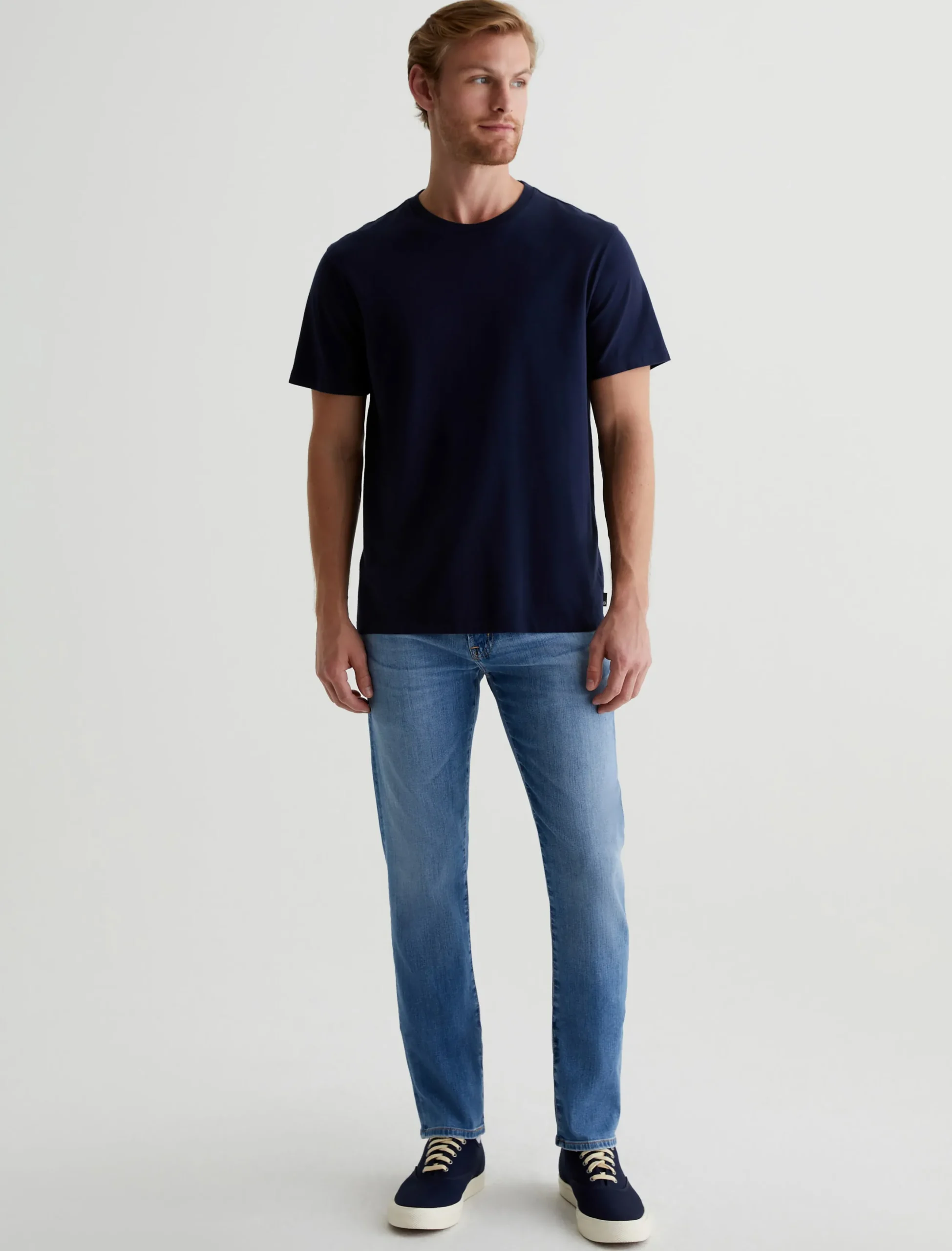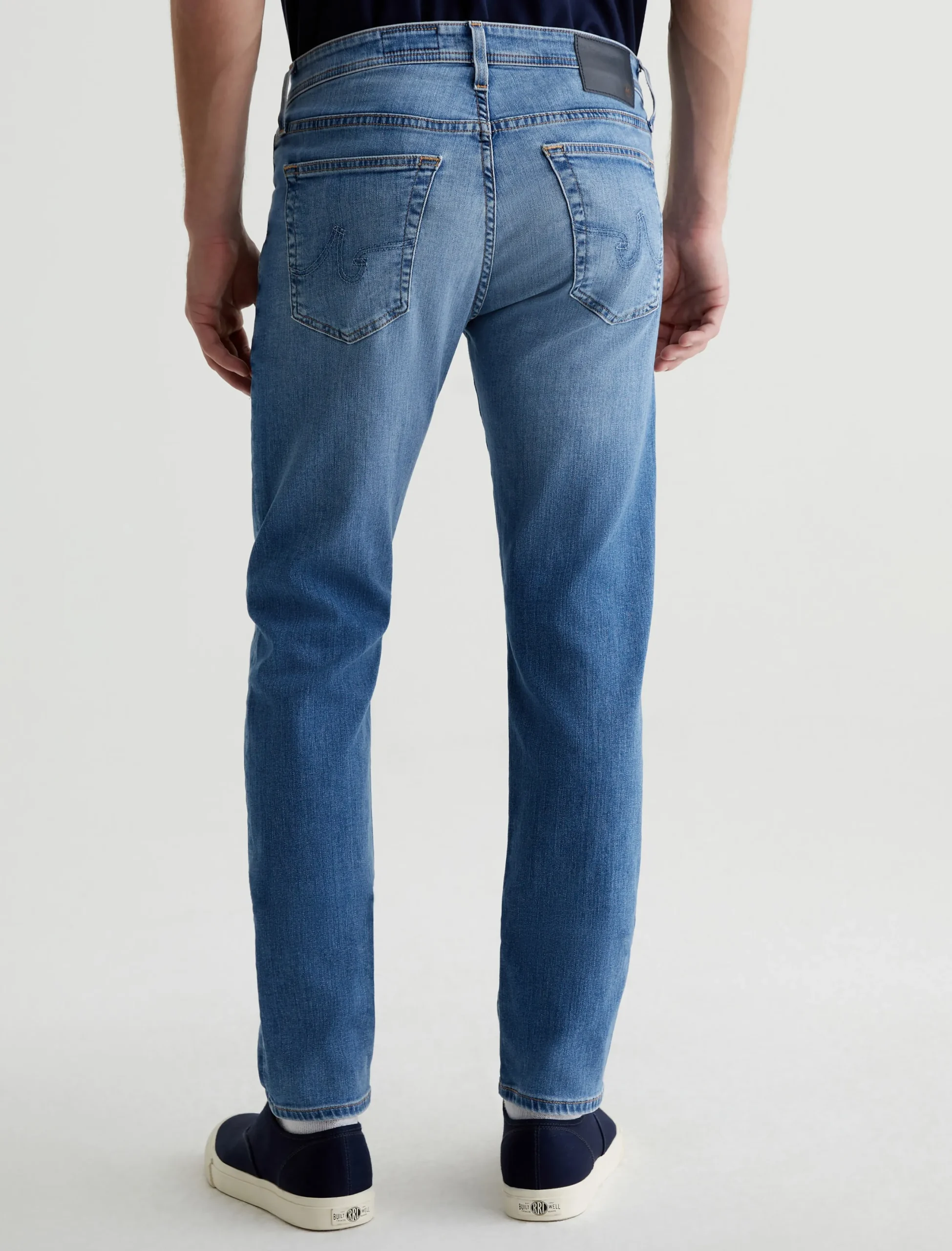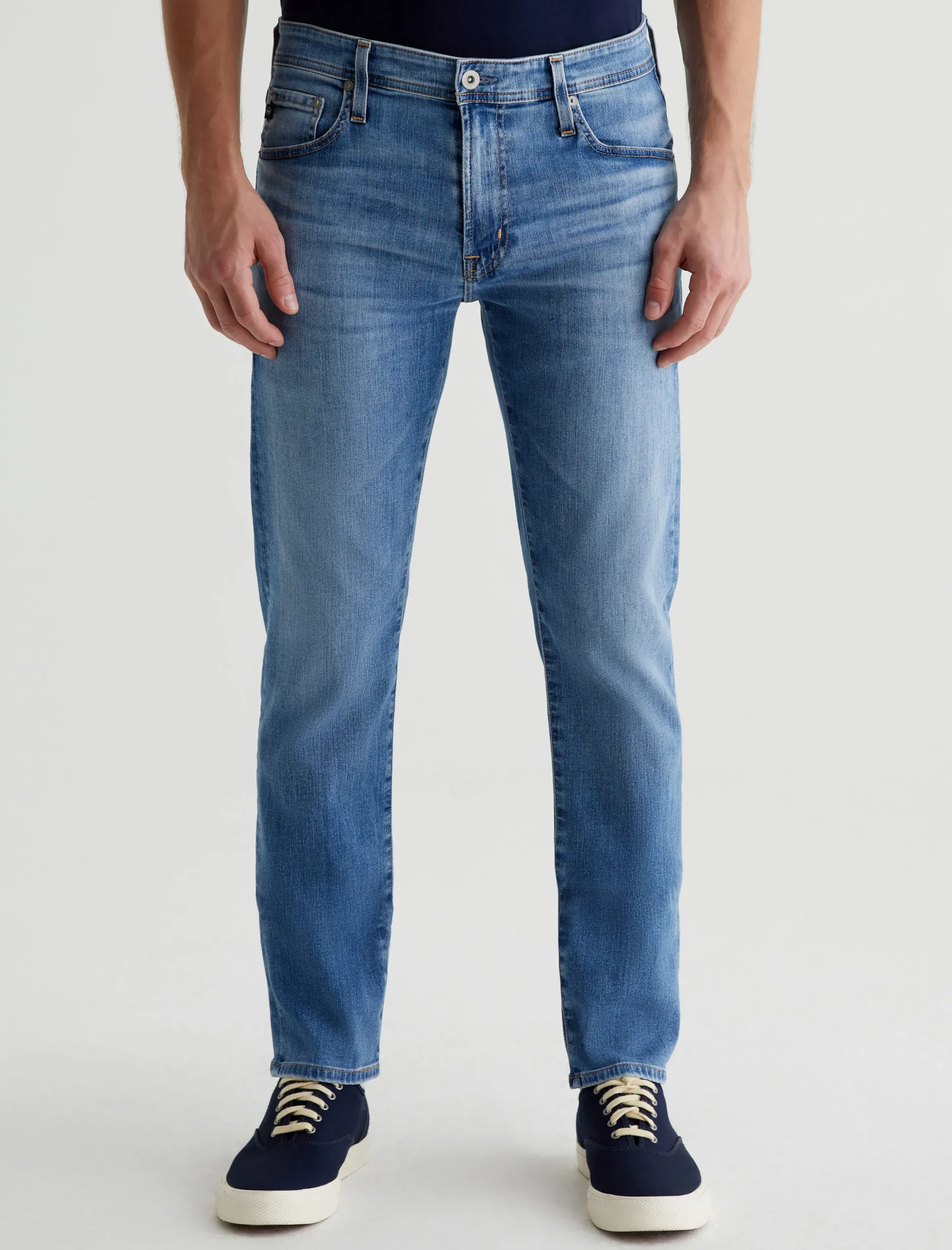 Our Tellis modern slim-fit men’s jeans feature a fitted upper block and tapered leg openings. Washed to a medium indigo shade with fading and whiskering, this five-pocket pair is crafted from AG’s Airluxe™ Aerial Nylon Denim that’s blended with comfort stretch.