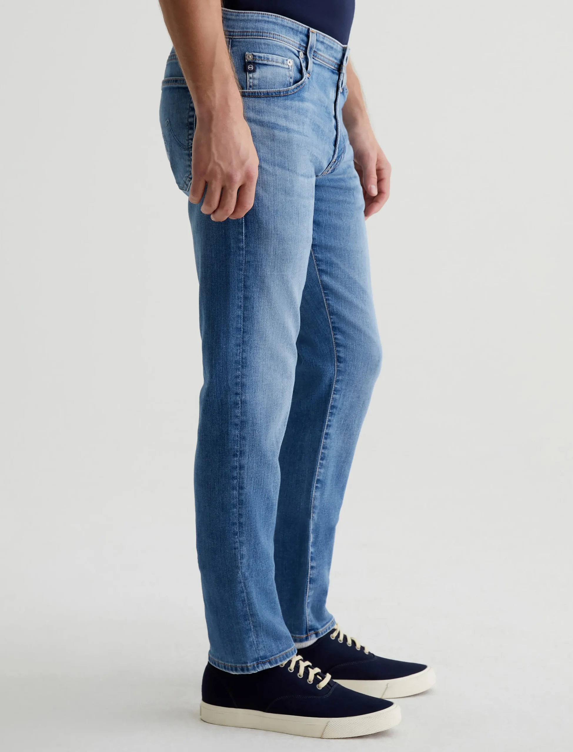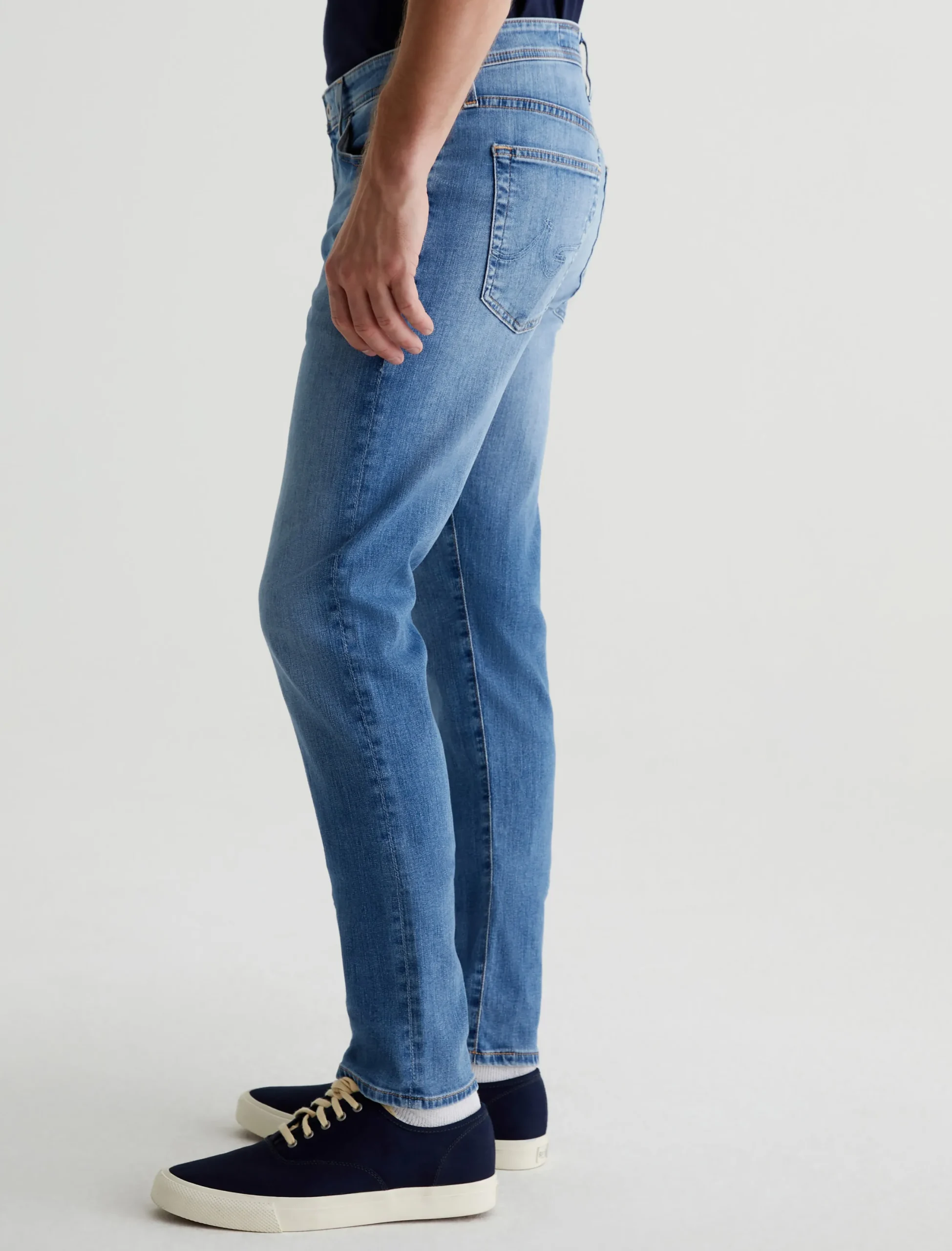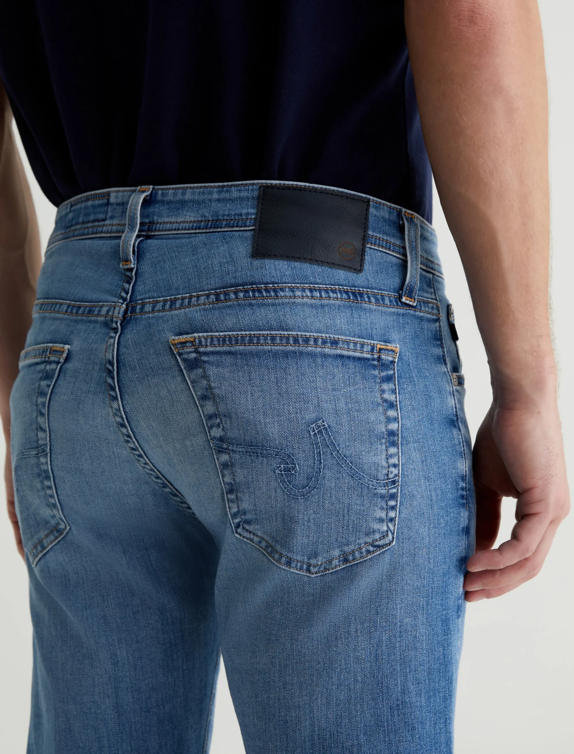 Our Tellis modern slim-fit men’s jeans feature a fitted upper block and tapered leg openings. Washed to a medium indigo shade with fading and whiskering, this five-pocket pair is crafted from AG’s Airluxe™ Aerial Nylon Denim that’s blended with comfort stretch.