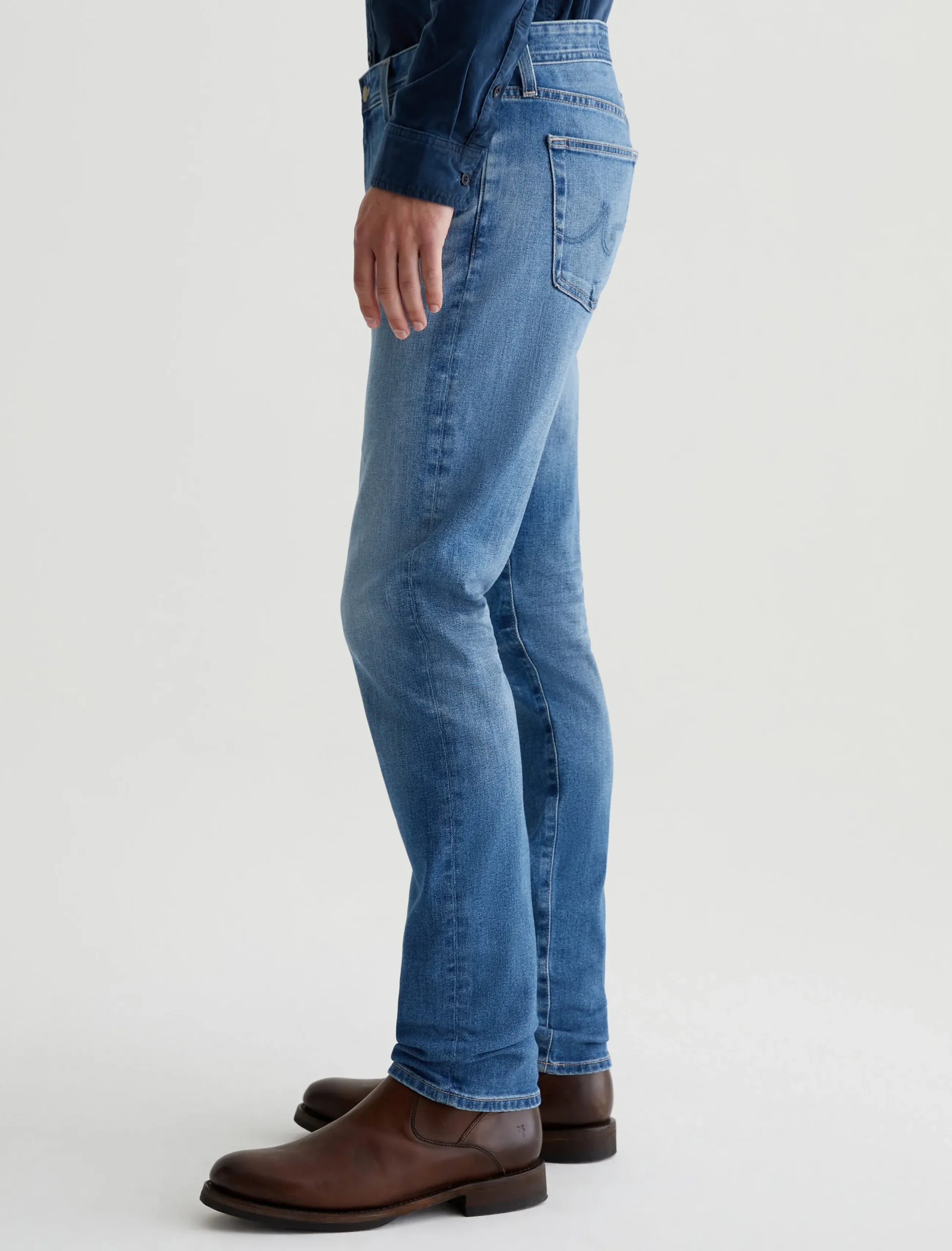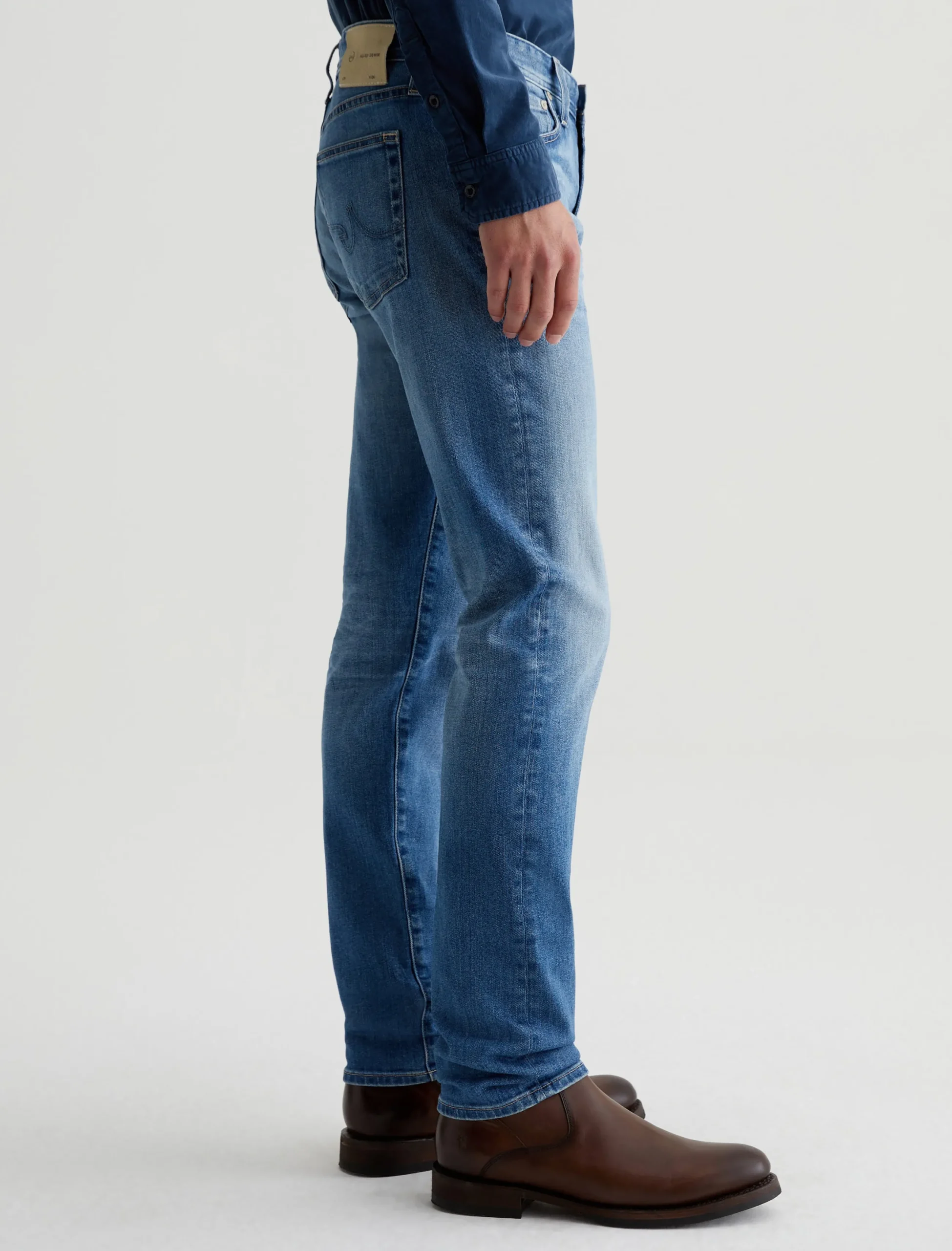 Our Tellis modern slim-fit jeans are cut with a fitted upper block and slender legs that taper at the ankle. This pair has a bit of stretch in 11.2 oz. New Union Dark Denim from Italy. Washed to a medium indigo shade, the style features a 19-year AG-ed™ Denim finish with fading, whiskering, and a subtle honeycomb wear pattern at the back of the knees.