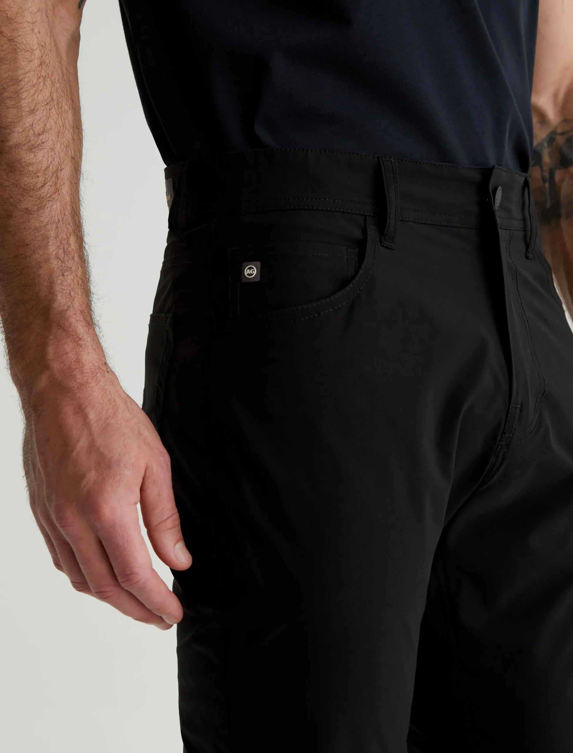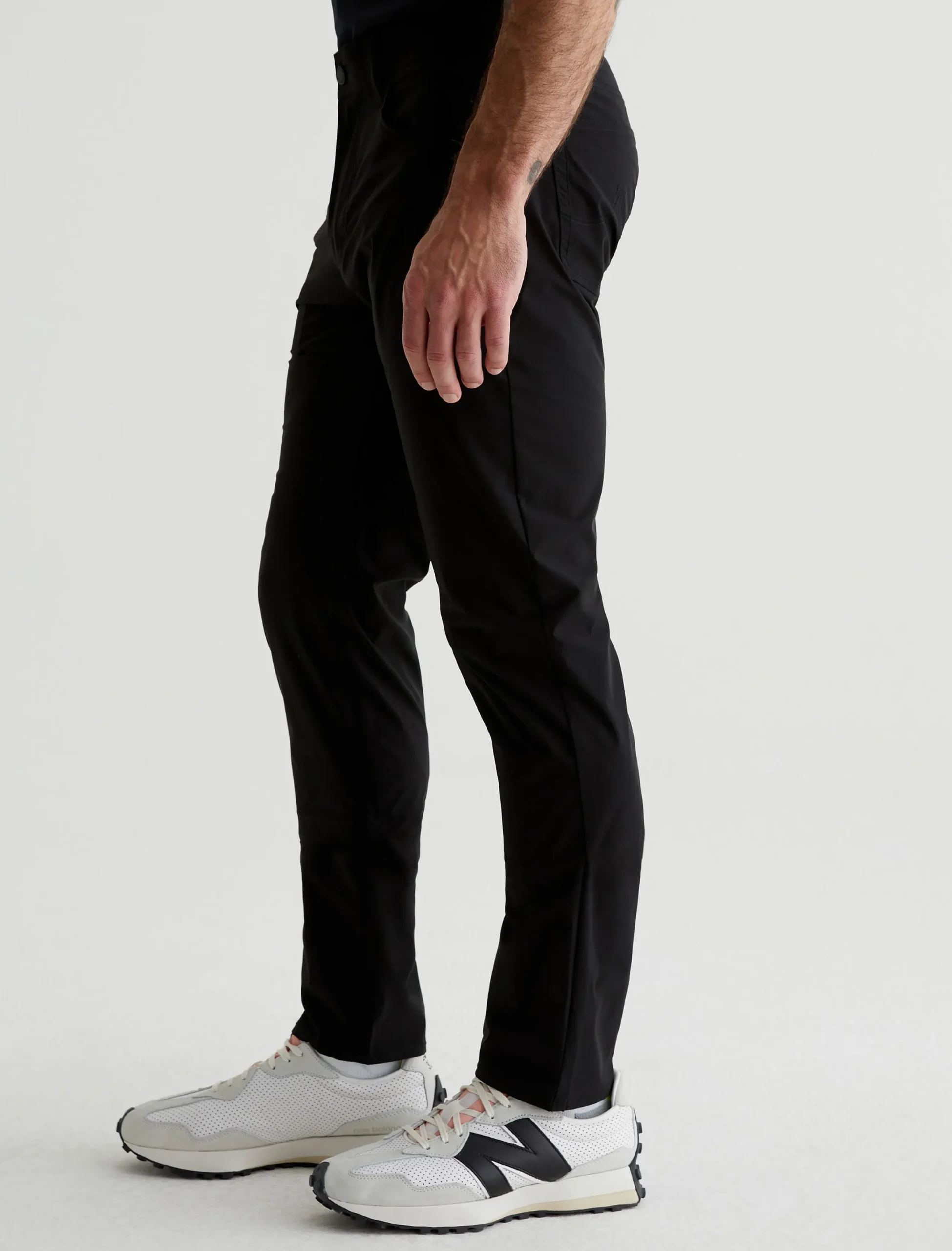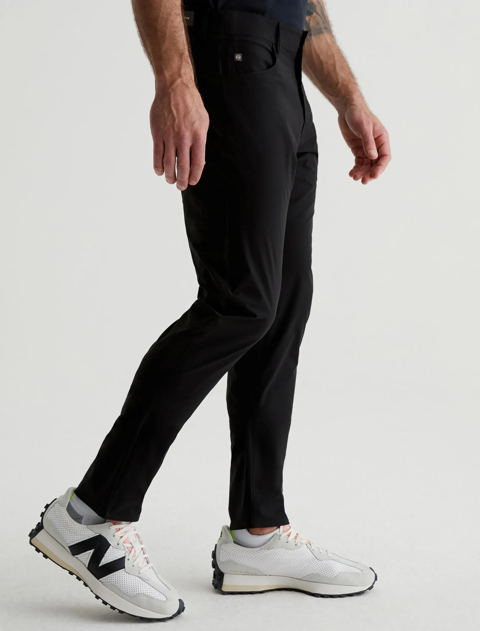 Our signature modern slim, updated for maximum mobility. The Tellis Active Performance pants feature a fitted upper block and slim legs with a tapered finish, plus an elastic interior waistband and snap closure. Made from 360° Lightweight Endurance Woven fabric in black, it’s got bi-stretch construction that’s quick drying, water resistant, and avoids wrinkling. A silicone heat transfer logo brands the back waistband.