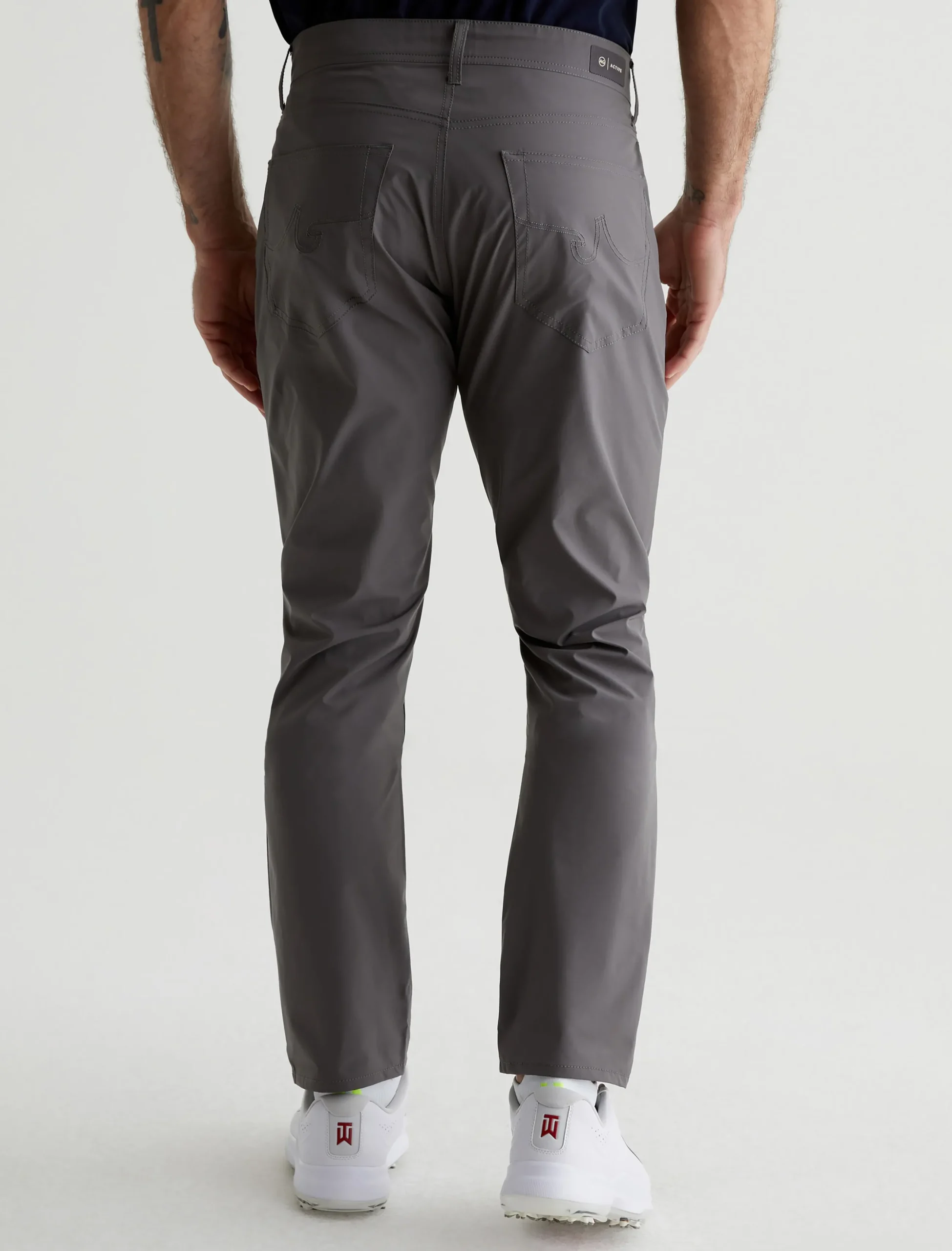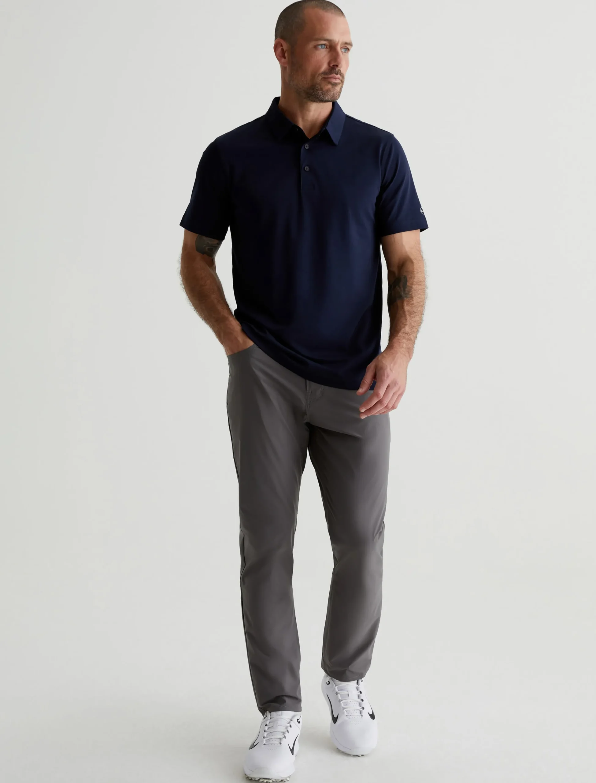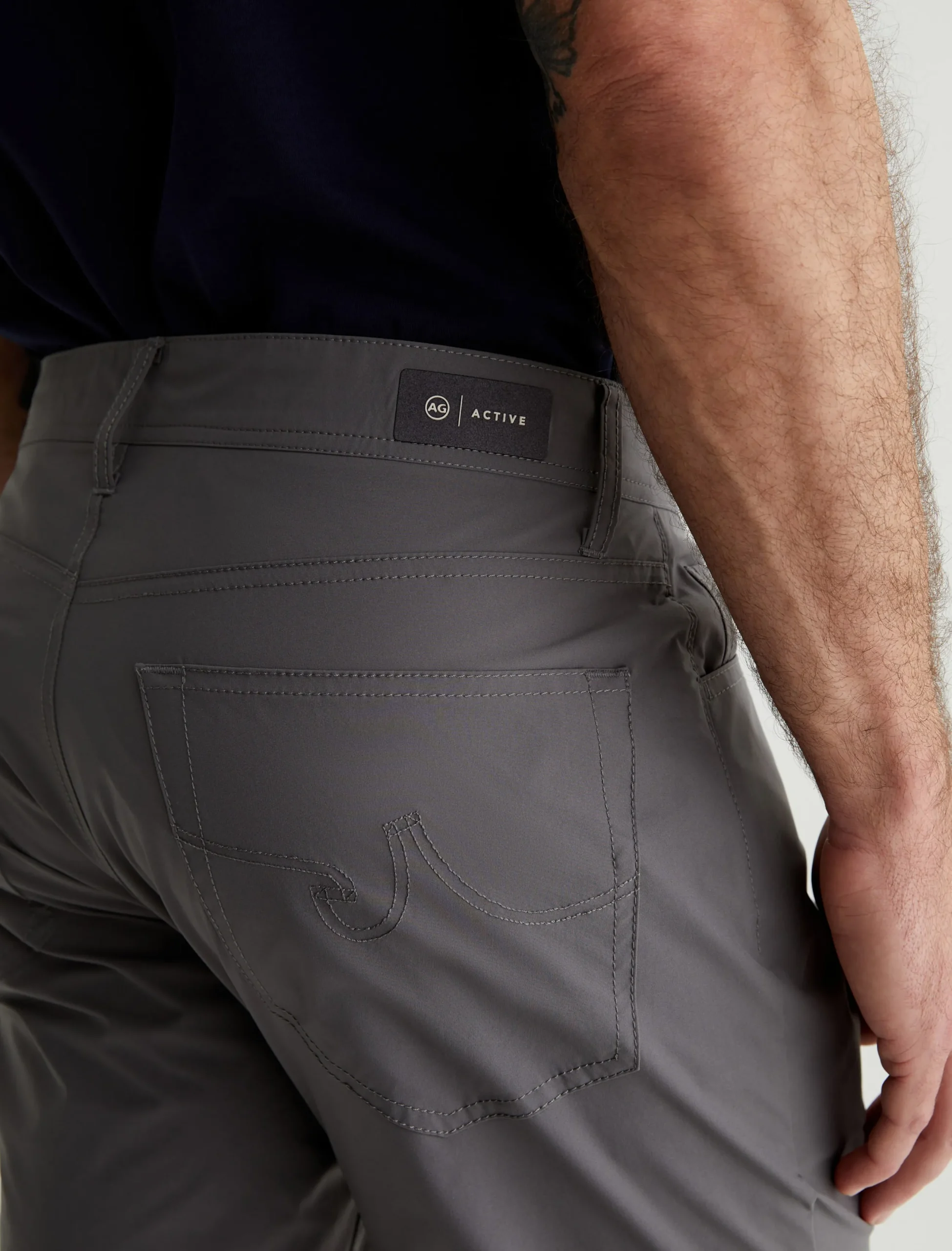 Our signature modern slim, updated for maximum mobility. The Tellis Active Performance pants feature a fitted upper block and slim legs with a tapered finish, plus an elastic interior waistband and snap closure. Made from 360° Lightweight Endurance Woven fabric in grey, it’s got bi-stretch construction that’s quick drying, water resistant, and avoids wrinkling. A silicone heat transfer logo brands the back waistband.