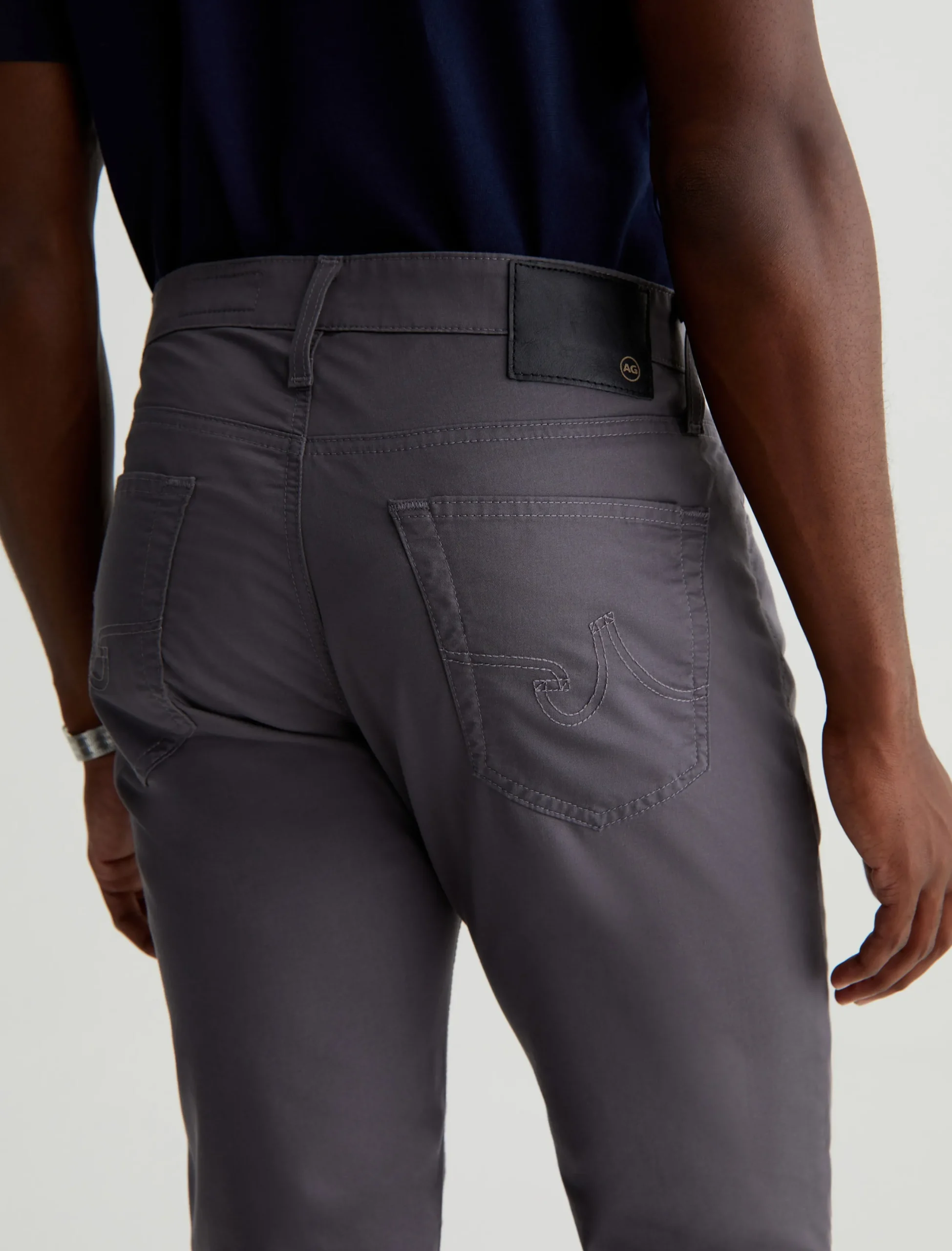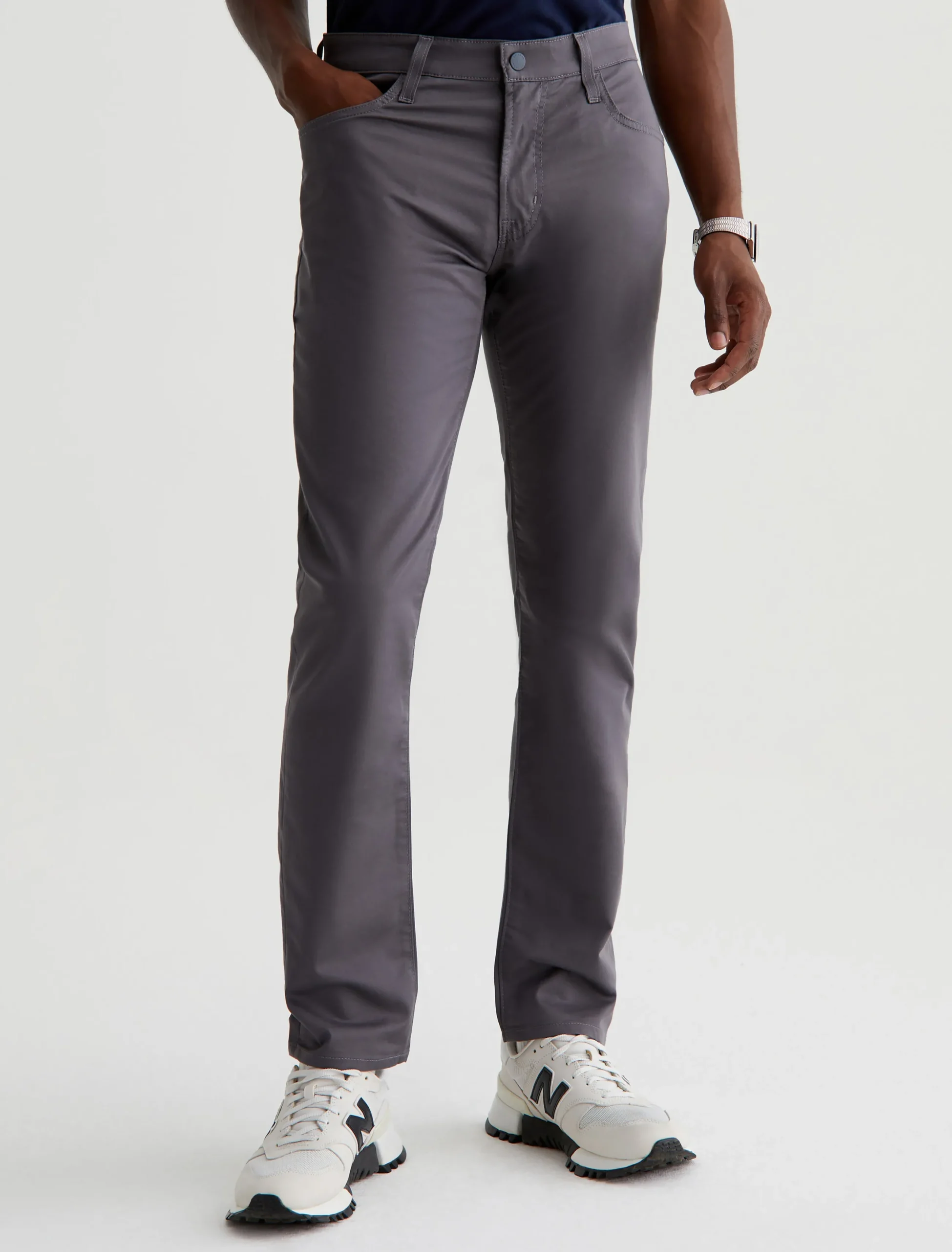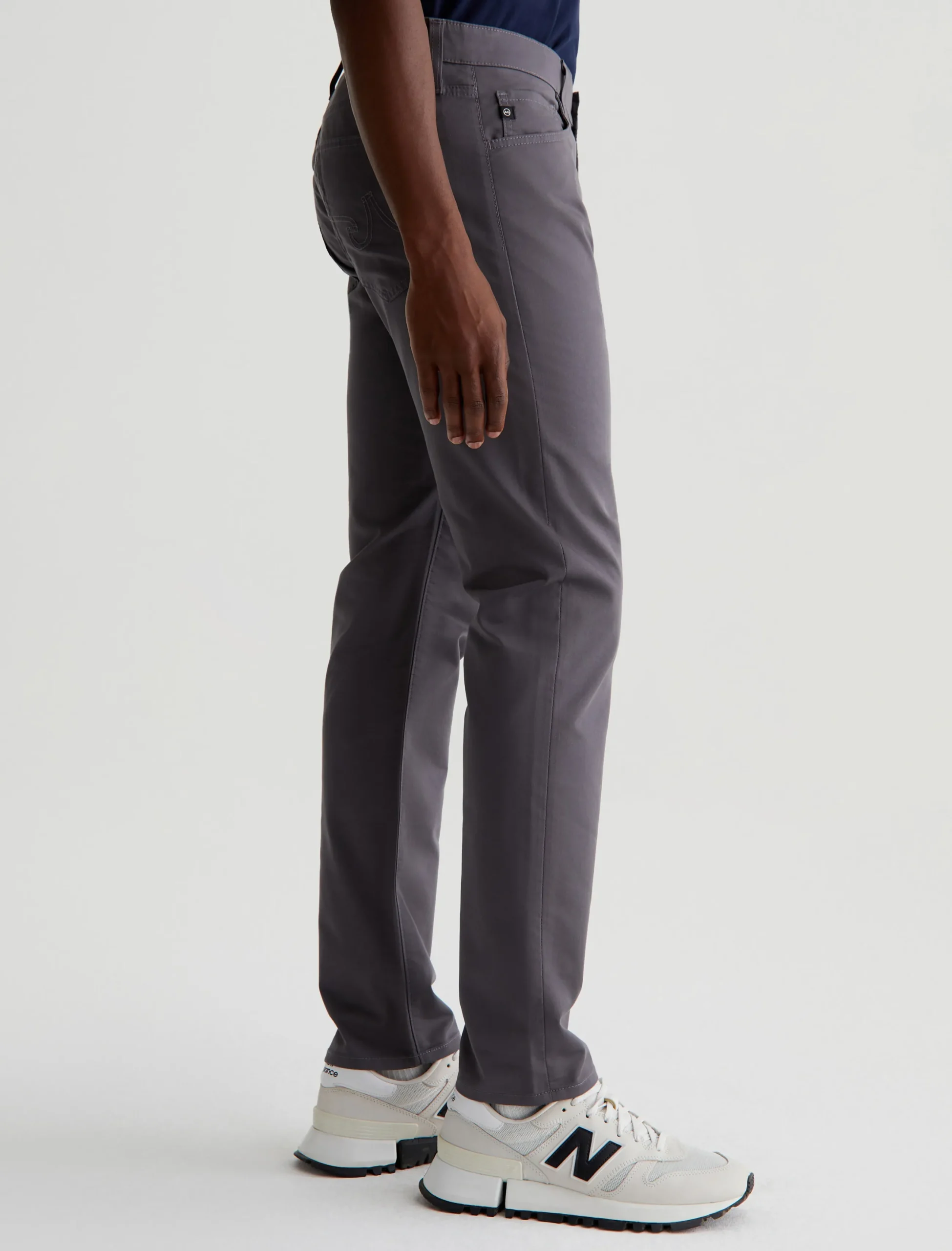 The Tellis is a modern slim fit updated in our new 5.9 oz. Commuter Performance Sateen with premium stretch for enhanced mobility. Featuring a fitted upper block and tapered leg opening, this five-pocket pant features a medium grey shade complemented by tonal stitching and a black shank button.