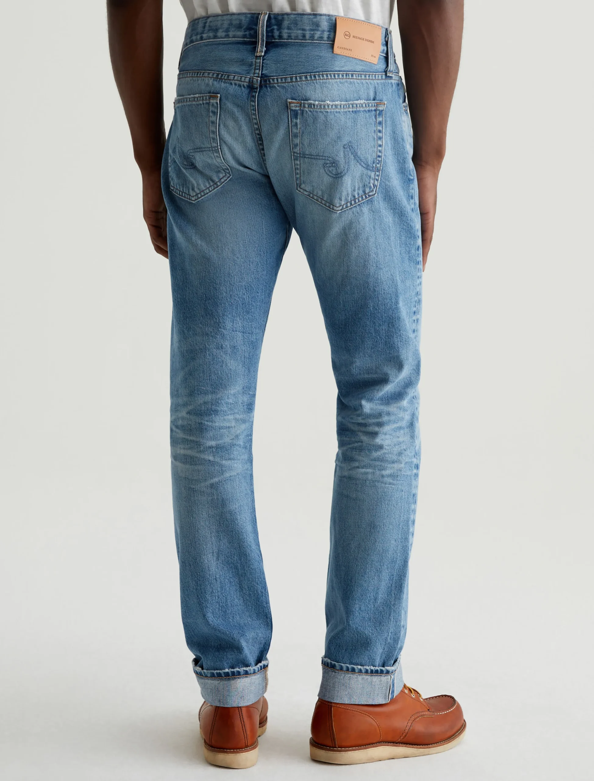 Our Tellis modern slim men’s jean, updated in midweight 12 oz. Robecchetto Rigid Selvage Denim from Italy’s famed Candiani Denim mill. Candiani uses innovative eco-friendly technology to craft this 100% cotton 3×1 right-hand twill denim. Tellis has a fitted upper block and tapered leg openings. These five-pocket slim-fit jeans have a medium indigo stonewash with an AG-ed™ 24-year fade, slightly distressed pocket edges, and a hint of wear at the hems. Detailed by a red ticker along the self-finished edge.