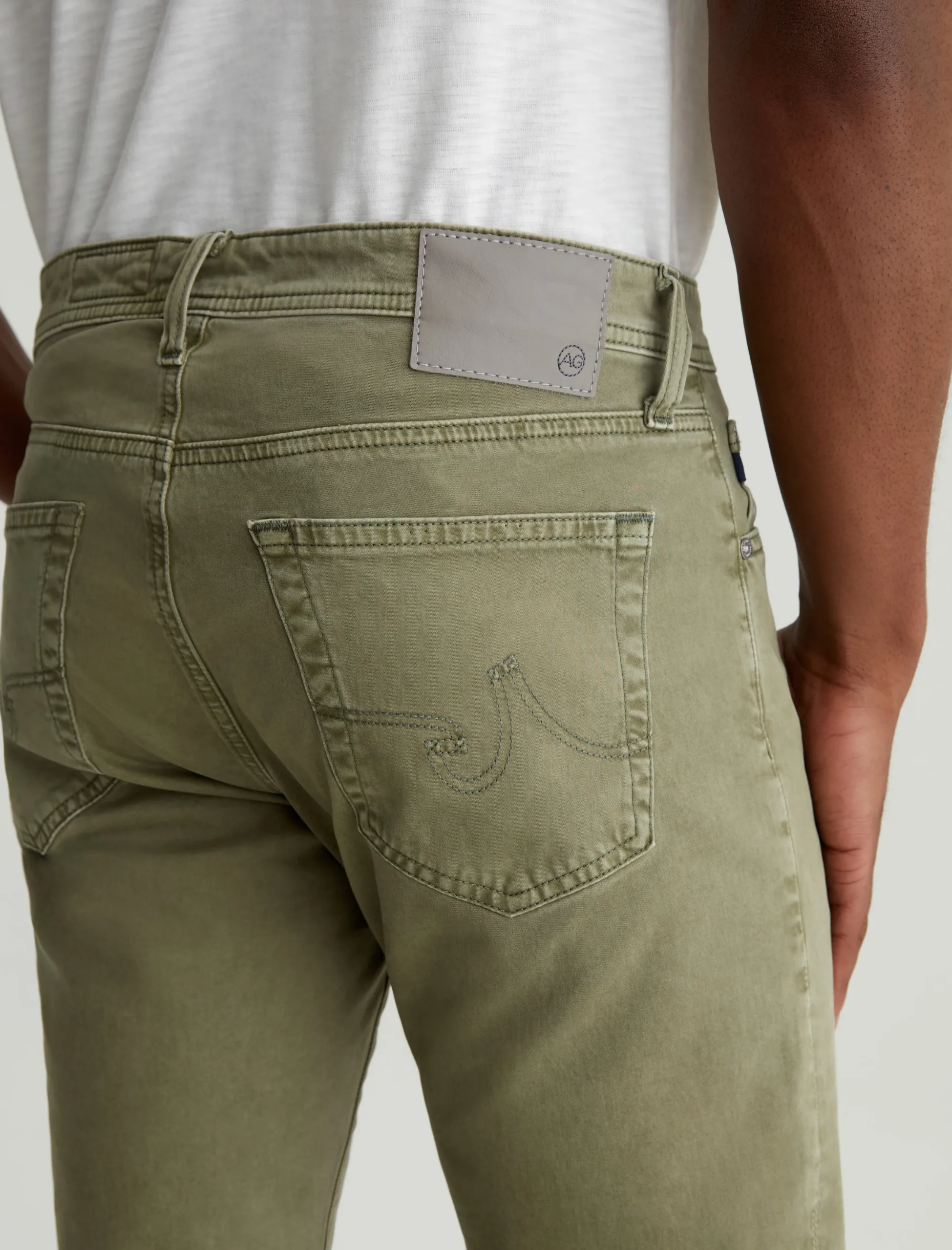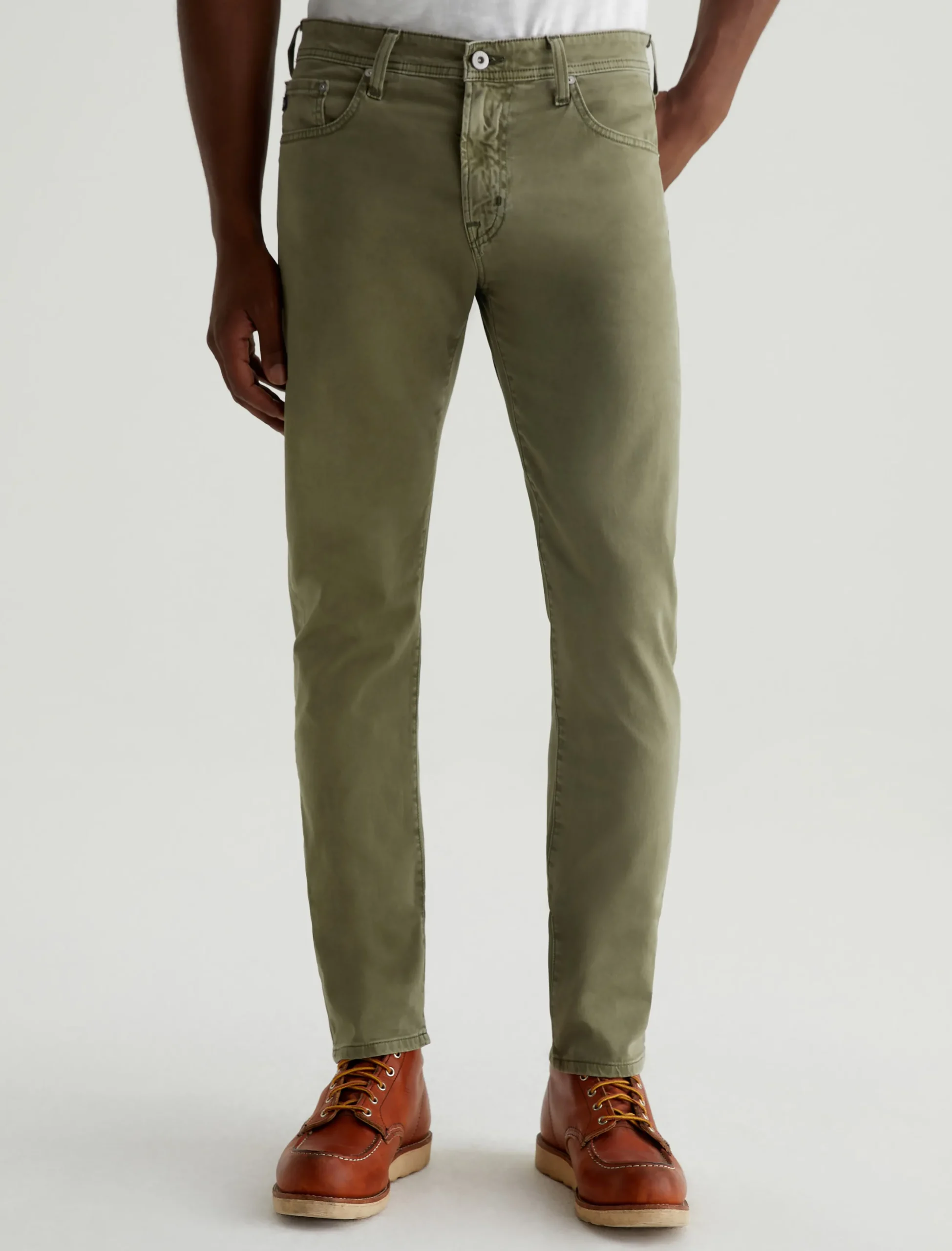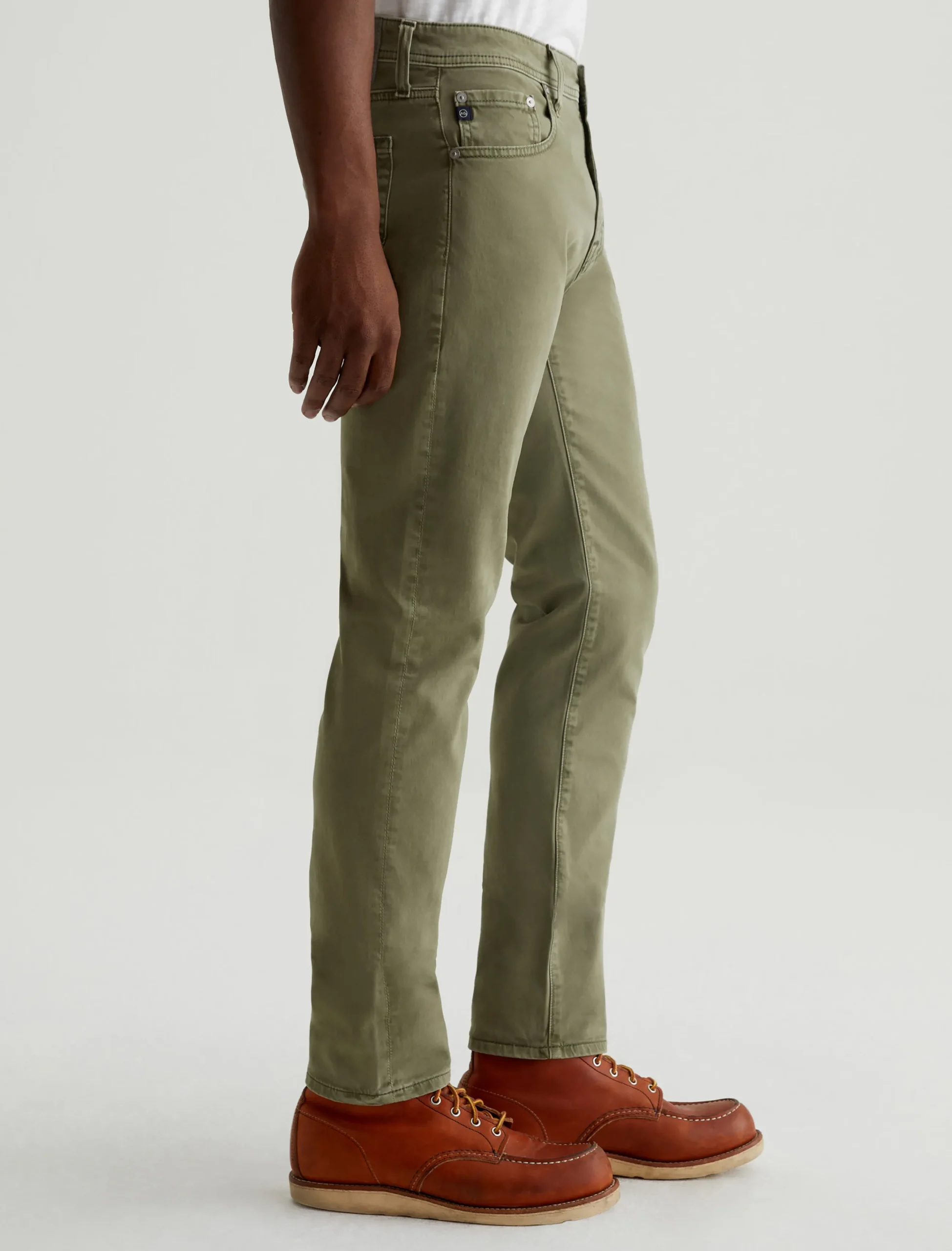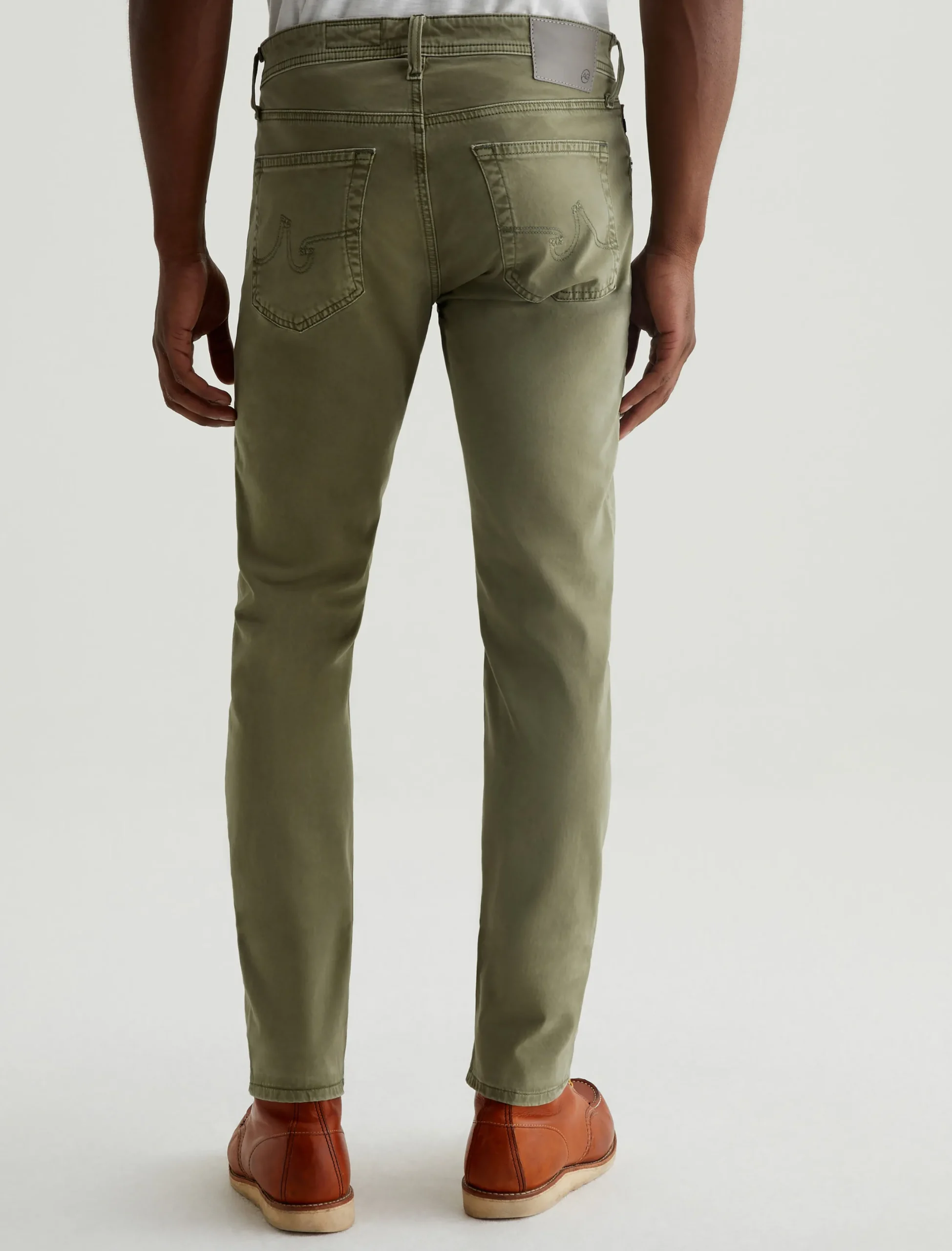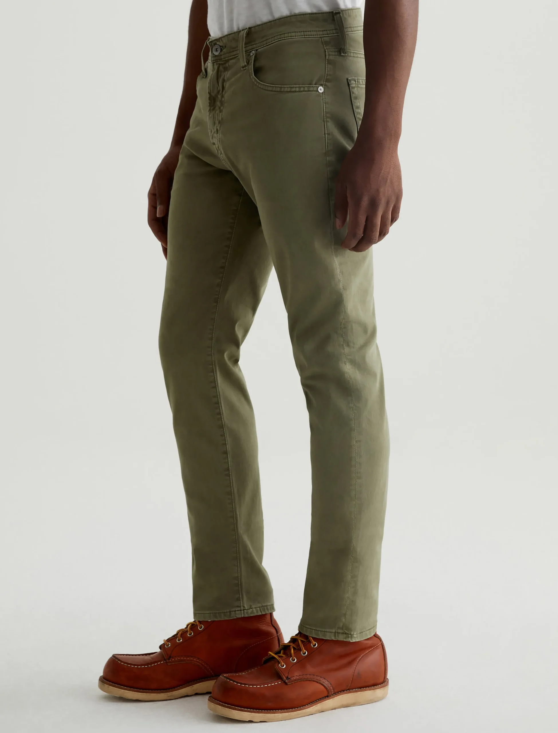 Tellis is our modern slim fit with a fitted upper block and a tapered leg opening. Sulfur-dyed for a faded army green shade, these five-pocket men’s pants are soft, refined, and incredibly comfortable in lightweight Sueded Stretch Sateen from Italy.