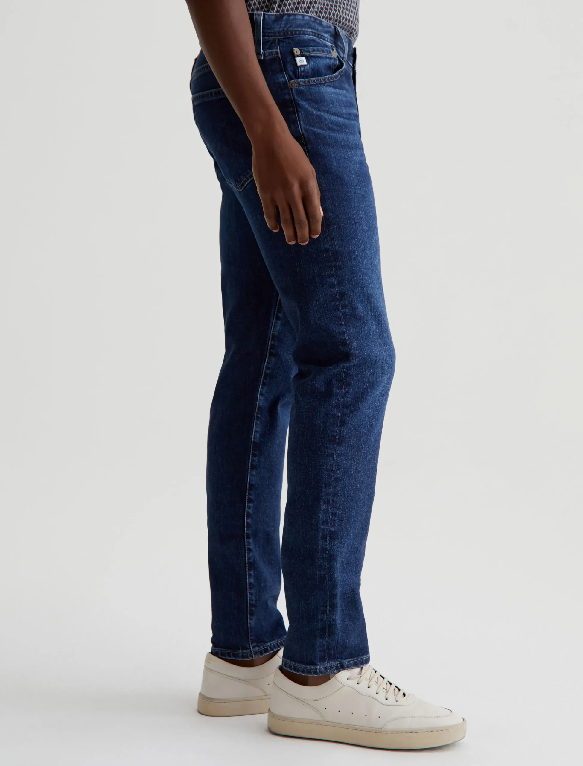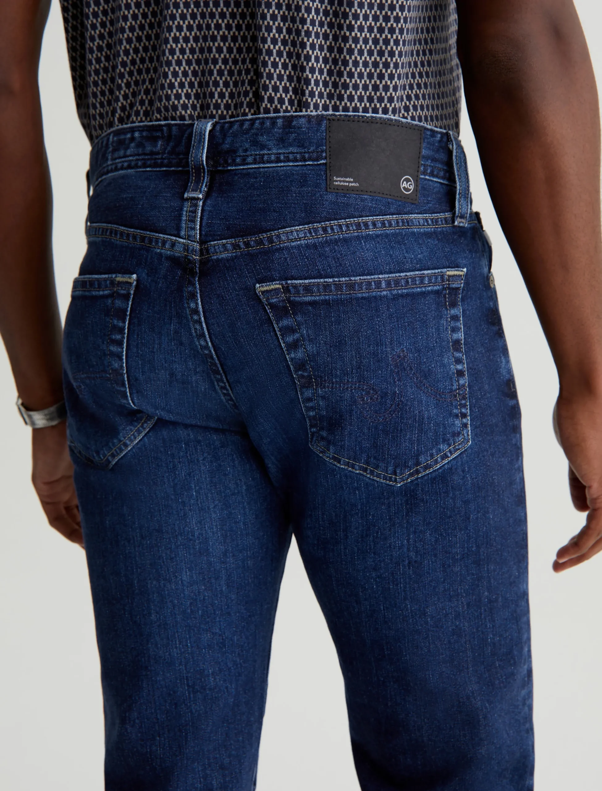 Tellis is our modern slim fit, featured in a medium indigo wash that’s been achieved using our eco-friendly AG Vapor Wash™ technology. Cut with a fitted upper block and tapered leg opening, this five-pocket men’s jean is designed in 11 oz. Lead Denim with comfort stretch. Our AG Vapor Wash™ process significantly reduces the use of water, chemicals, and energy to lessen environmental impact. Finished with a vegan and 100% biodegradable cellulose patch at the back waistband.
