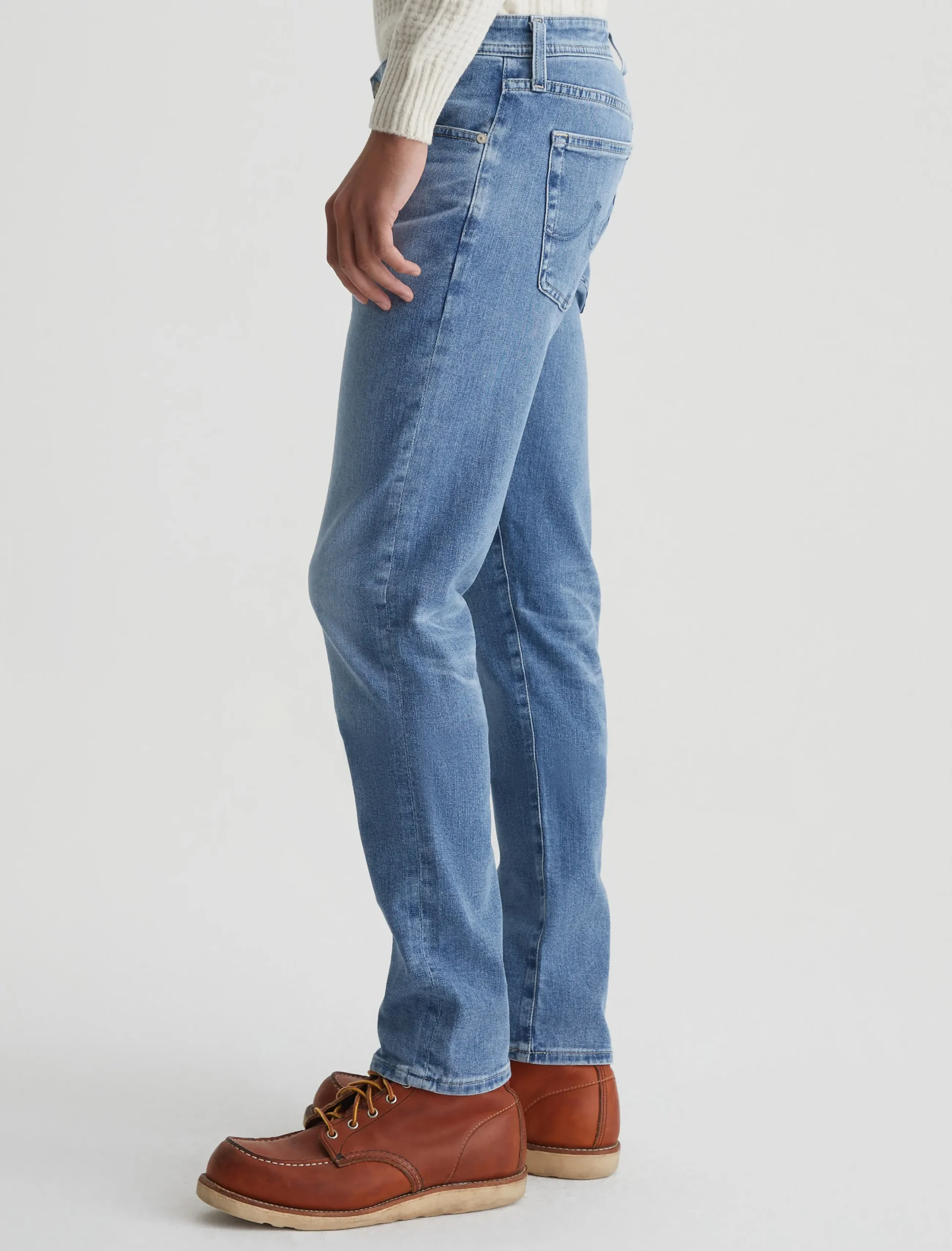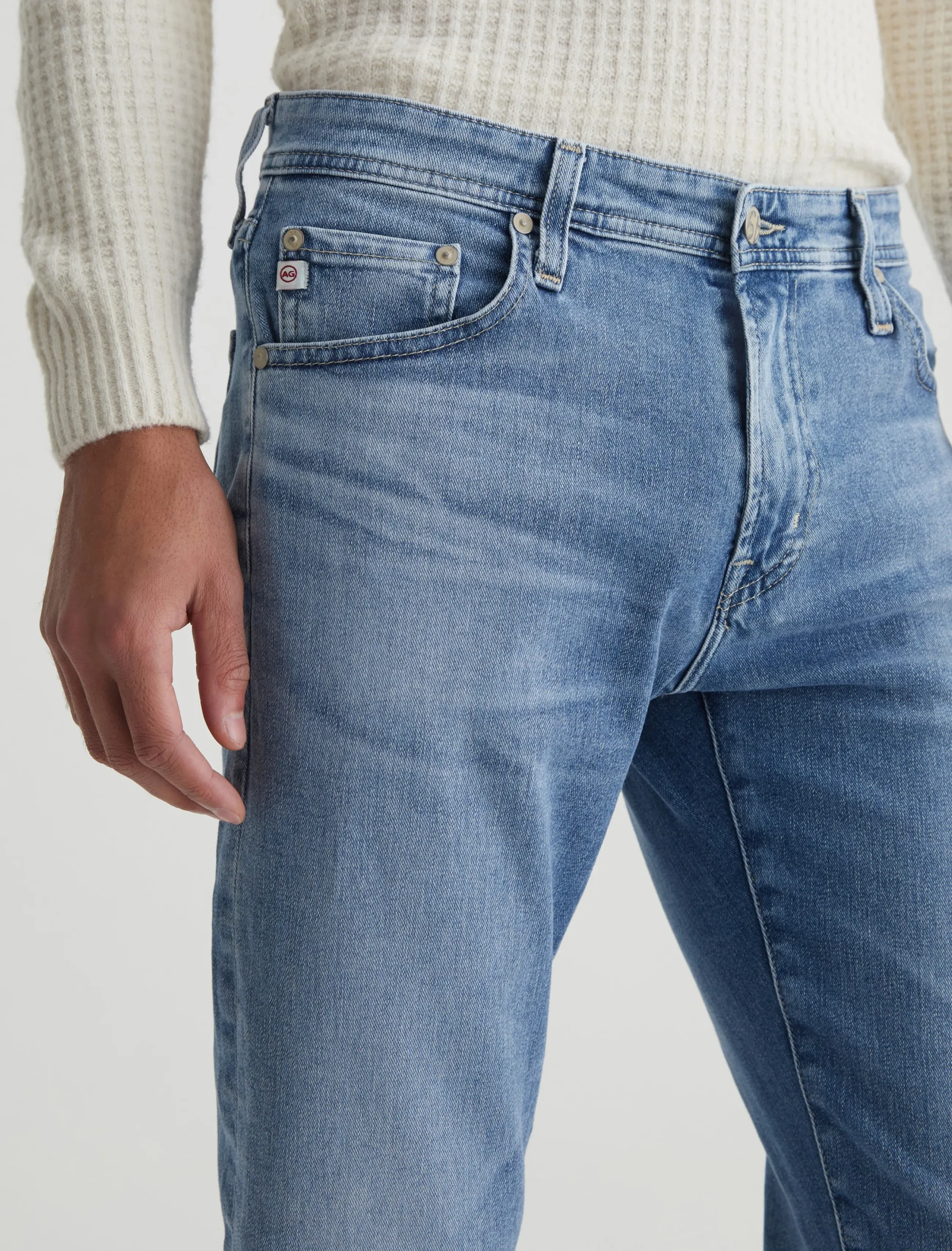 Tellis is a modern slim jean for men, updated here in a 16-year AG-ed™ light blue shade achieved through eco-friendly AG Vapor Wash™ technology. Tellis is designed with a fitted upper block and a tapered leg opening. These men’s slim-fit jeans come in 9.4 oz. Hyper Soft Indigo Denim from our exclusive AG Cloud Soft Denim™ assortment. This fabric’s left-hand twill construction allows the yarns to gently relax and untwist for a supple, velvety feel that gets softer with every wear. It’s blended with dual-elastic performance fibers, offering premium stretch and recovery.