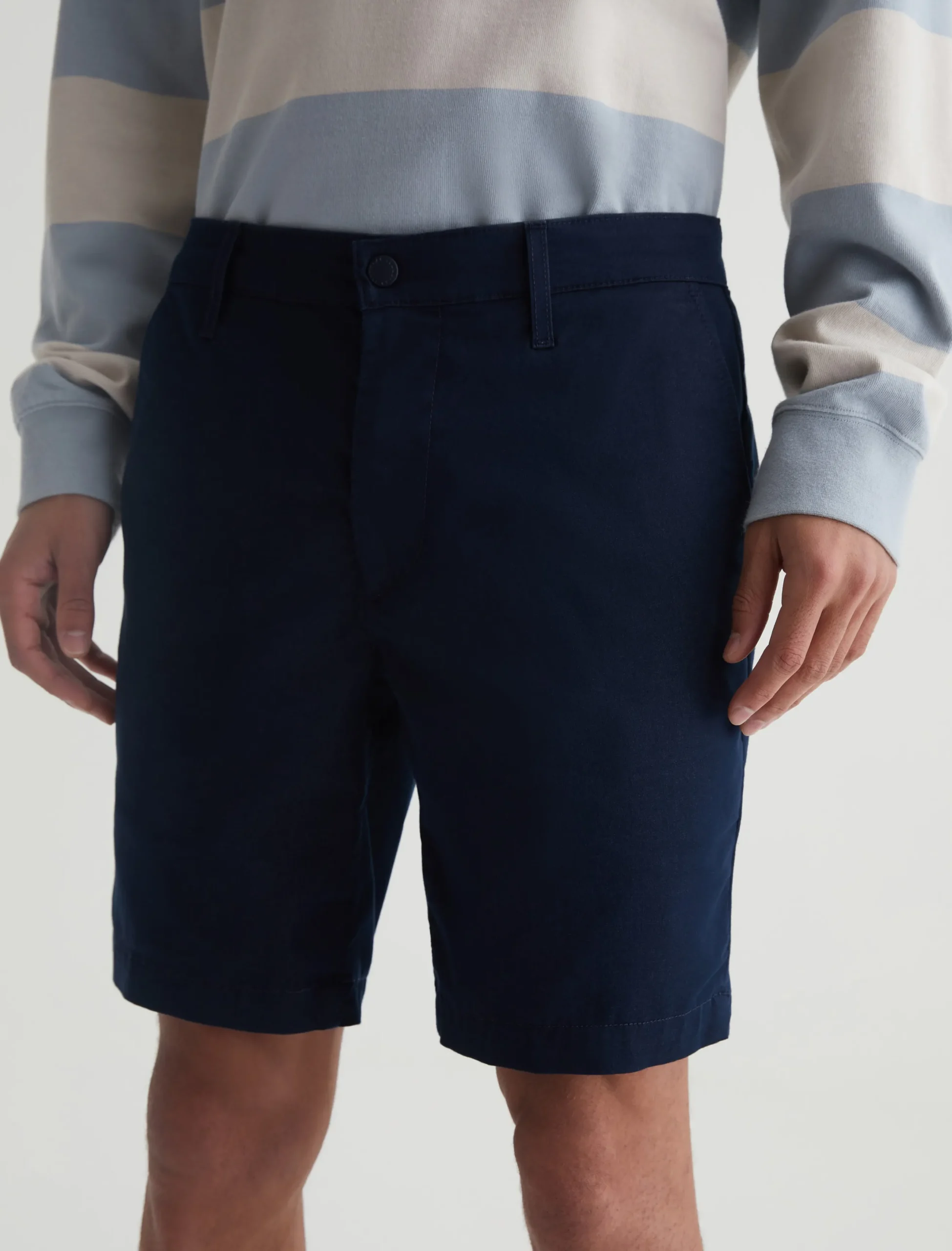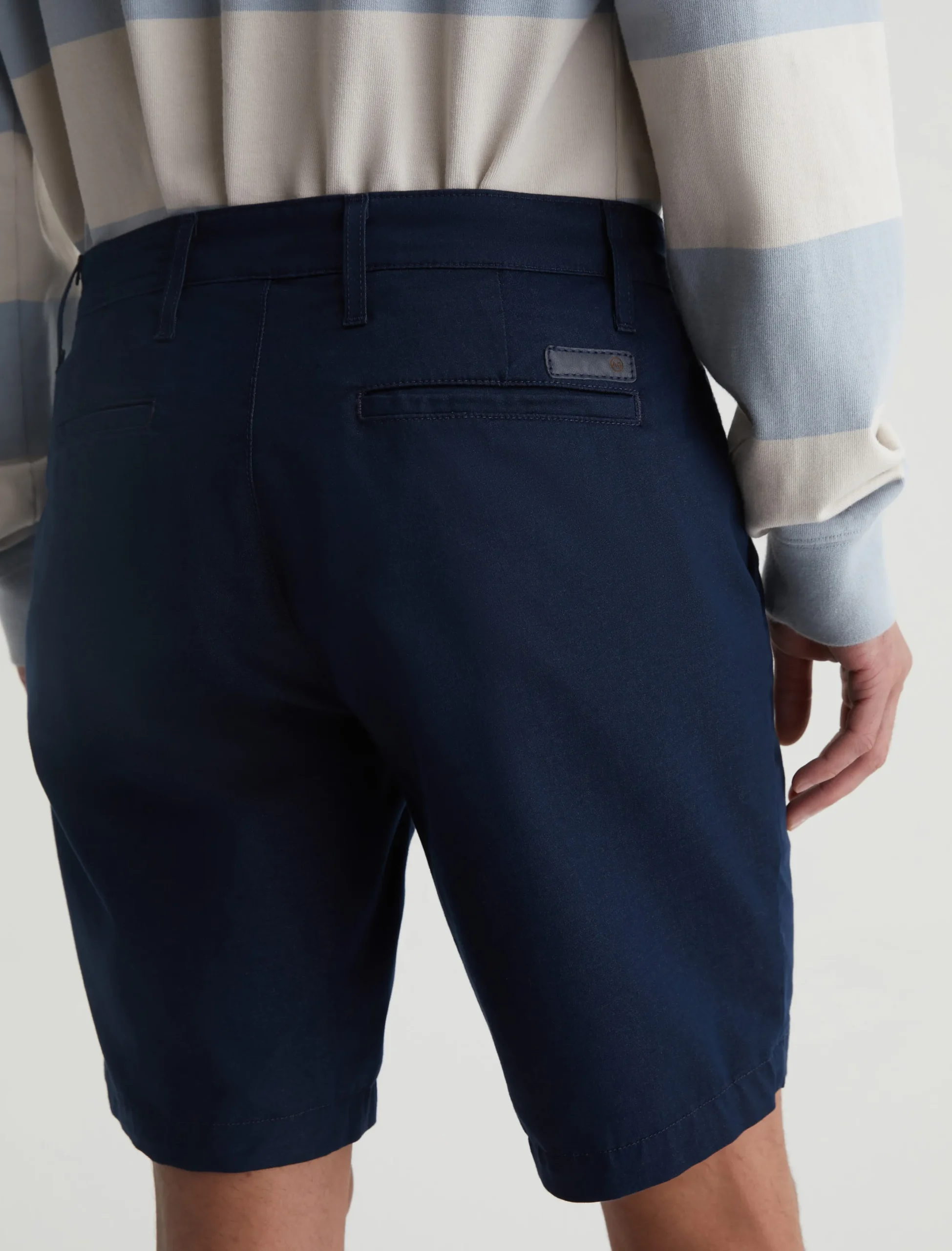 The Wanderer Performance Short moves with ease in 5.9 oz. Airluxe™ Commuter Performance Sateen featuring active stretch and a soft, refined texture. Done here in a dark blue shade, these shorts have a slim fit with a clean trouser look and a slightly tapered leg opening.
