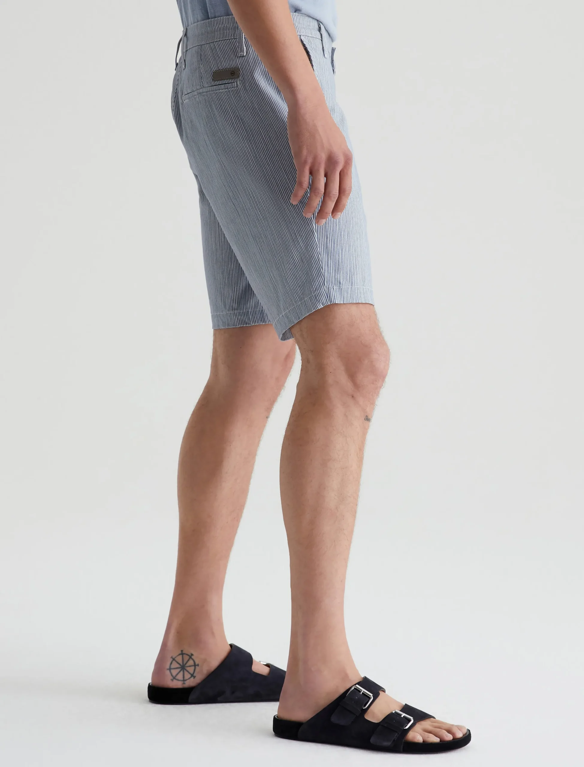 Our Wanderer Short for men has a clean trouser look in a slim fit with slightly tapered legs. Patterned with slim grey and white stripes, these men’s shorts are crafted from ultra-lightweight and sumptuous 7.4 oz. Brighton Sueded Sateen with premium stretch.