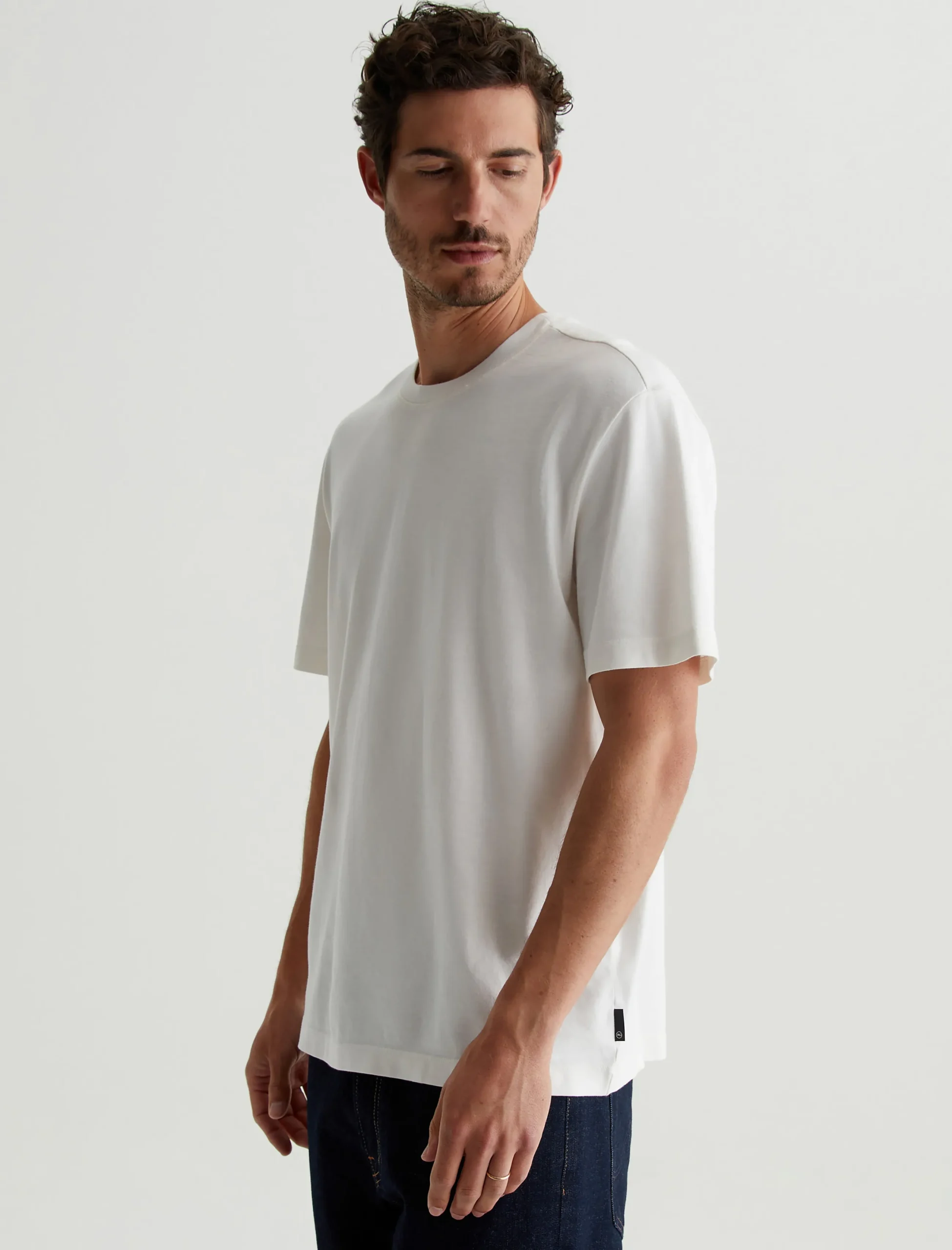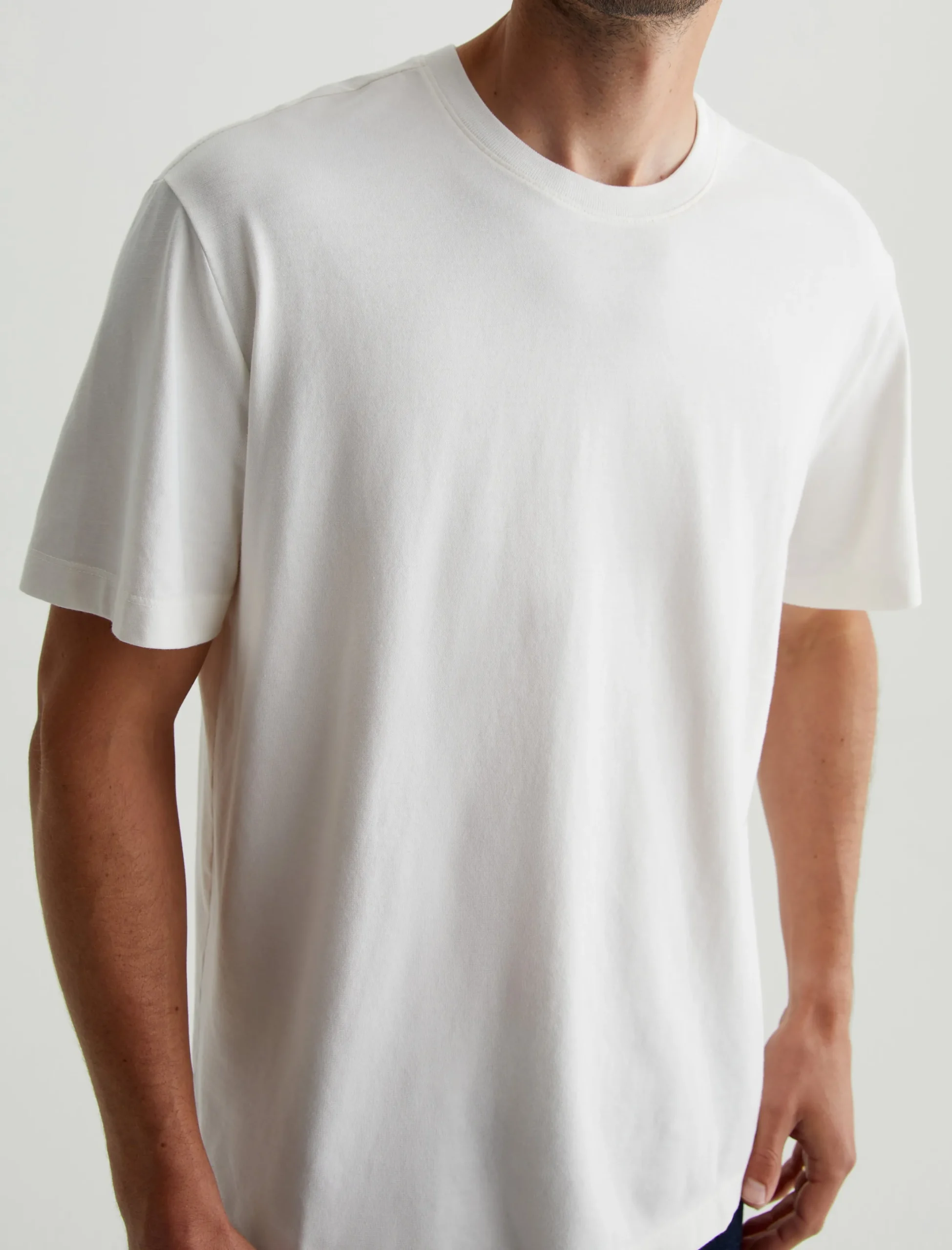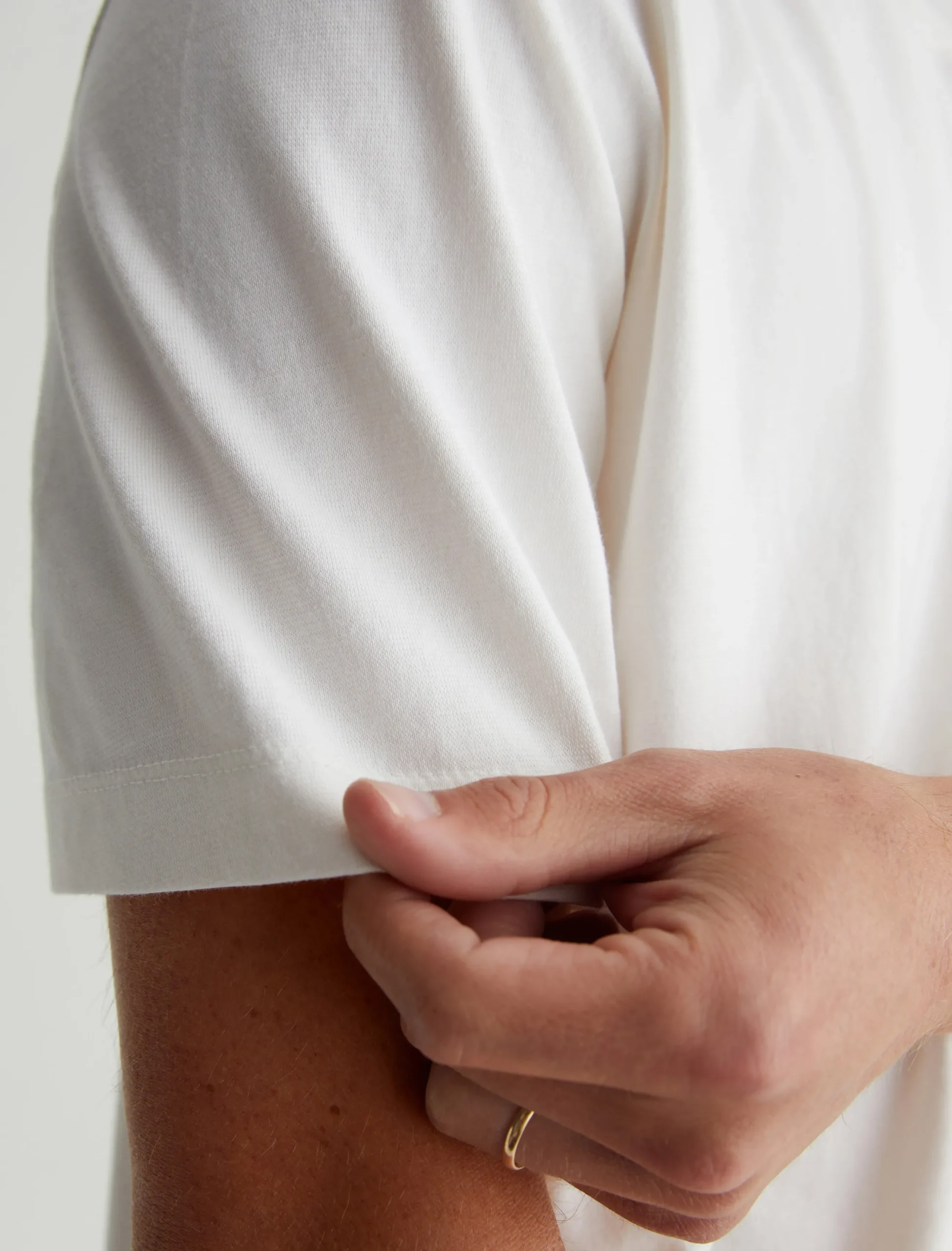 The Wesley Crew in ivory dust is a relaxed short-sleeve tee for men. The tee offers drop shoulder detailing and wider hem for a more fashion forward fit. Our Jersey Knit offers a luxurious comfort that is unrivaled—knitted with both S-twist and Z-twist yarn to sustain longevity and stability, preventing unnecessary twisting and torquing. During the production process, the S-twist yarn is spun counter-clockwise creating a right-handed twill. The Z-twist yarn works in opposition, spinning clockwise for a left-handed twill. This opposition—when working together—yields a softer, more durable fabrication and gives strength to the yarn making it more difficult to pull apart. Designed in 100% Cotton.