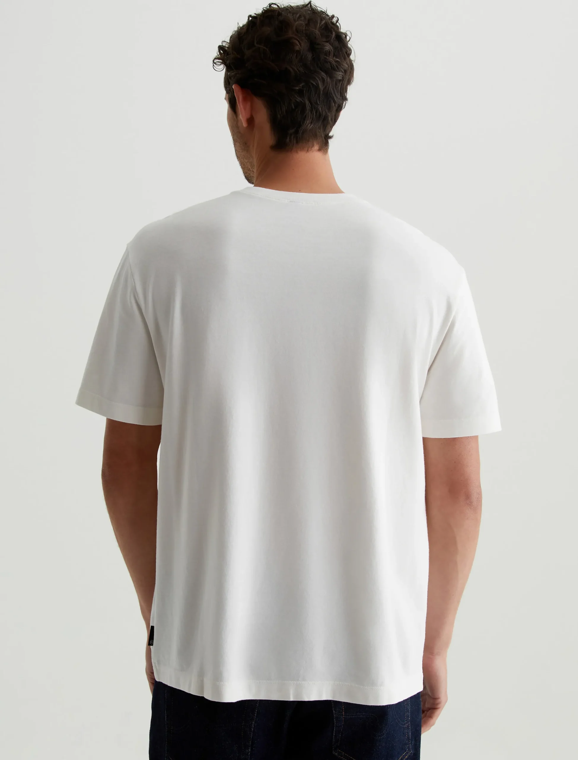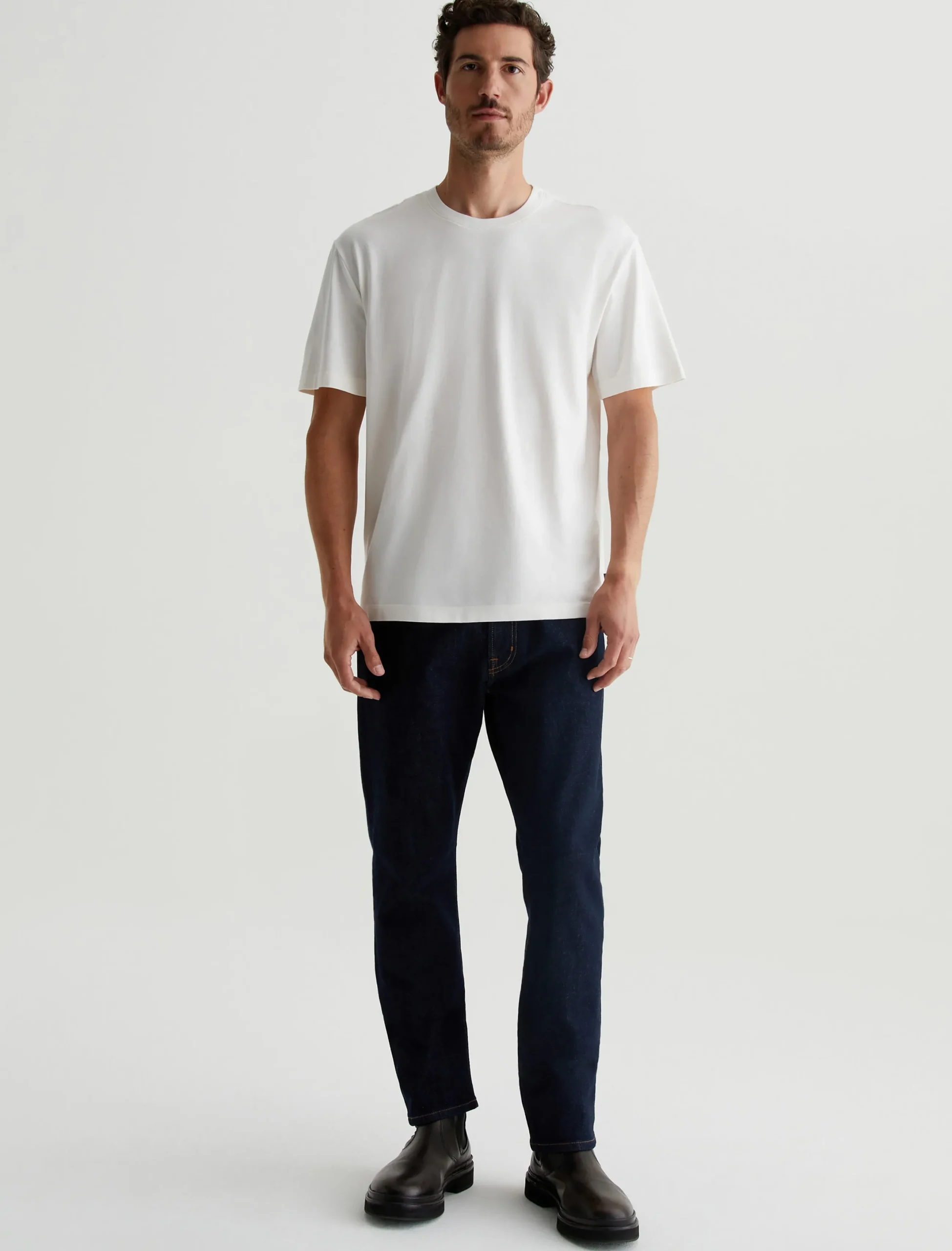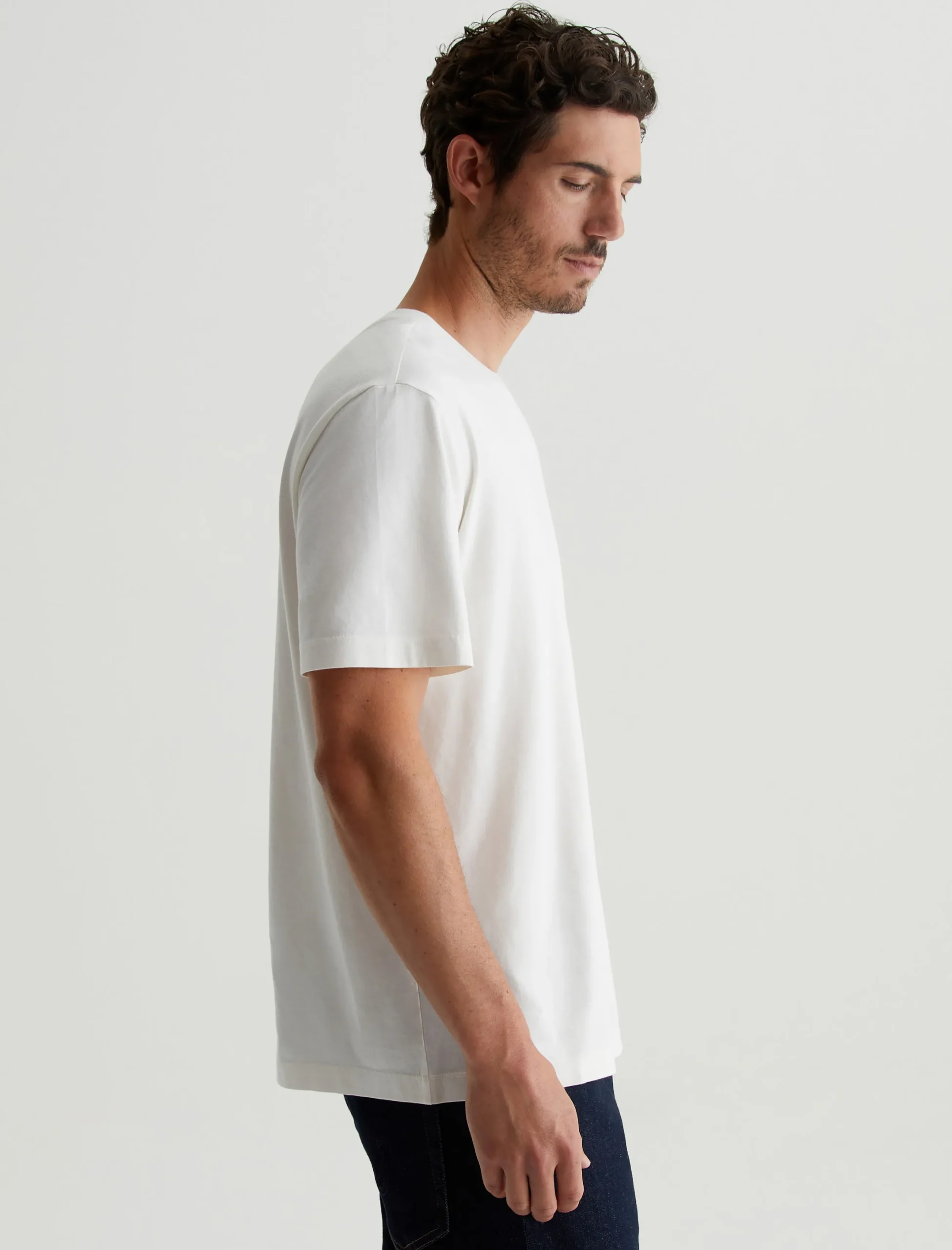 The Wesley Crew in ivory dust is a relaxed short-sleeve tee for men. The tee offers drop shoulder detailing and wider hem for a more fashion forward fit. Our Jersey Knit offers a luxurious comfort that is unrivaled—knitted with both S-twist and Z-twist yarn to sustain longevity and stability, preventing unnecessary twisting and torquing. During the production process, the S-twist yarn is spun counter-clockwise creating a right-handed twill. The Z-twist yarn works in opposition, spinning clockwise for a left-handed twill. This opposition—when working together—yields a softer, more durable fabrication and gives strength to the yarn making it more difficult to pull apart. Designed in 100% Cotton.