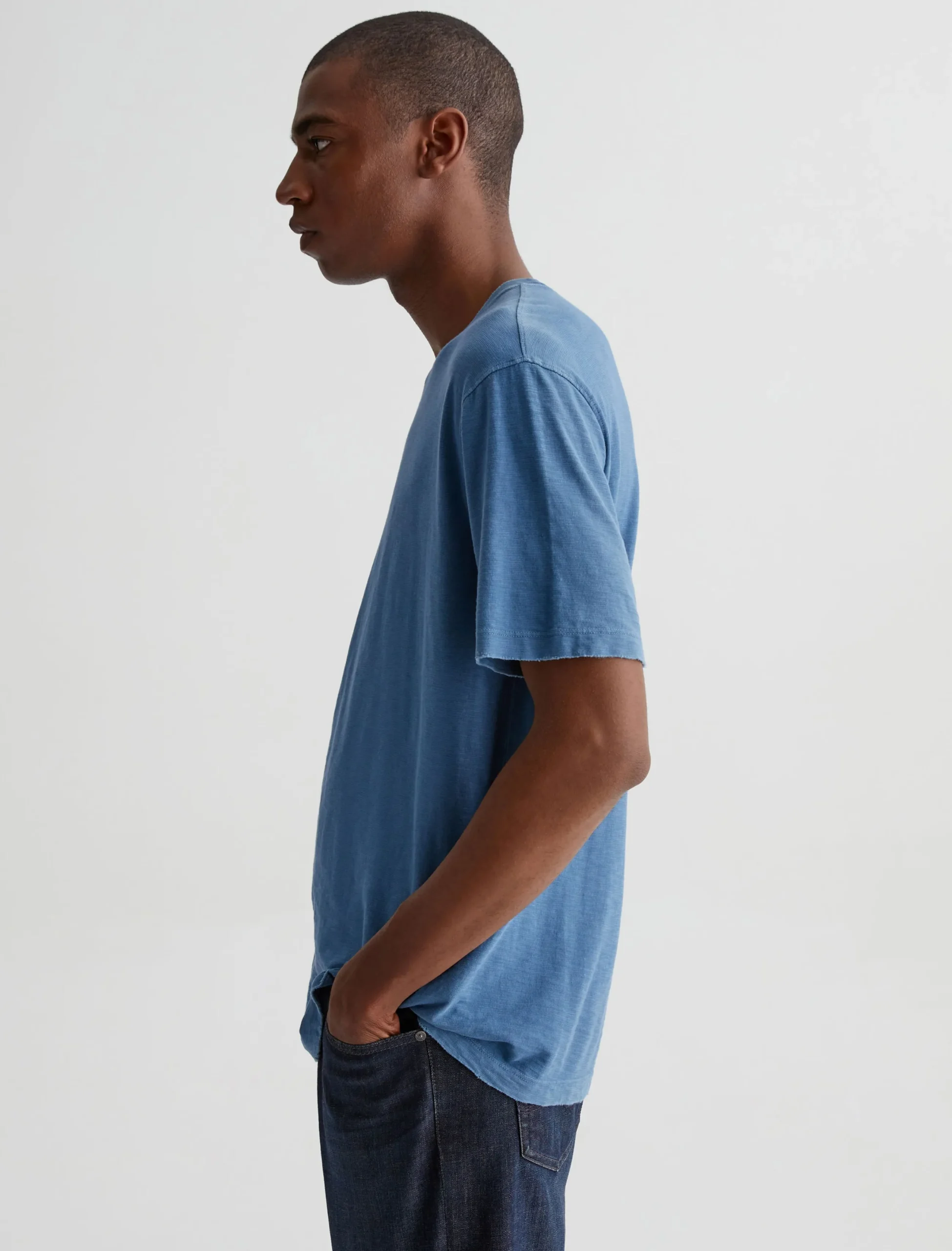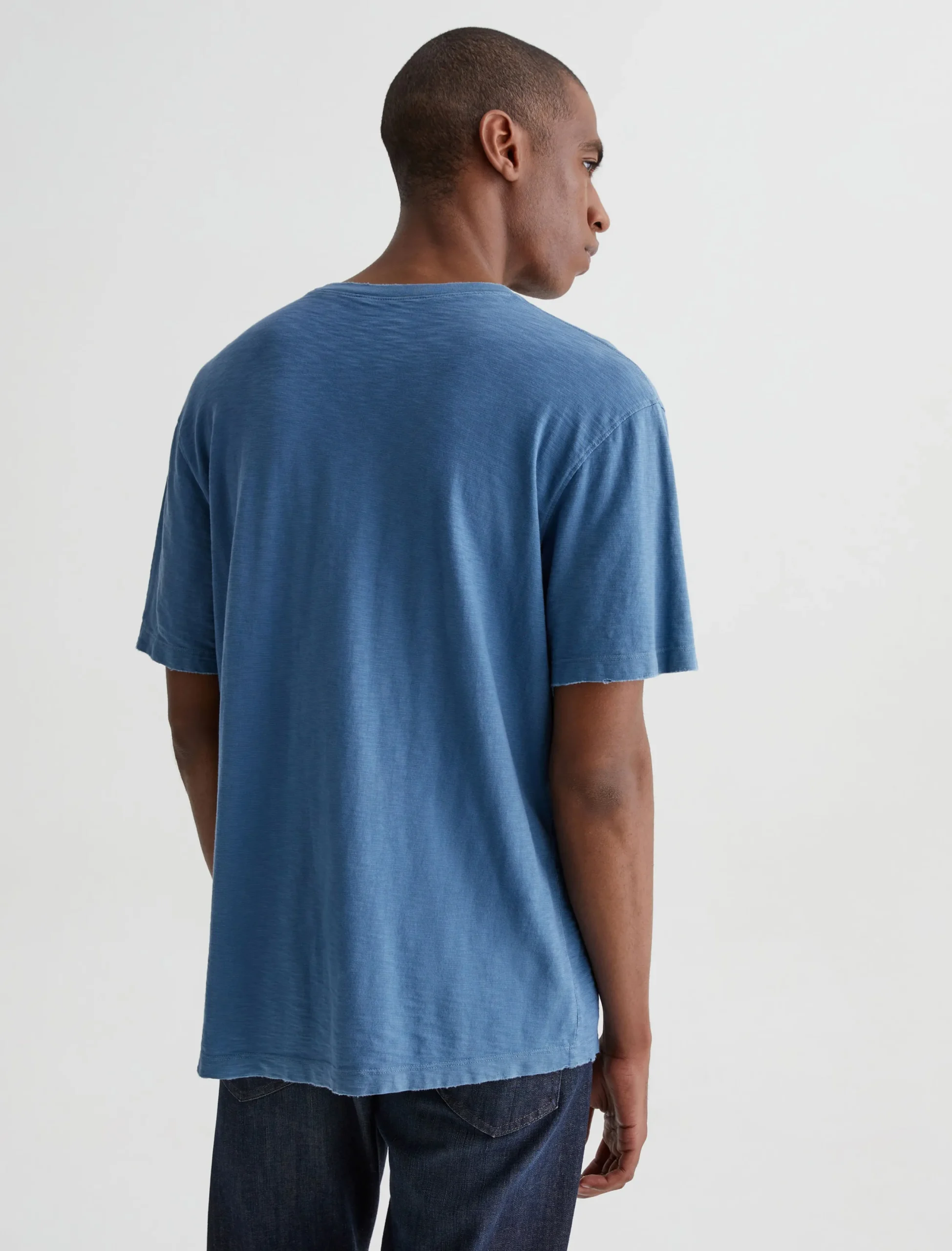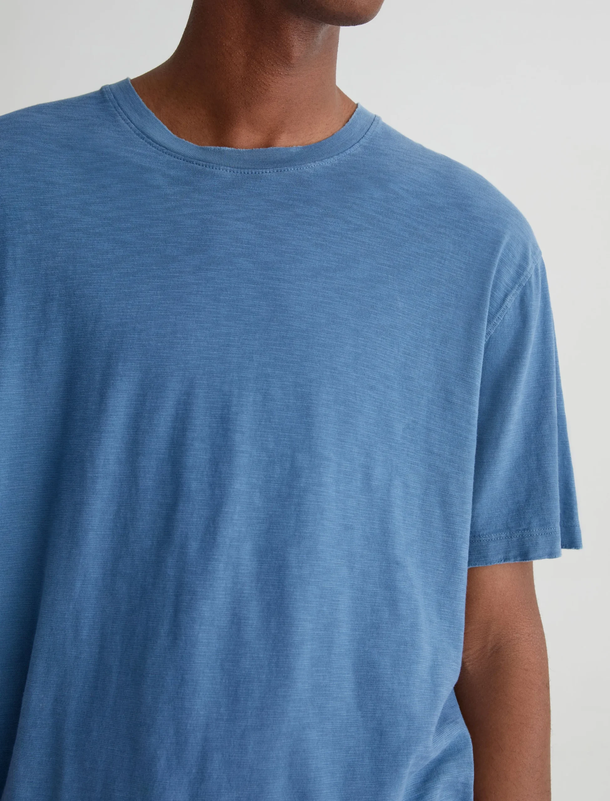 Our Wesley Crew is a relaxed crewneck tee in blue with gently distressed edges. The AG-ed finish creates the characteristics of 5 years of wear. Soft and lightweight in 100% cotton Luxe Slub Jersey, this short-sleeve T-shirt features drop-shoulder detailing and a wider hem for a more fashion-forward fit. The fabric combines S&Z twist yarns to prevent unnecessary twisting and torquing for long-wearing durability.