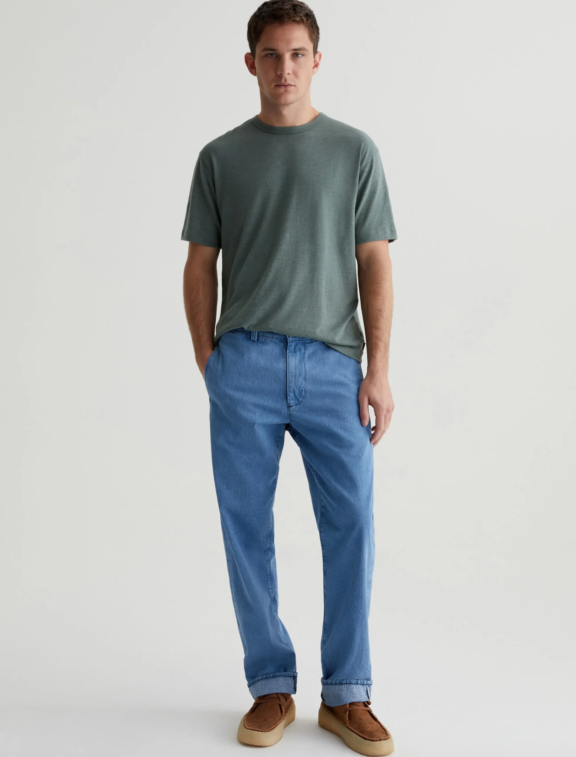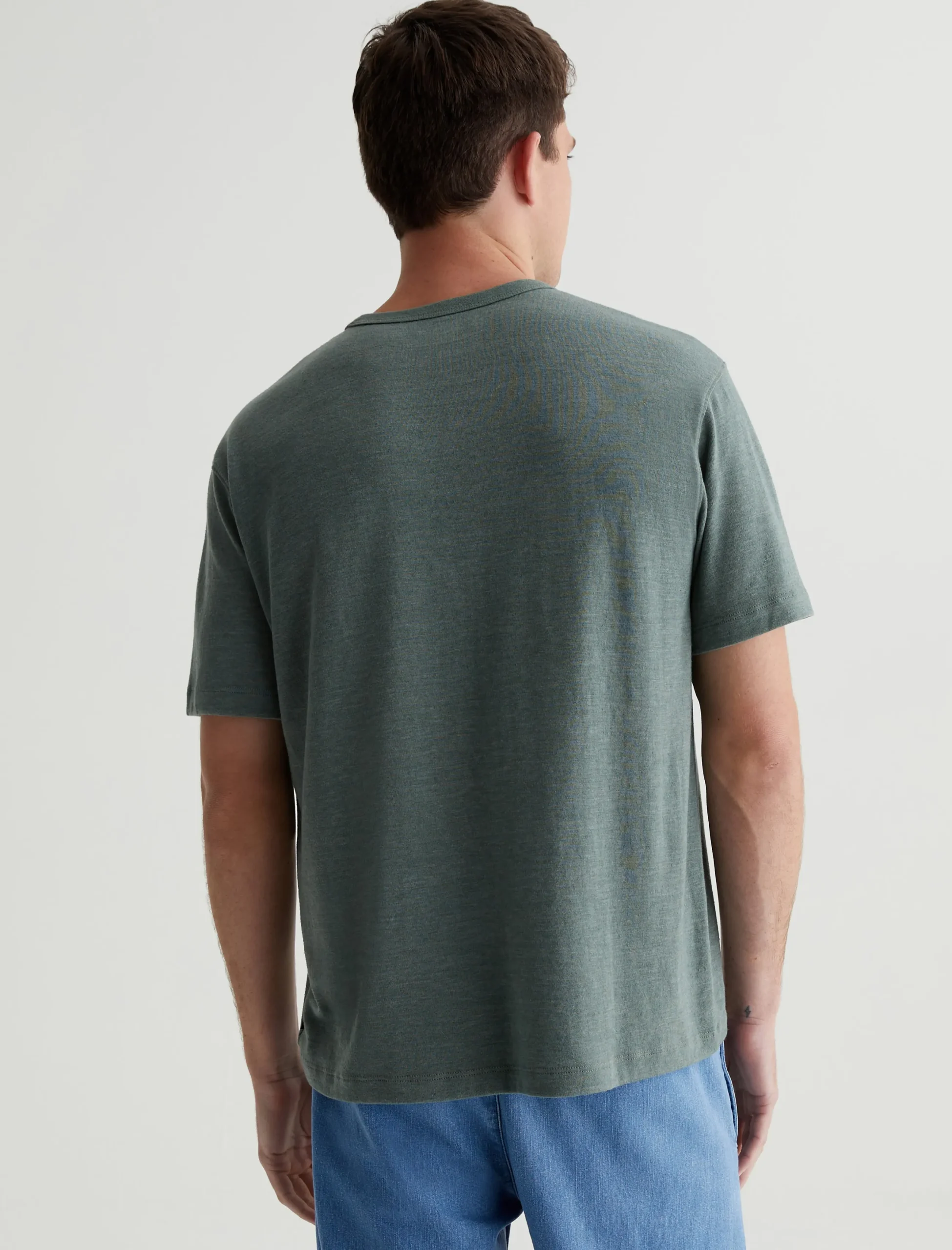 Our Wesley Crew is a relaxed short-sleeve men’s tee with drop-shoulder detailing and a wider hem for a more fashion forward fit. This crewneck T-shirt features cotton-blend Mélange Snow Jersey featuring a sage-green shade and a soft nep texture at the surface.