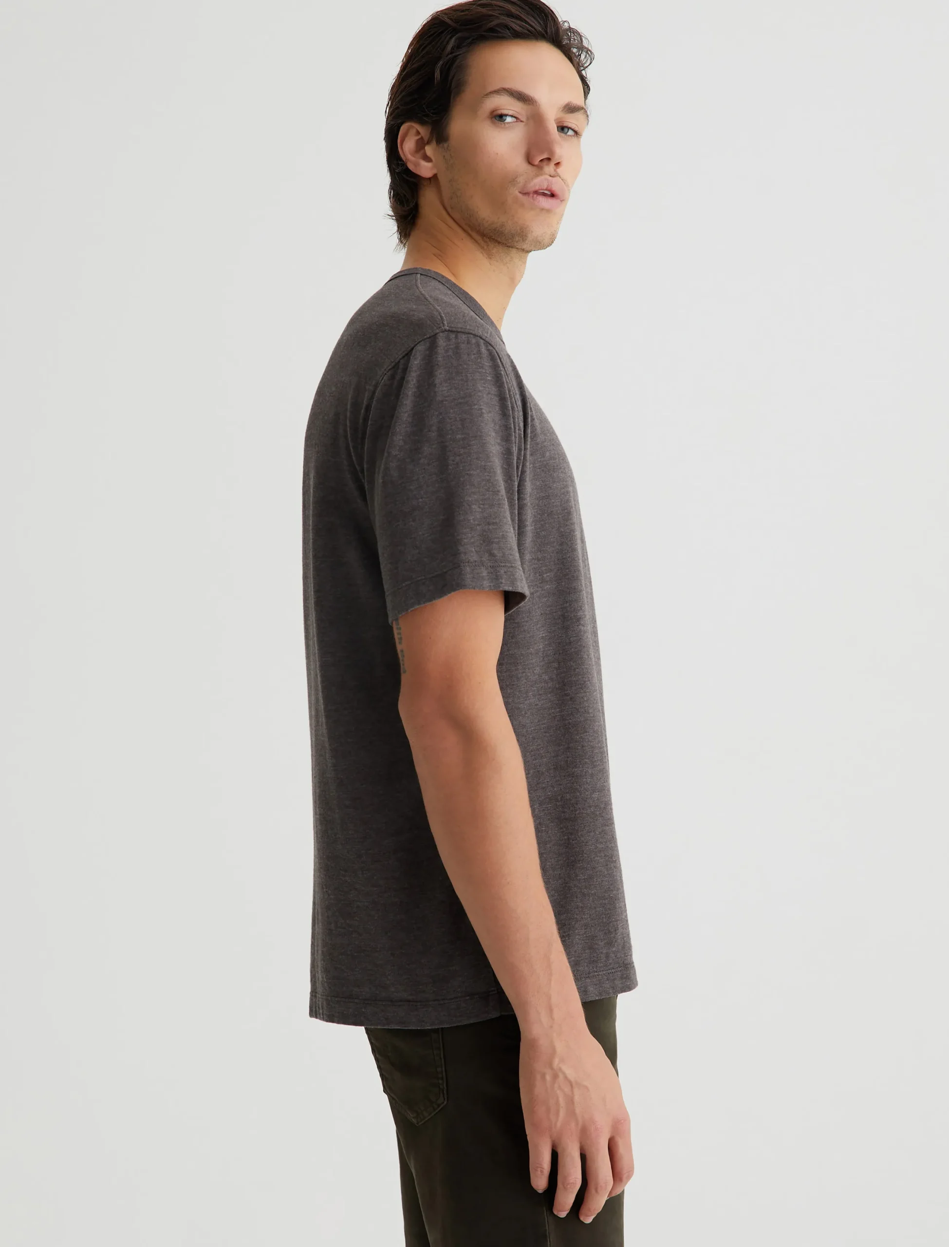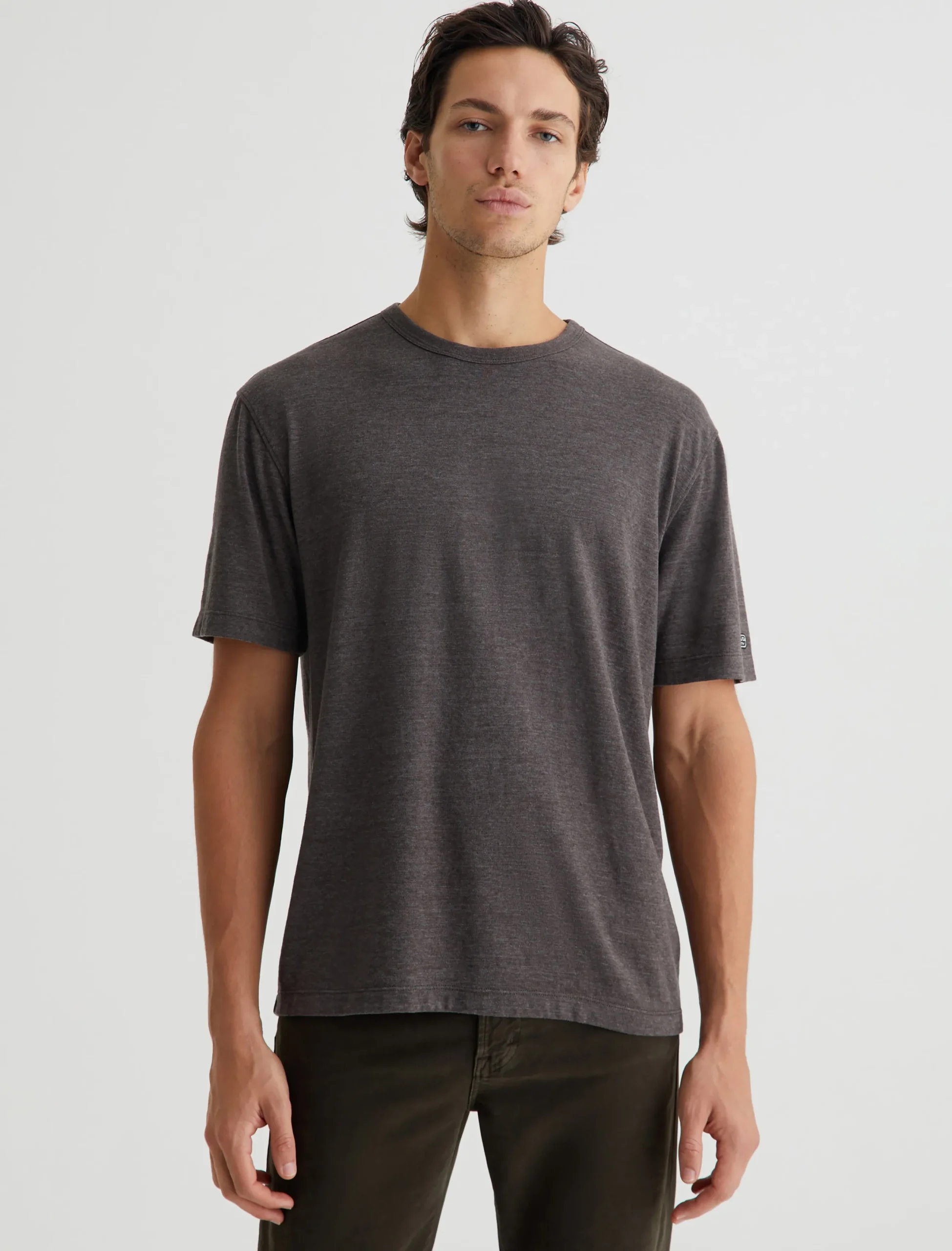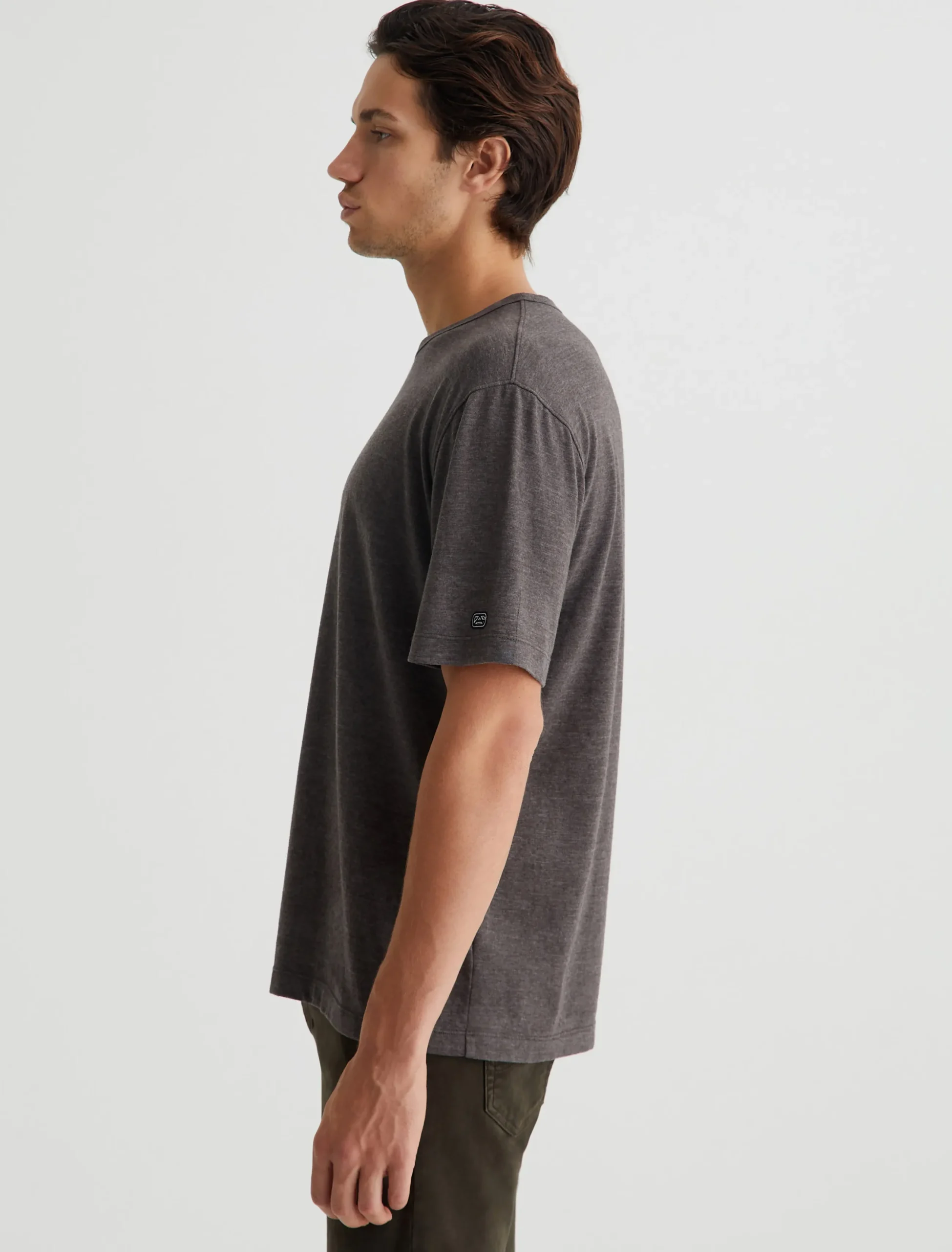 Our Wesley Crew is a relaxed short-sleeve men’s tee with drop-shoulder detailing and a wider hem for a more fashion forward fit. This T-shirt features cotton-blend Mélange Snow Jersey in off-white with a heathered appearance.
