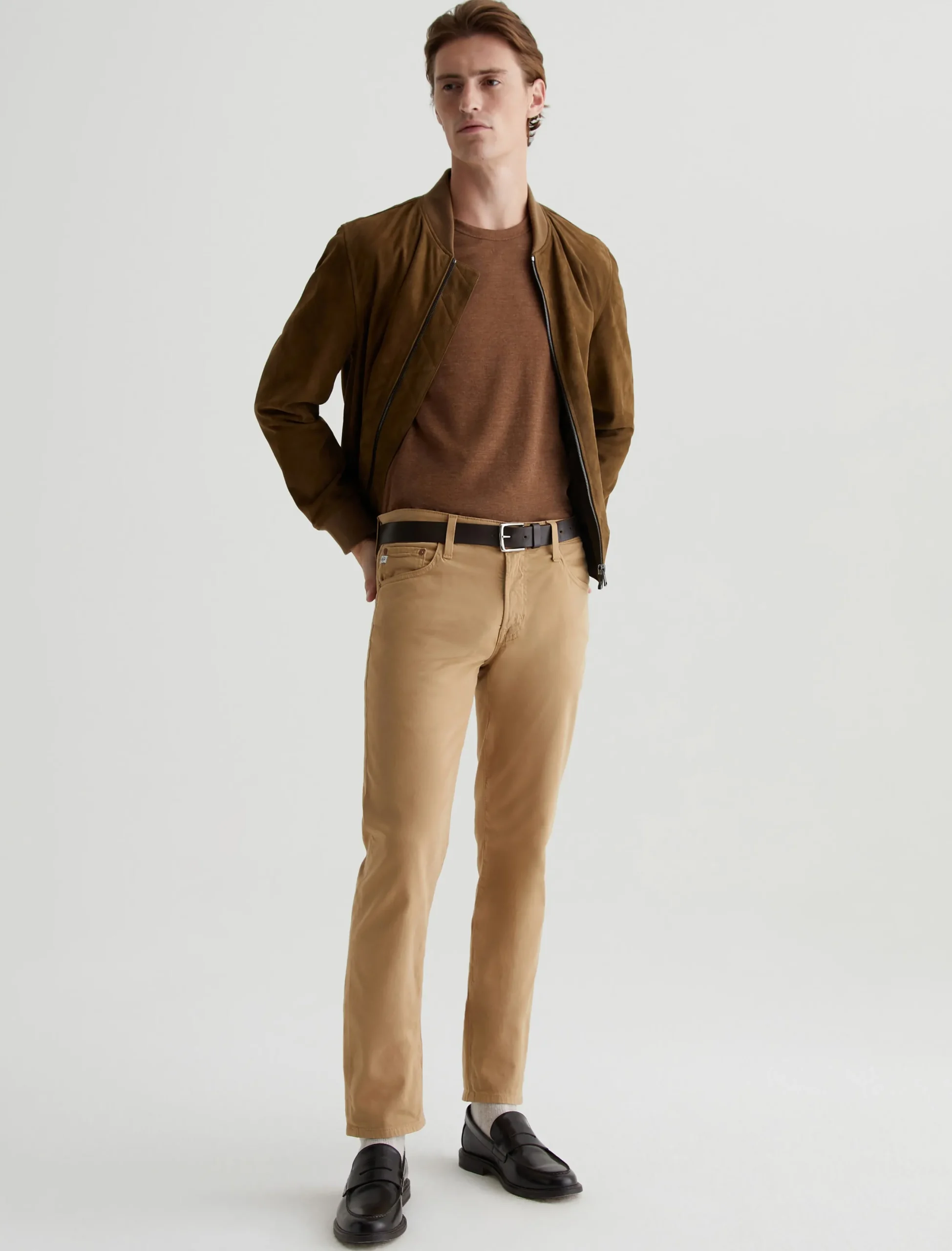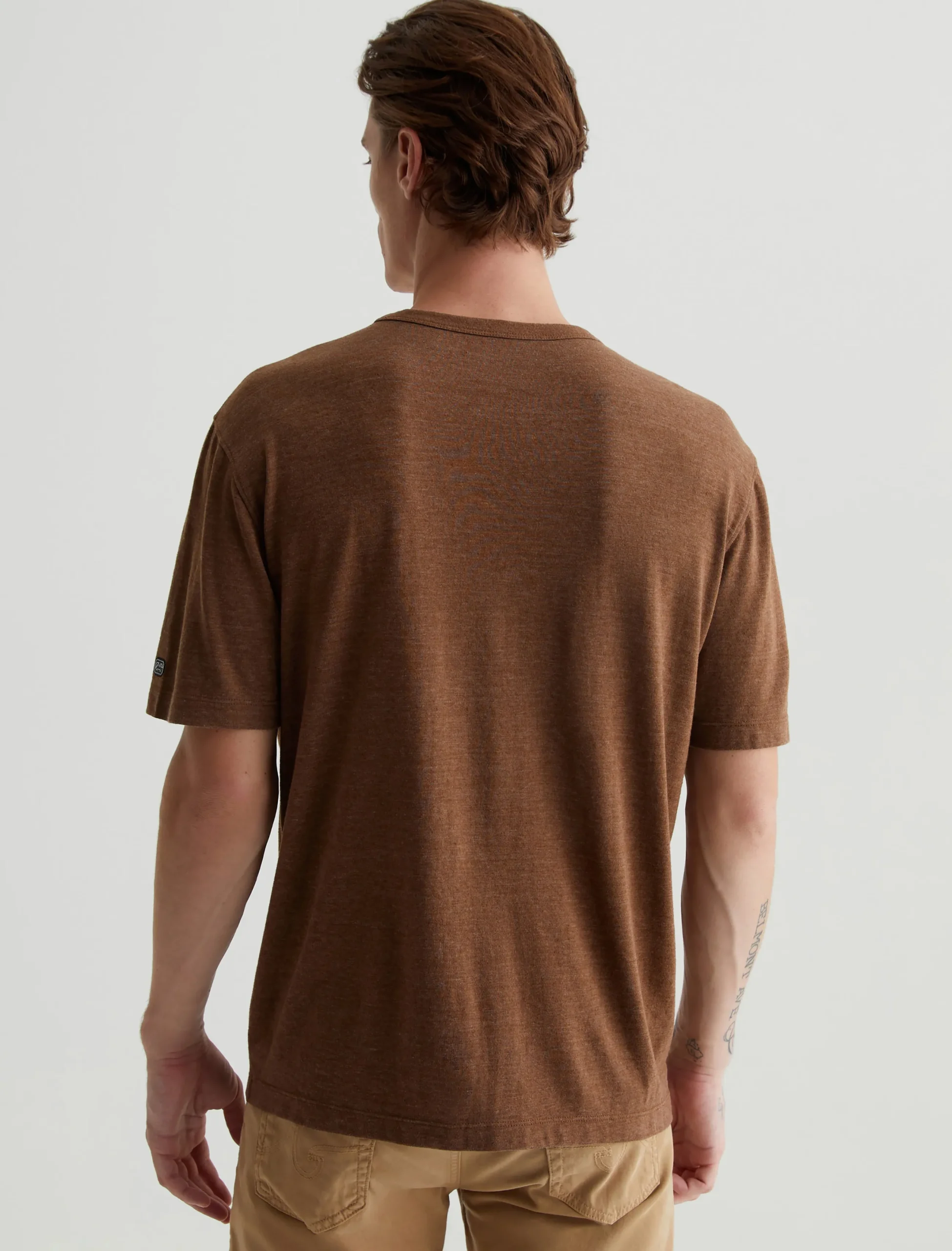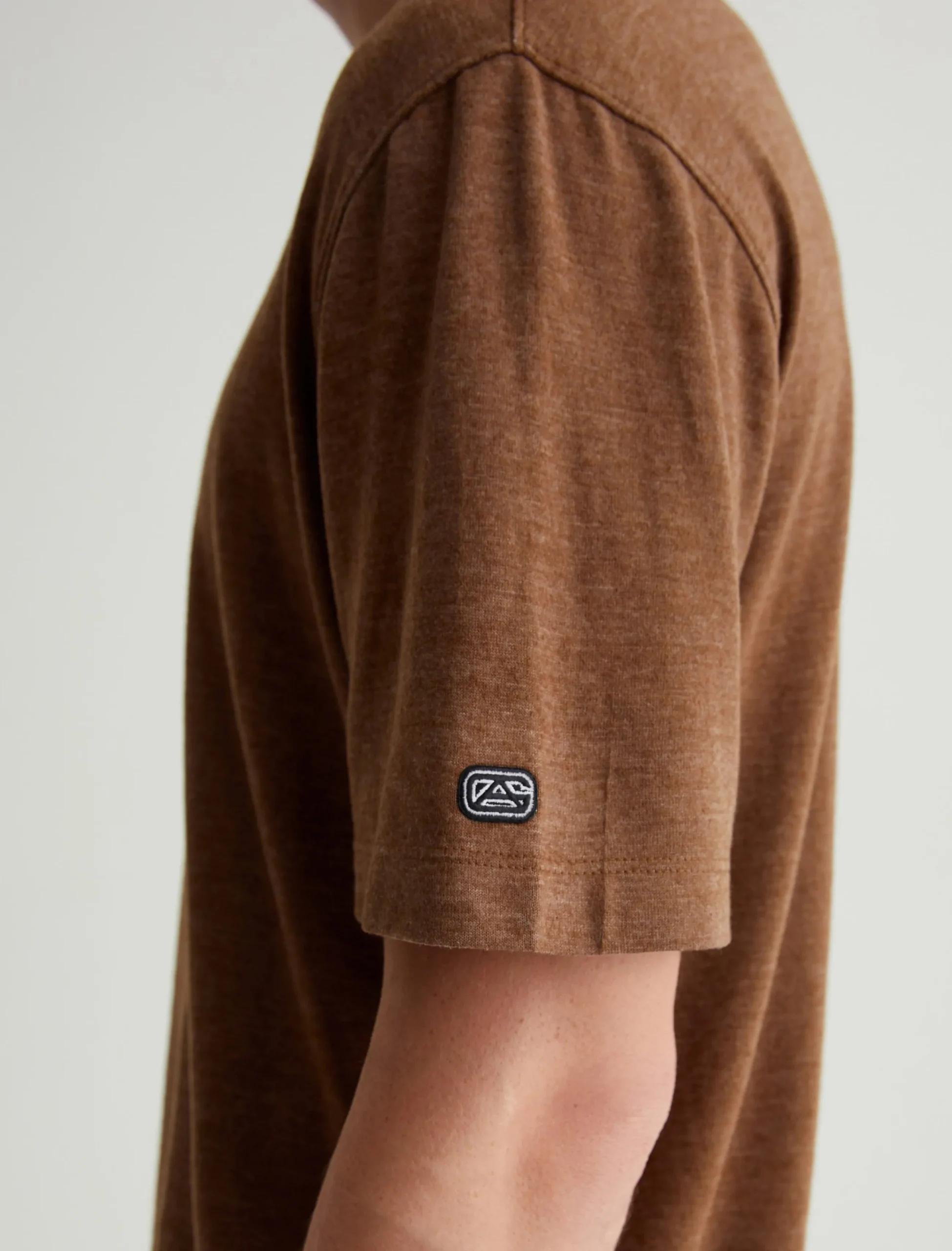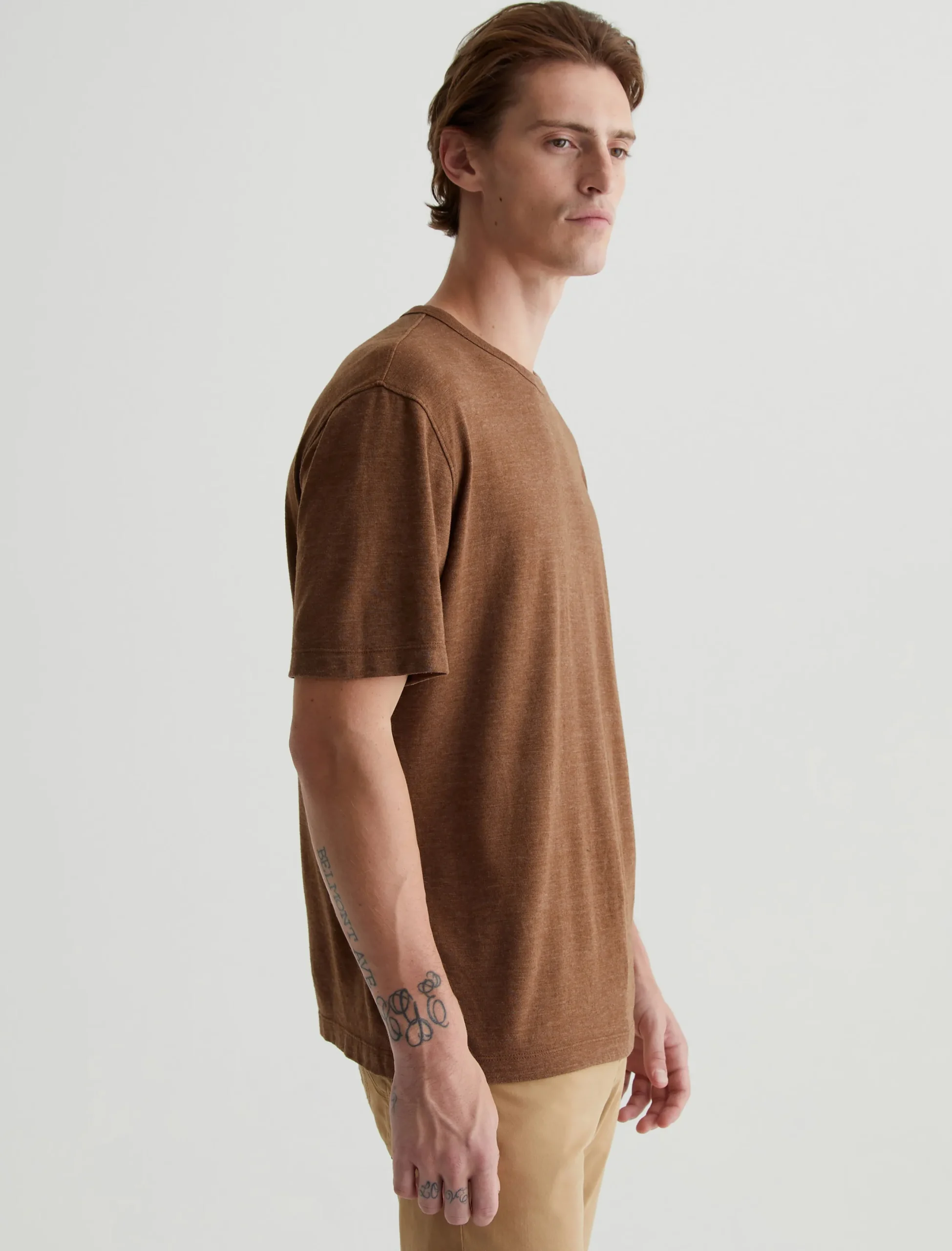 Our Wesley Crew is a relaxed short-sleeve men’s tee with drop-shoulder detailing and a wider hem for a more fashion forward fit. This T-shirt features cotton-blend Mélange Snow Jersey in a rich brown color with a heathered appearance.