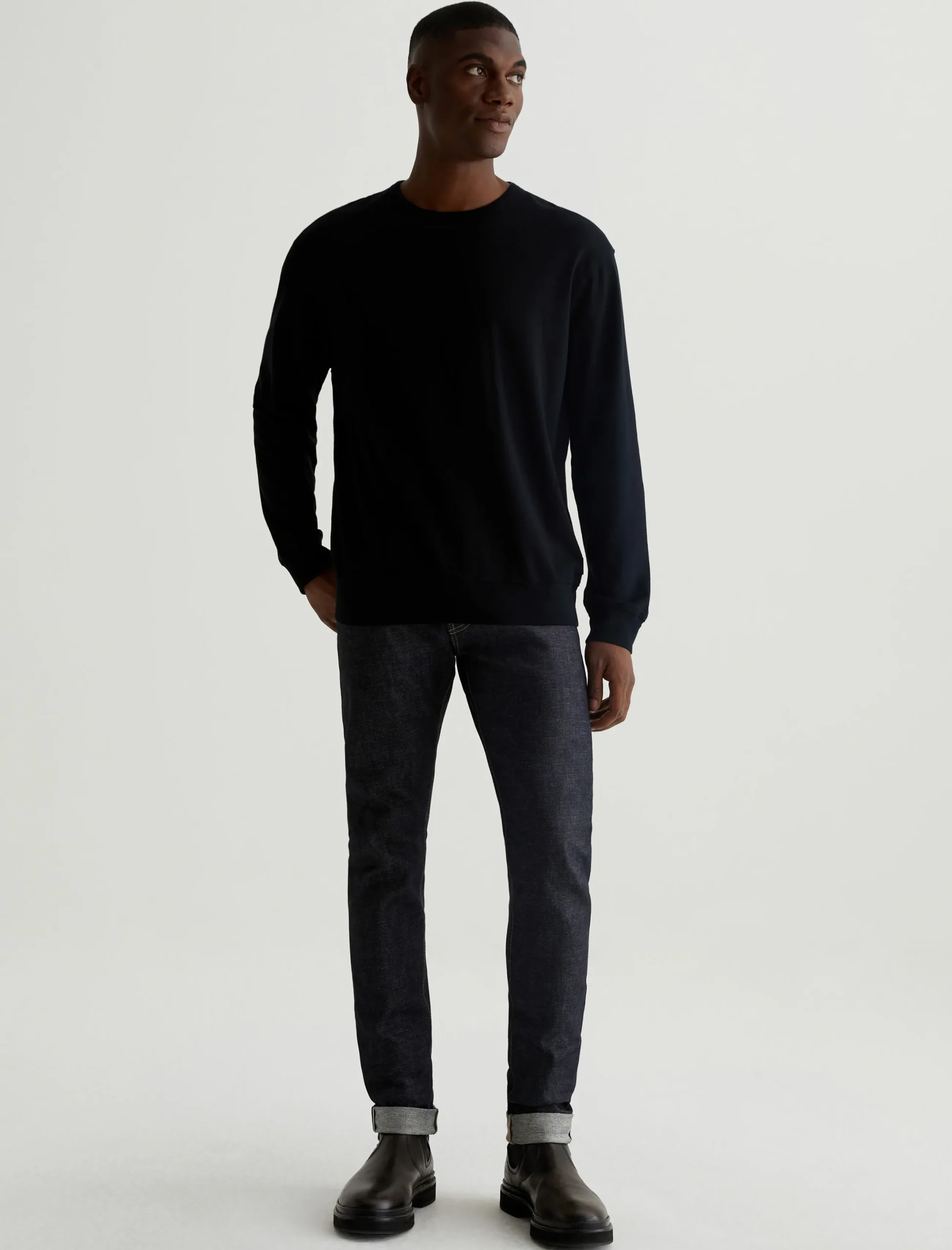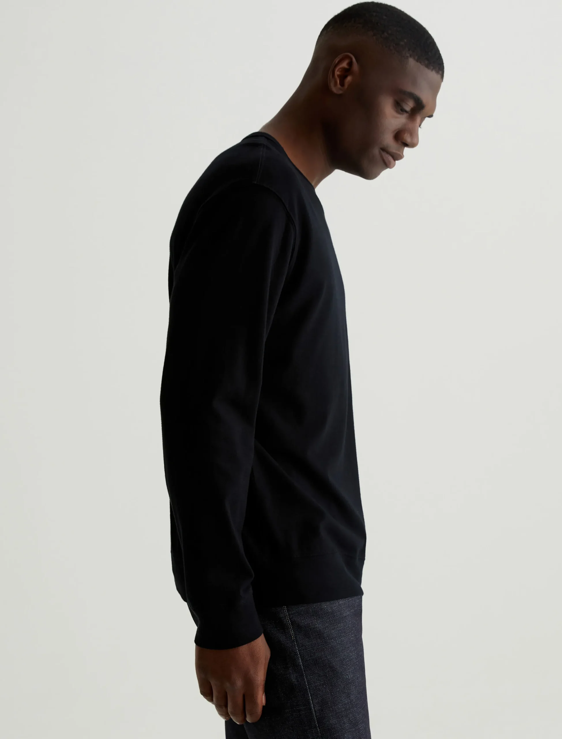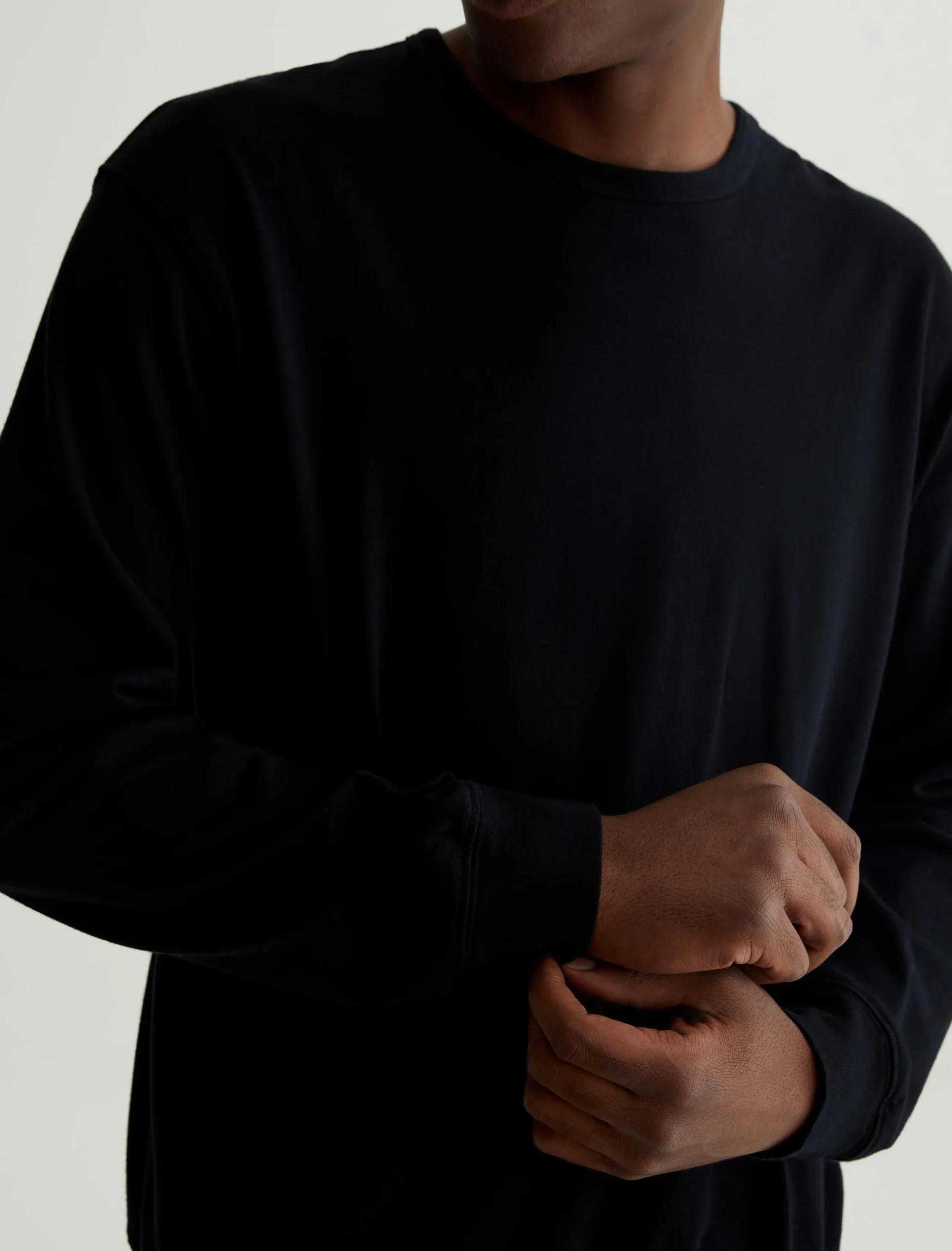 The Wesley Pullover in black is a new silhouette added to our Basic Essentials collection.Borrowing details from a traditional sweatshirt such as rib binding, cuffs, and bottom hem allowed us to create a lightweight pullover that feels classic, modern, and uniform. Our Jersey Knit offers a luxurious comfort that is unrivaled—knitted with both S-twist and Z-twist yarn to sustain longevity and stability, preventing unnecessary twisting and torquing. During the production process, the S-twist yarn is spun counter-clockwise creating a right-handed twill. The Z-twist yarn works in opposition, spinning clockwise for a left-handed twill. This opposition—when working together—yields a softer, more durable fabrication and gives strength to the yarn making it more difficult to pull apart. Designed in 100% Cotton.