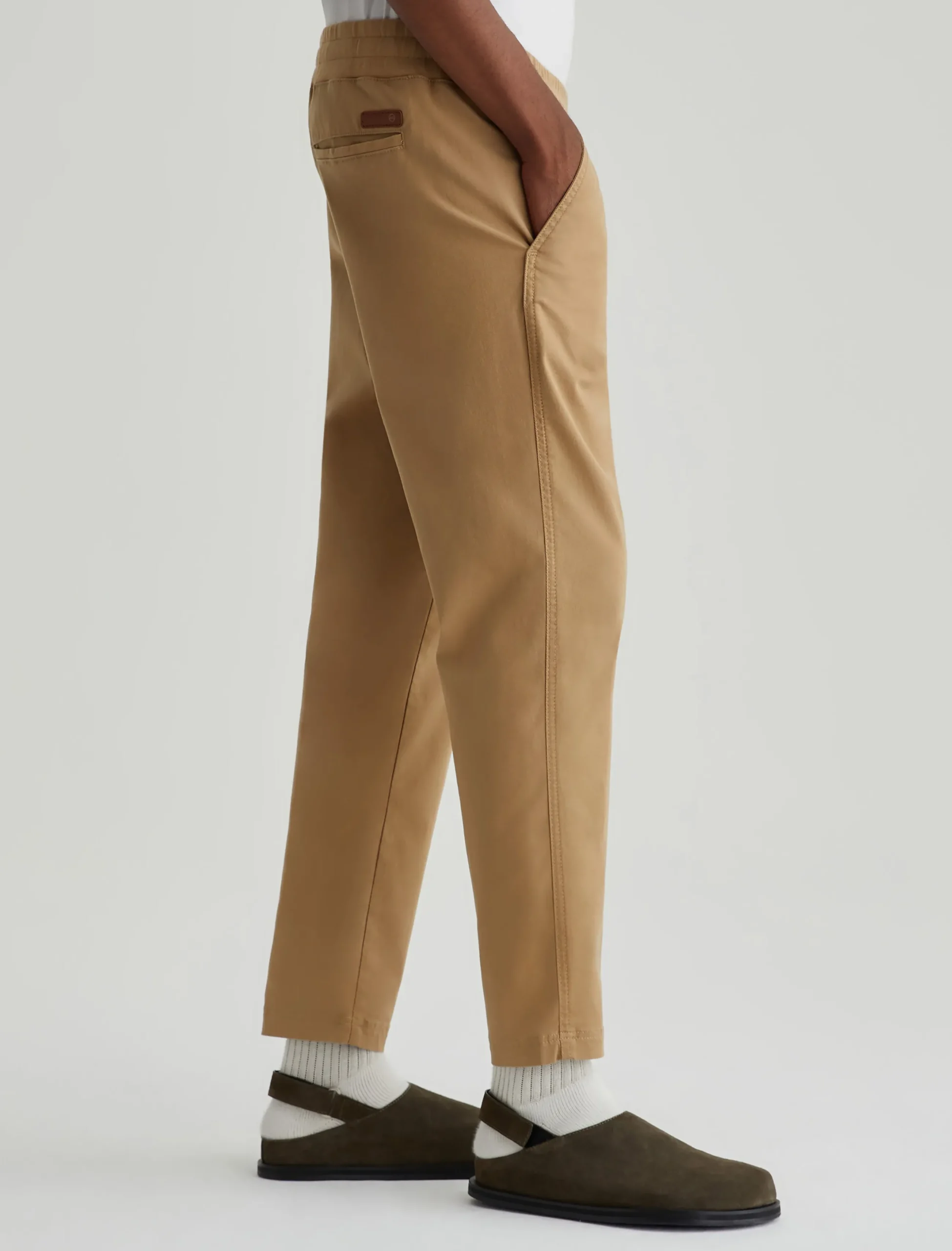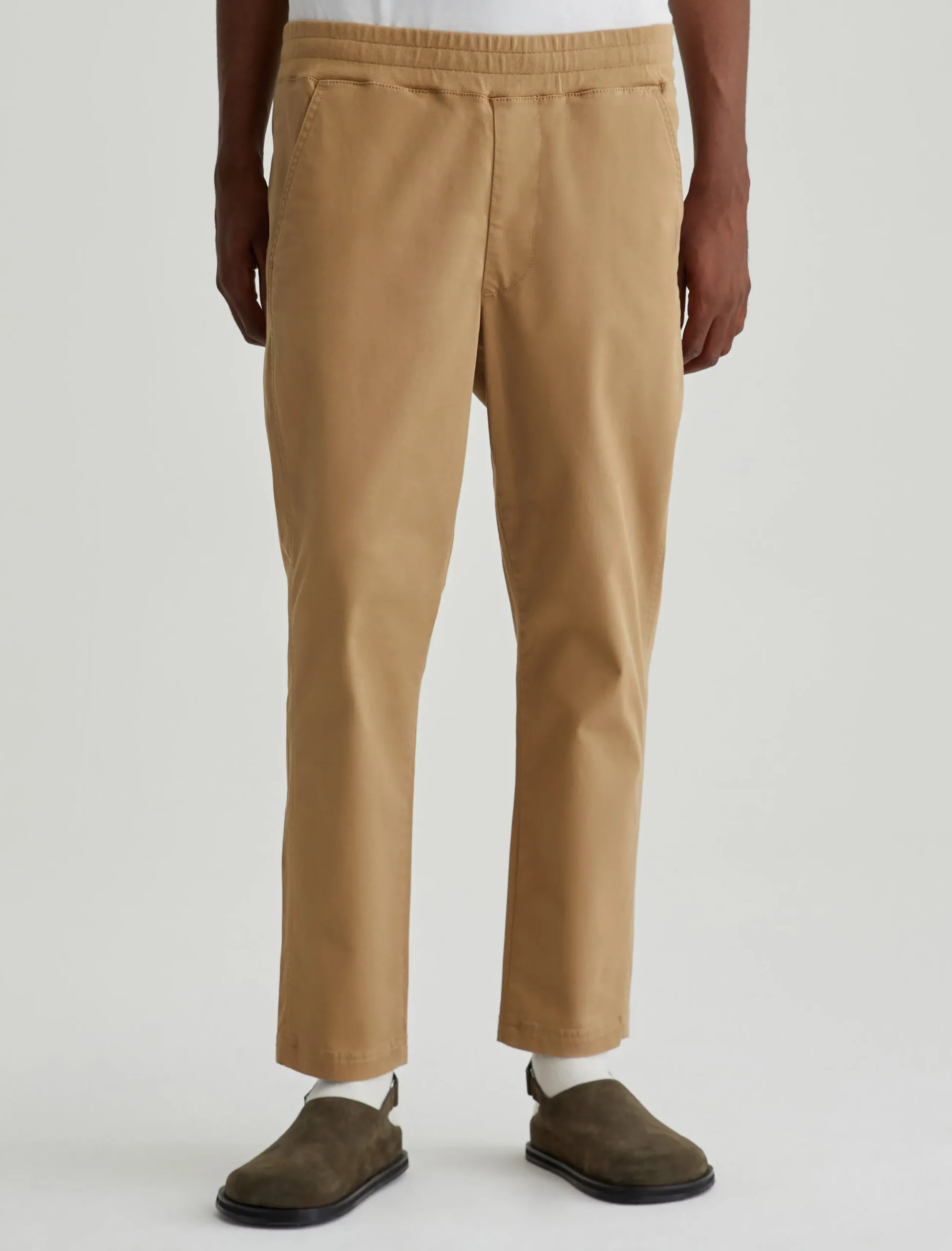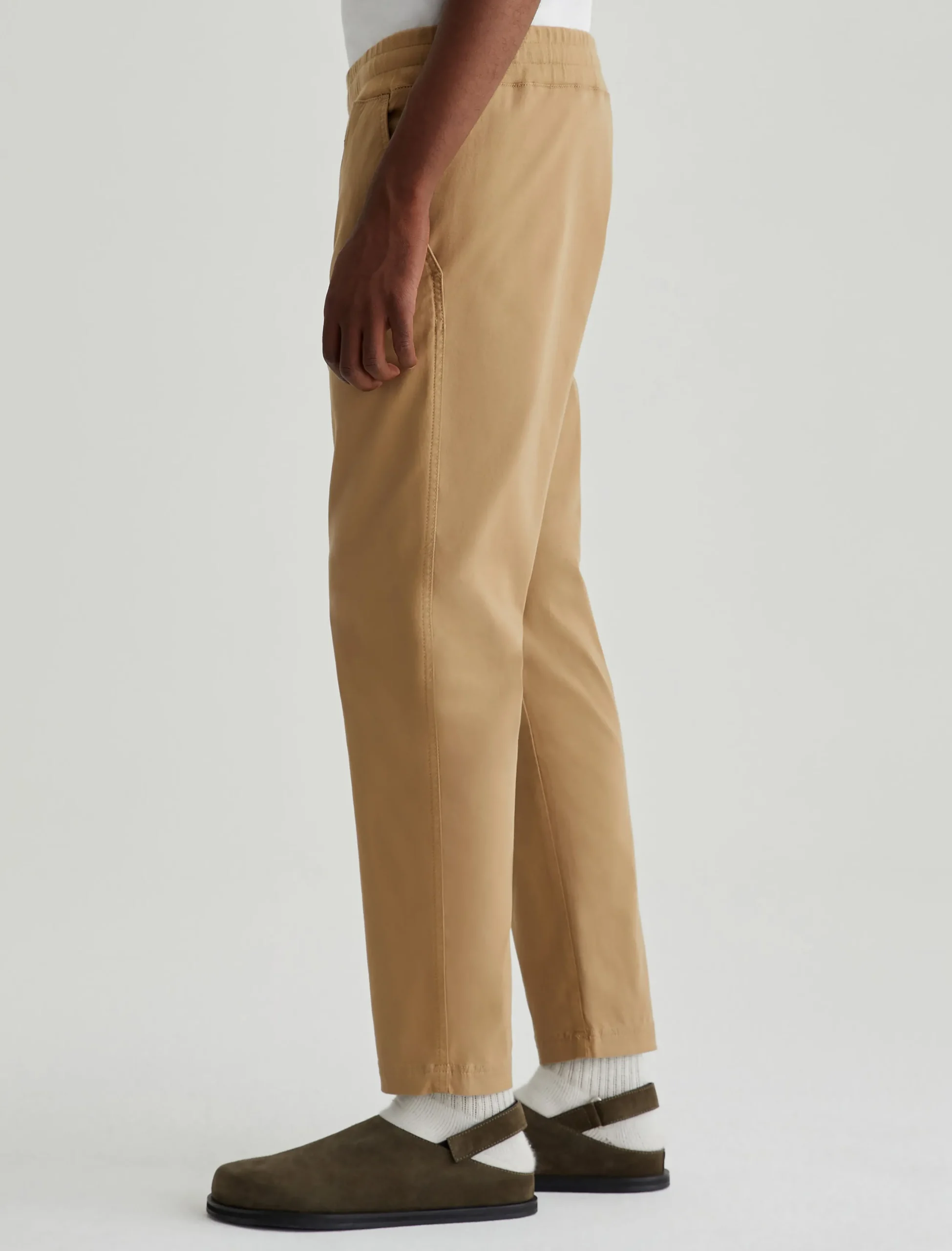 The Wyatt Sweatpant is a comfortable men’s jogger updated in a Sorrento Stretch Twill from Italy. Soft and lightweight, these tan pants are relaxed yet slim with an elasticized waist, interior drawstring, and tapered legs.