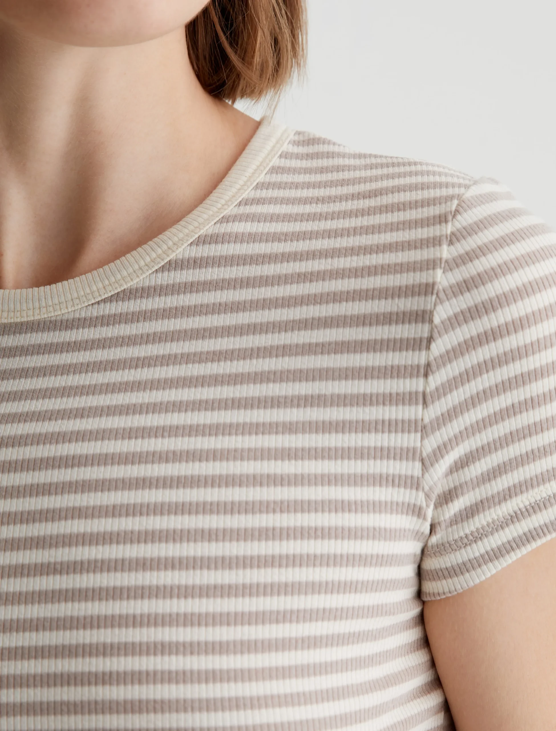The Agnes Crew is a slim-fit tee made from a soft, breathable rib knit with white and beige stripes. The short-sleeve style sits close to the body and has a white self-bound crew neckline for a clean finish.