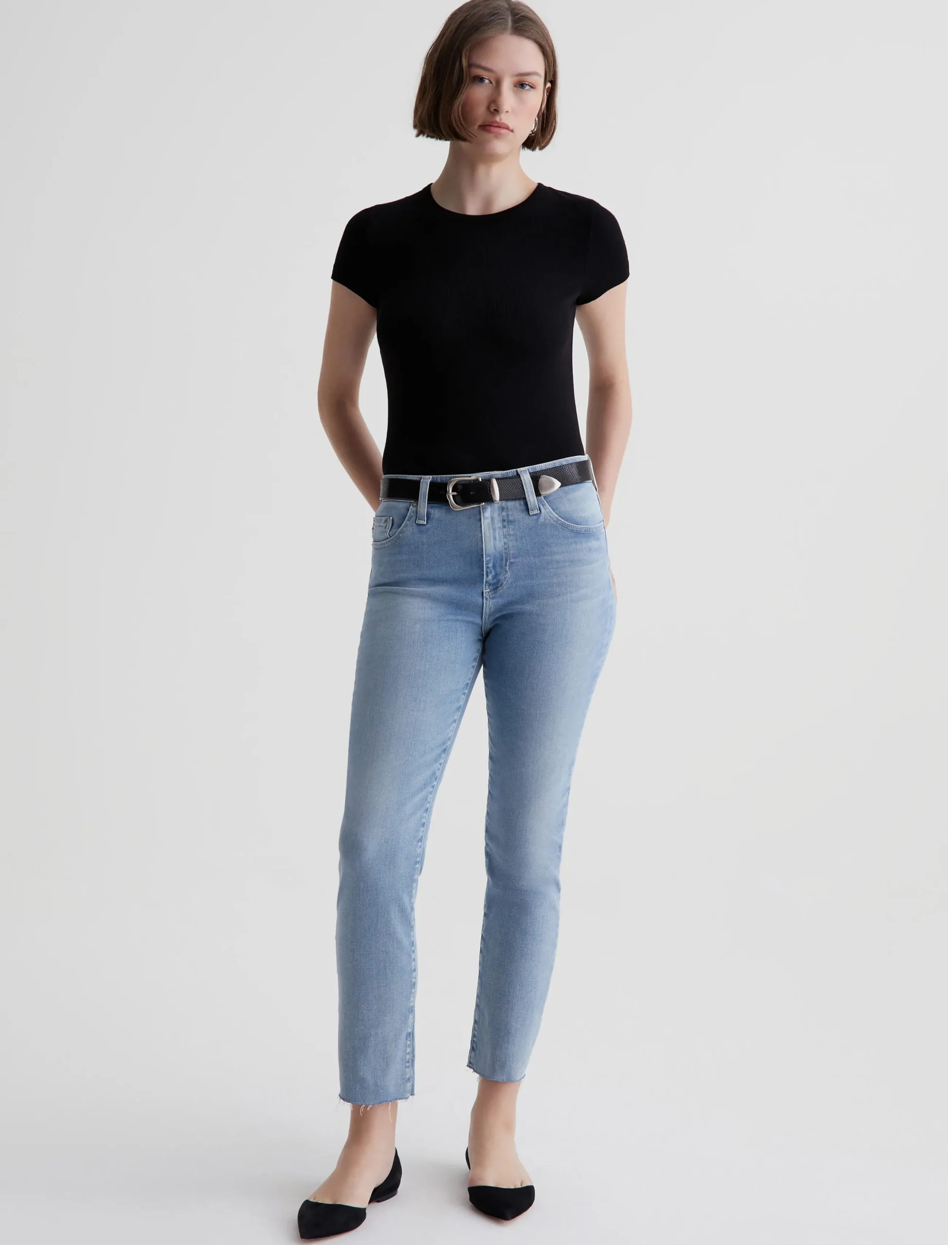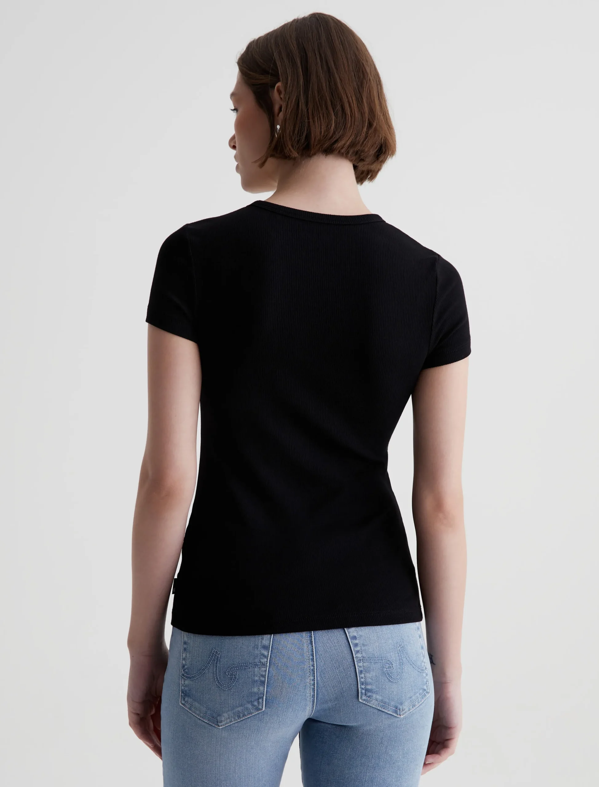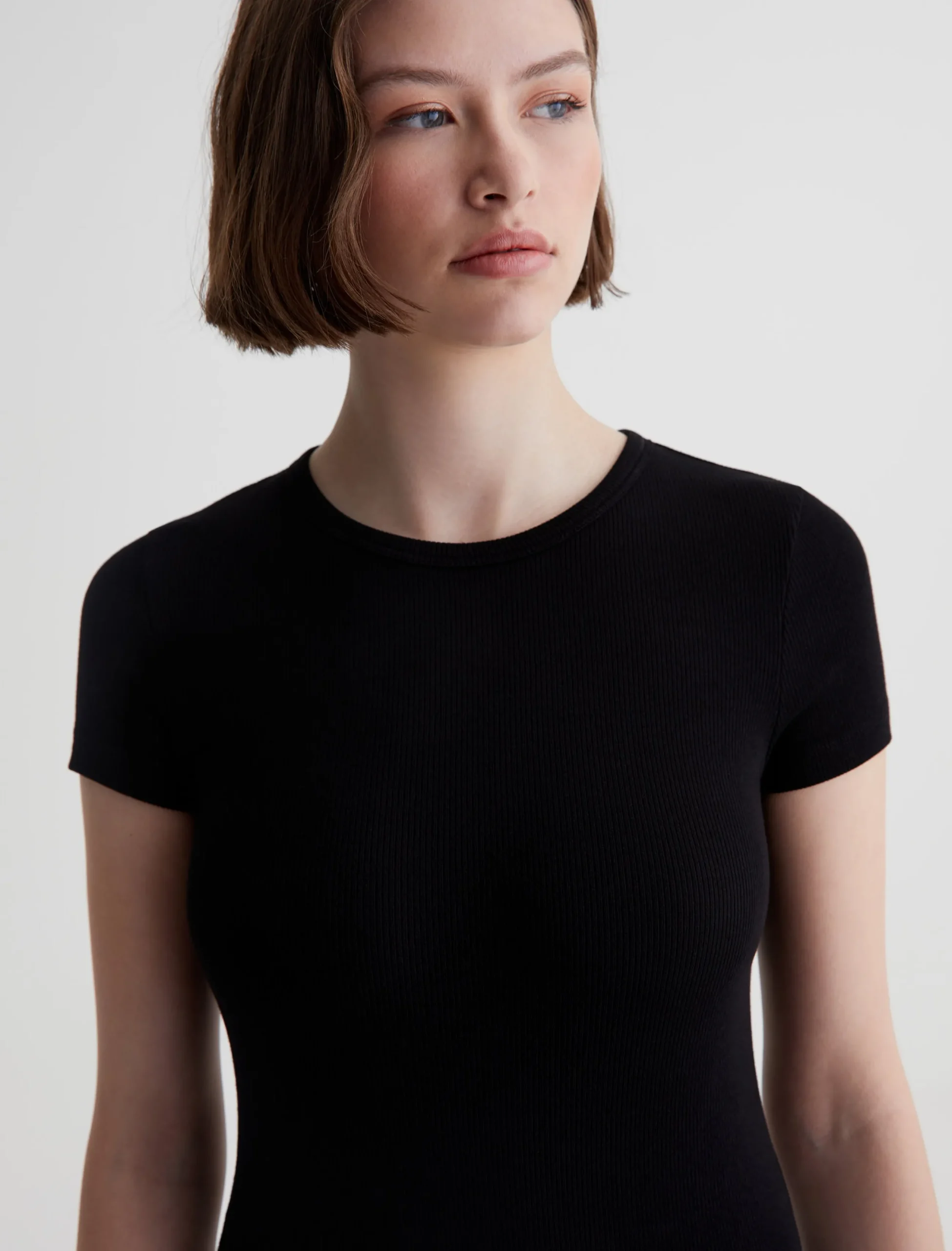 The Agnes Crew is a slim-fit tee made from a soft, breathable rib knit in black. The short-sleeve style sits close to the body and has a self-bound crew neckline for a clean finish.