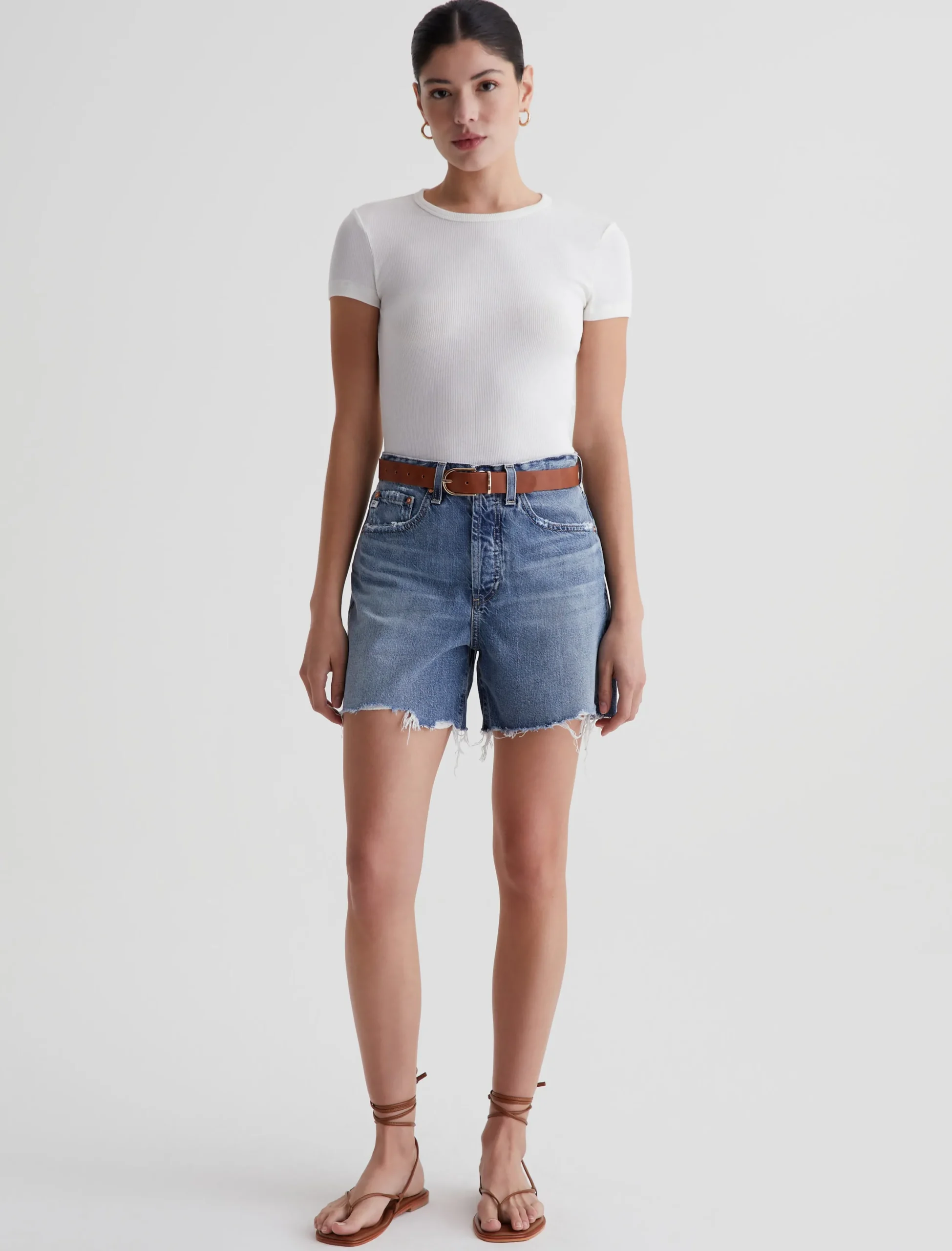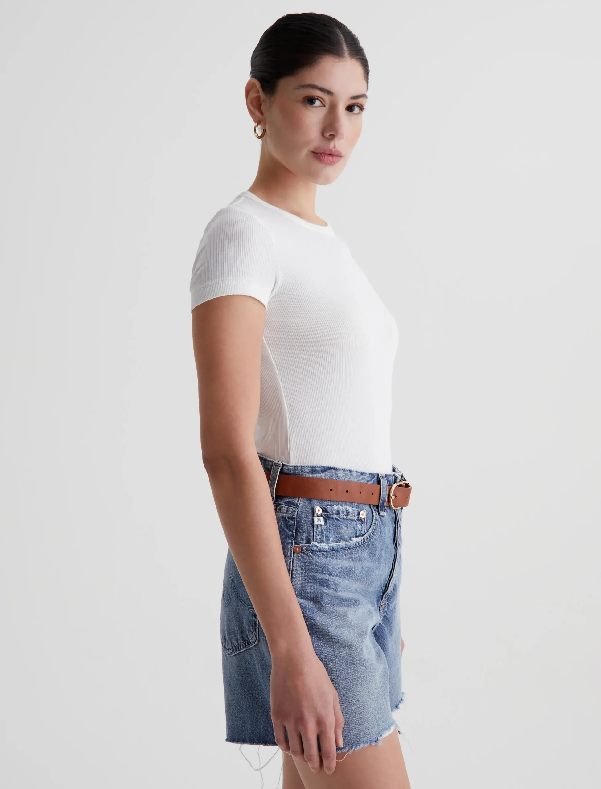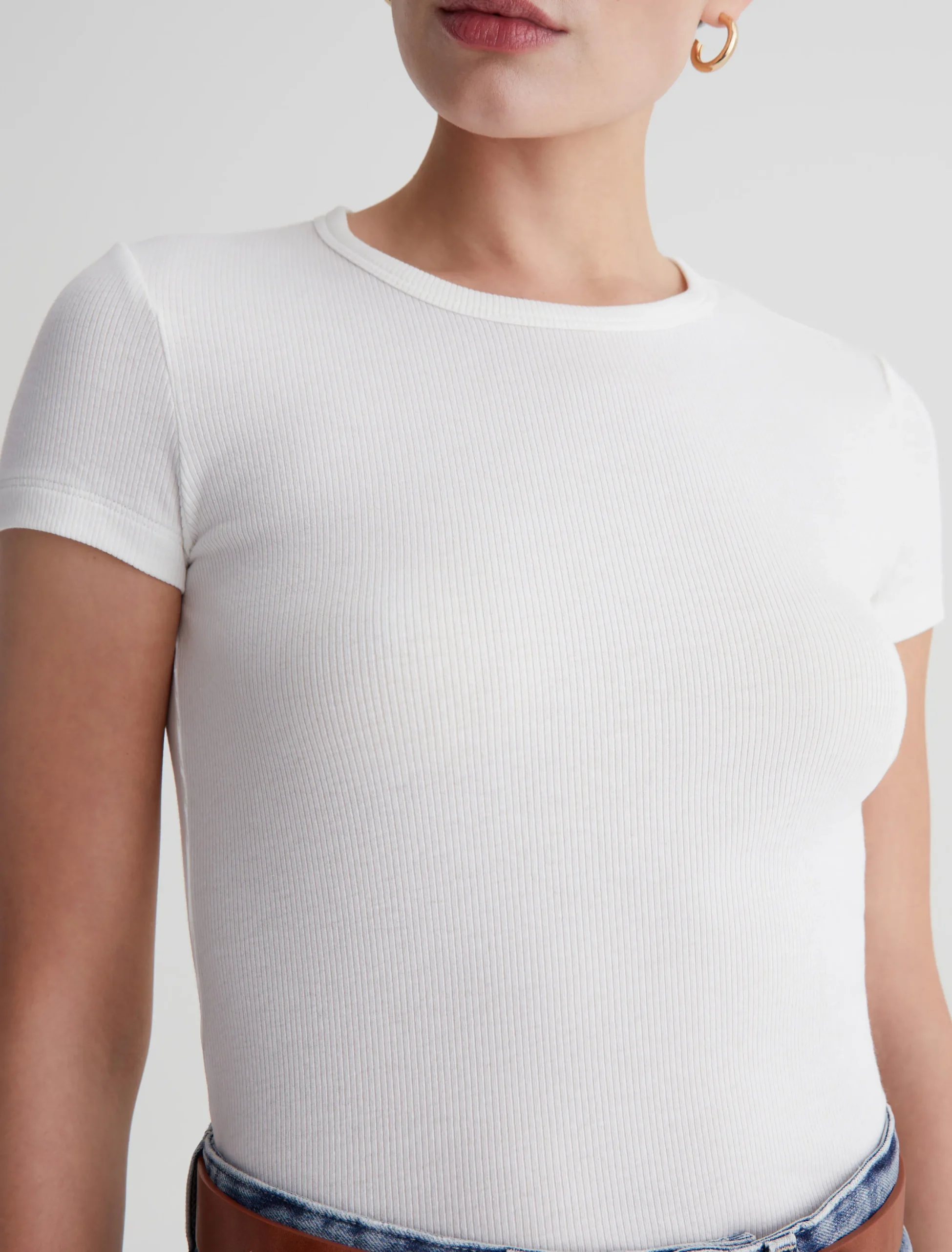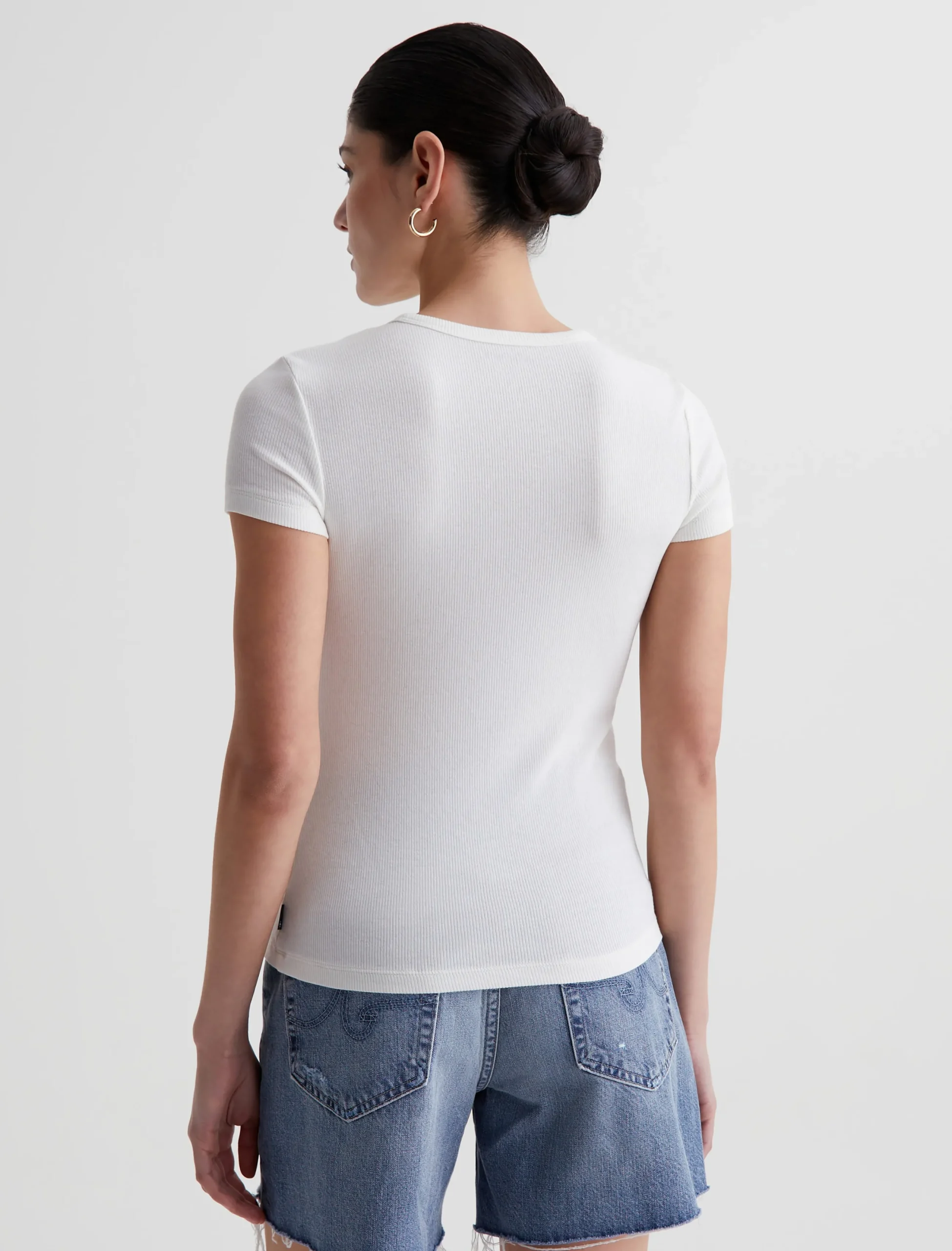 The Agnes Crew is a slim-fit tee made from a soft, breathable rib knit in white. The short-sleeve style sits close to the body and has a self-bound crew neckline for a clean finish.