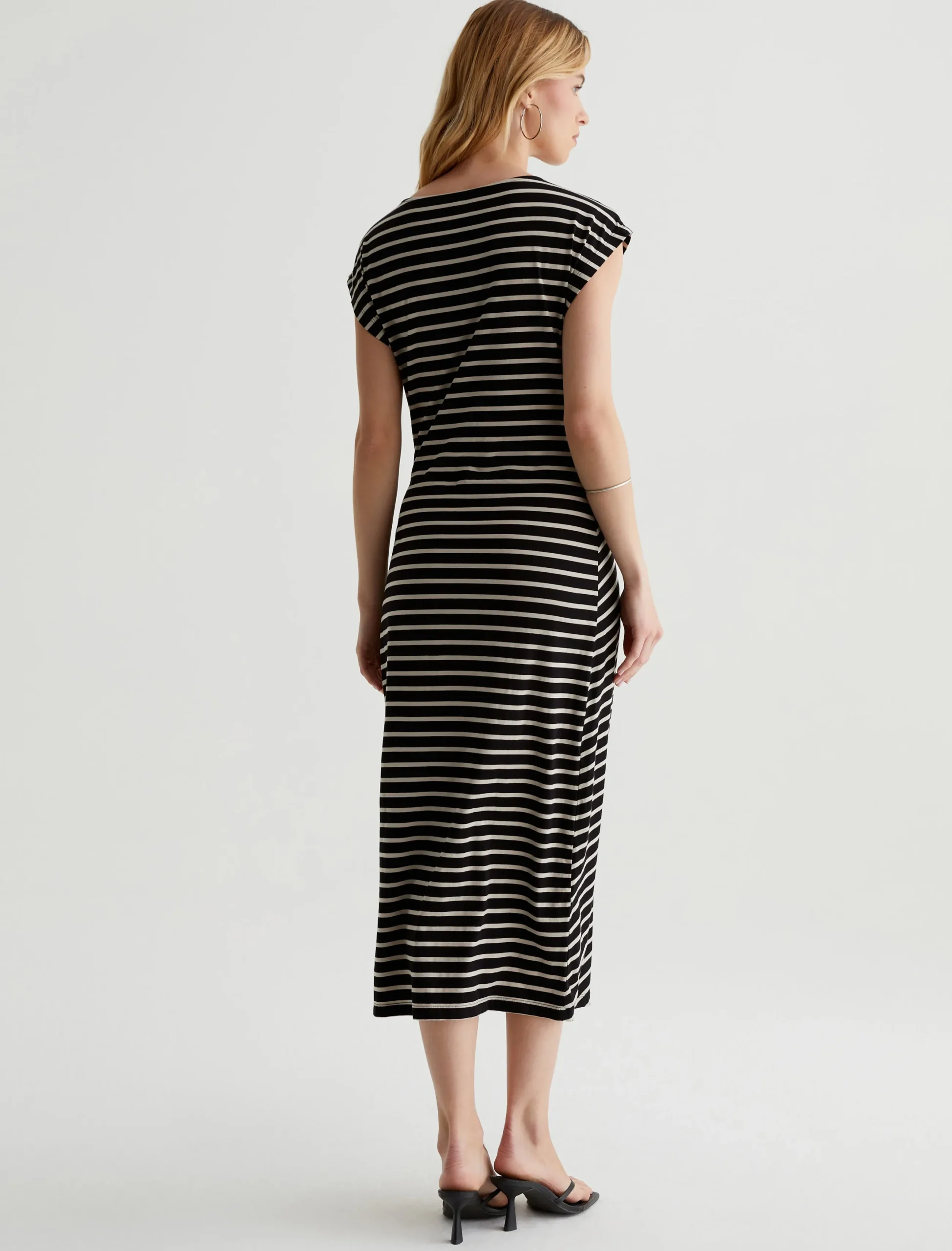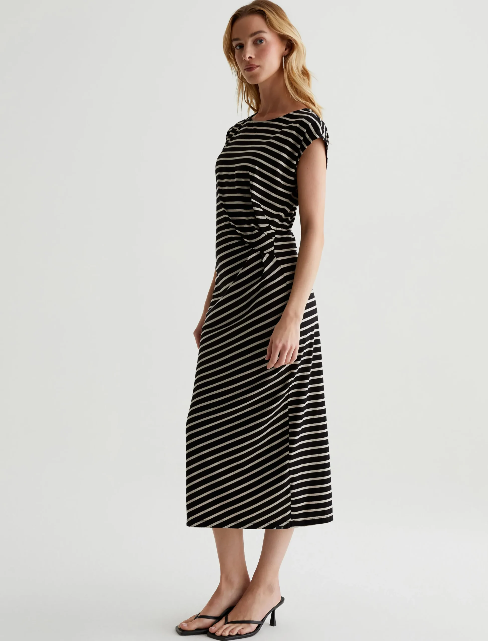 The Aja Dress wears effortlessly in stretch-blend cotton jersey with black and beige stripes. Soft and comfortable, this mid-length T-shirt dress has a feminine boat neck, short dolman sleeves, and pleat detailing at the side waist.