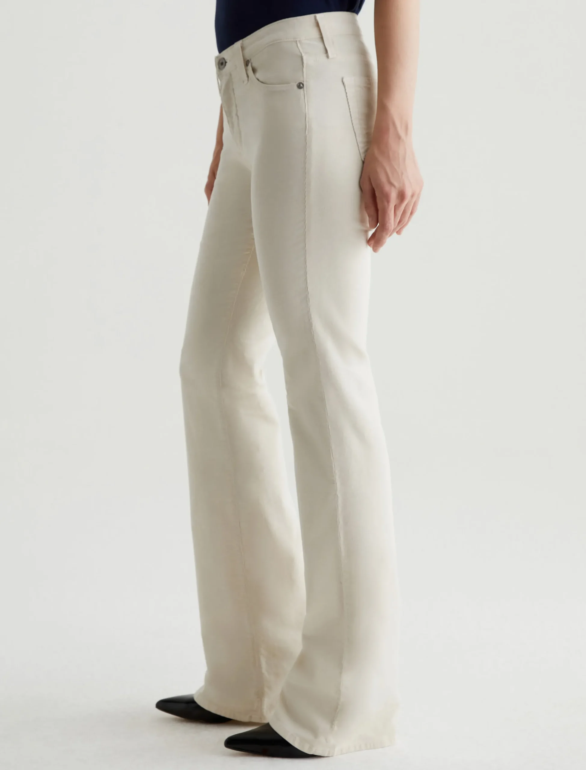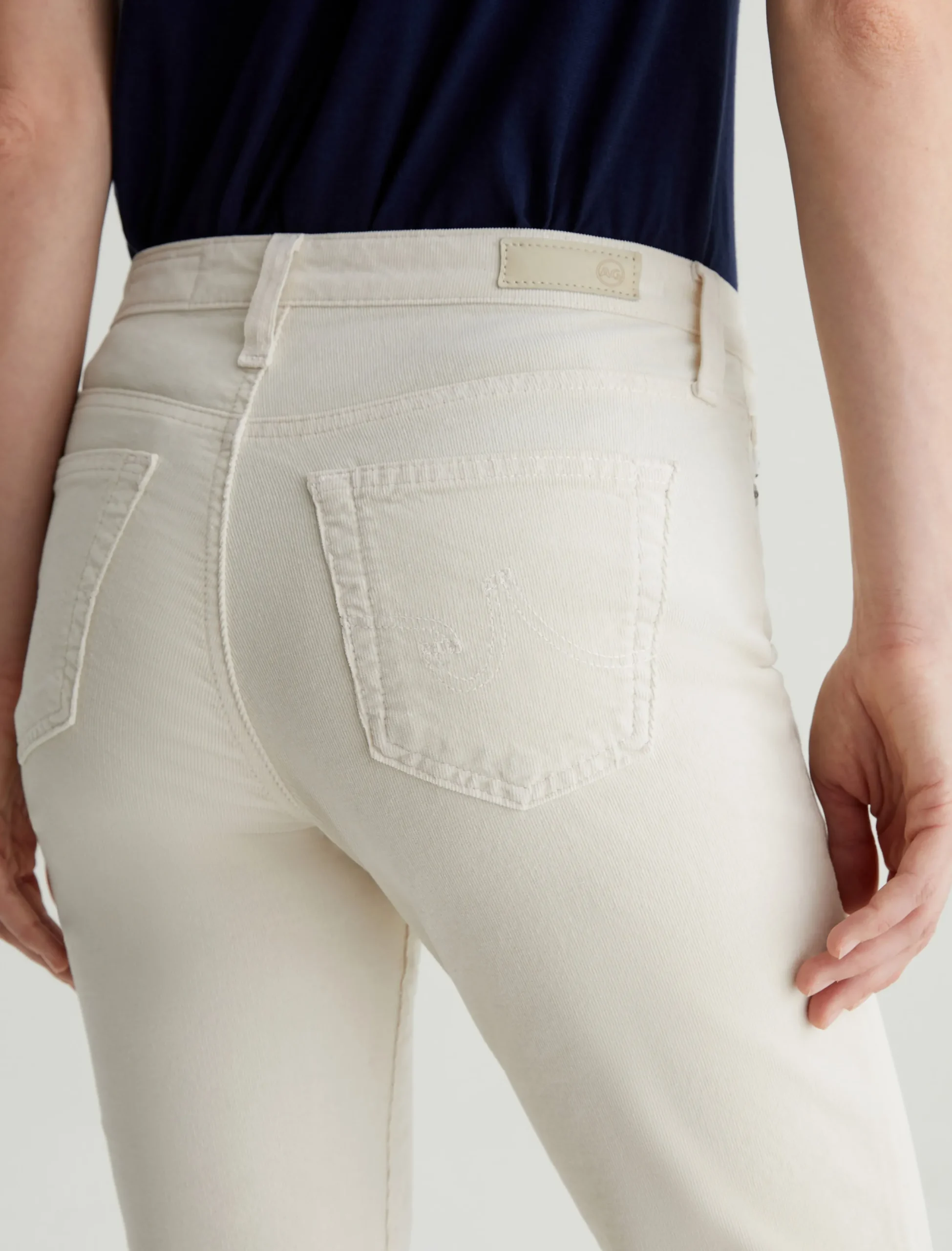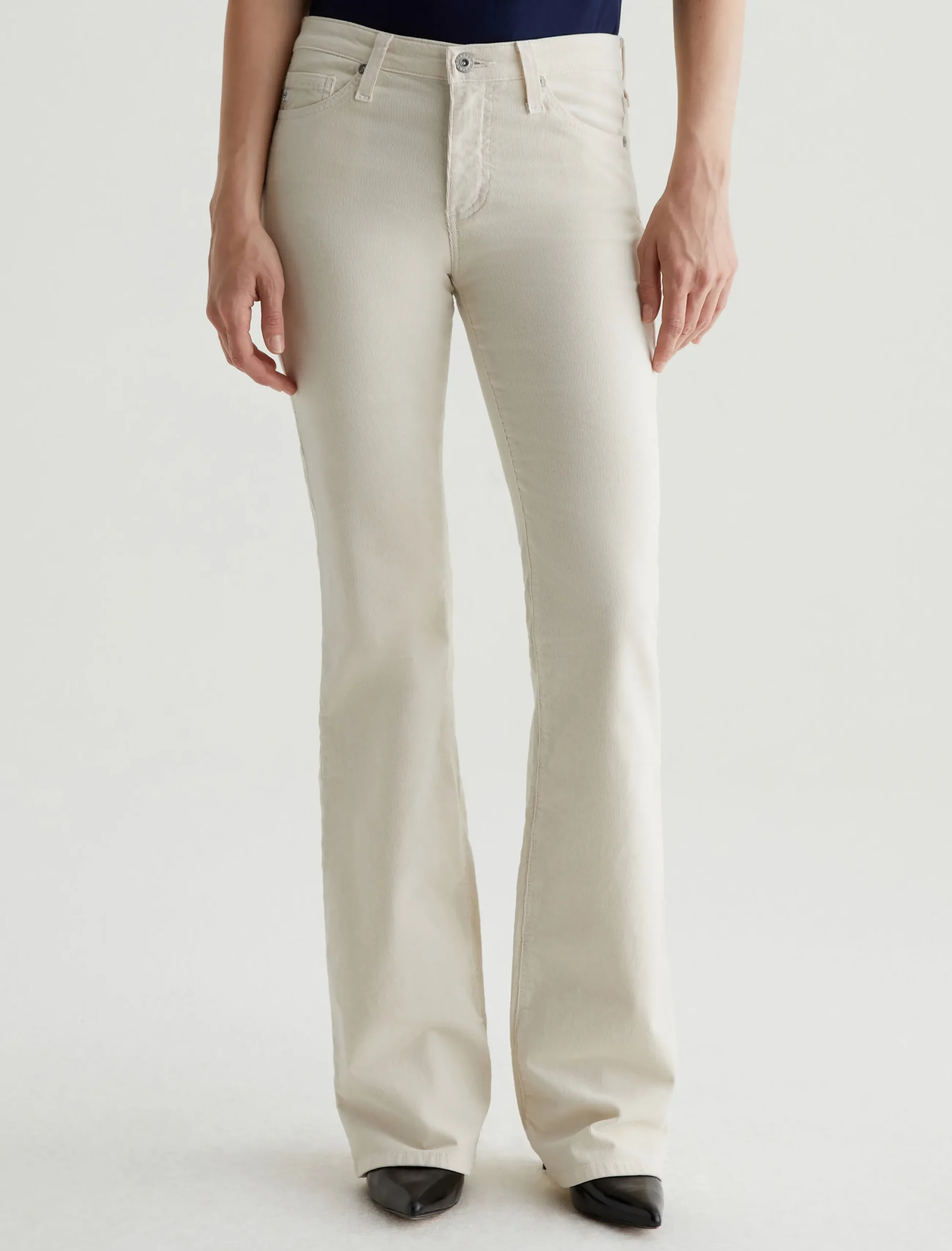 The Angel low-rise bootcut gets a plush update in 8.3 oz. Novel Stretch Mini Corduroy. Cut for a subtly flared silhouette, these corduroy bootcut pants have been sulfur-dyed for an off-white shade and feature a 1-year AG-ed™ finish for a naturally broken-in appearance.